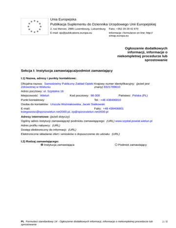 Unia Europejska Publikacja Suplementu do Dziennika Urzędowego Unii Europejskiej 2, rue Mercier, 2985 Luxembourg, Luksemburg Faks: +352 29 29 42 670 E-mail: [email protected] Informacje i formularze on-line: http:// simap.europa.eu Ogłoszenie dodatkowych informacji, informacje o niekompletnej procedurze lub sprostowanie Sekcja I: Instytucja zamawiająca/podmiot zamawiający I.1) Nazwa, adresy i punkty kontaktowe: Oficjalna nazwa: Samodzielny Publiczny Zakład Opieki Krajowy numer identyfikacyjny: (jeżeli jest Zdrowotnej w Wieluniu znany) 8321789610 Adres pocztowy: ul. Szpitalna 16 Miejscowość: Wieluń Kod pocztowy: 98-300 Punkt kontaktowy: _____ Państwo: Polska (PL) Tel.: +48 438406810 Osoba do kontaktów: Urszula Woźniakowska, Jacek Siatkowski E-mail: Faks: +48 438406801 [email protected], [email protected] Adresy internetowe: (jeżeli dotyczy) Ogólny adres instytucji zamawiającej/ podmiotu zamawiającego: (URL) www.szpital.powiat.wielun.pl Adres profilu nabywcy: (URL) _____ Dostęp elektroniczny do informacji: (URL) _____ Elektroniczne składanie ofert i wniosków o dopuszczenie do udziału: (URL) _____ I.2) Rodzaj zamawiającego: Instytucja zamawiająca Podmiot zamawiający PL Formularz standardowy 14 - Ogłoszenie dodatkowych informacji, informacje o niekompletnej procedurze lub sprostowanie 1/5 Sekcja II: Przedmiot zamówienia II.1.1) Nazwa nadana zamówieniu: Przetarg nieograniczony na udzielenie kredytu bankowego dla SPZOZ w Wieluniu w wysokości 20.000.000,00 z przeznaczeniem na spłatę zobowiązań oraz na spłatę kredytów poręczonych przez Powiat w Wieluniu. SPZOZ OiZP/3 /38/380-382 / 37 / 2013 II.1.2) Krótki opis zamówienia lub zakupu: (podano w pierwotnym ogłoszeniu) PRZETARG NIEOGRANICZONY NA UDZIELENIE KREDYTU BANKOWEGO DLA SPZOZ W WIELUNIU W WYSOKOŚCI 20.000.000,00 ZŁ Z PRZEZNACZENIEM NA SPŁATĘ DOTYCHCZASOWYCH KREDYTÓW PORĘCZONYCH PRZEZ POWIAT W WIELUNIU WEDŁUG STANU NA 30.11.2013R. W KWOCIE 14.572.393, 23 ZŁ . ORAZ SPŁATĘ ZOBOWIĄZAŃ WYMAGALNYCH WOBEC DOSTAWCÓW TOWARÓW I USŁUG – W KWOCIE 5.427.606,77 ZŁ 1. udzielenie kredytu na spłatę zobowiązań. 2. Istotne wymagania dotyczące przedmiotu zamówienia: a. Waluta kredytu PLN. b. Kwota kredytu 20 000 000,00 zł PLN c. Okres kredytowania: 216 miesięcy od dnia uruchomienia kredytu. d. Spłata kapitału w ratach miesięcznych płatnych ostatniego dnia każdego miesiąca kalendarzowego, według poniższego harmonogramu: Rata 1 do 31.12.2013r. rata 92.592,59 Raty 2 do13 do 31.12.2014r. spłata kapitału 500.000,00 raty po 41.666,66 Raty 14 do 25 do 31.12.2015r spłata kapitału 500.000,00 raty po 41.666,66 Raty 26 do 37 do 31.12.2016r spłata kapitału 500.000,00 raty po 41.666,66 Raty 38 do 49 do 31.12.2017r spłata kapitału 500.000,00 raty po 41.666,66 Raty 50 do 61 do 31.12.2018r spłata kapitału 500.000,00 raty po 41.666,66 Raty 62 do 73 do 31.12.2019r spłata kapitału 500.000,00 raty po 41.666,66 Raty 74 do 85 do 31.12.2020 r spłata kapitału 500.000,00 raty po 41.666,66 Raty 86 do 97 do 31.12.2021r spłata kapitału 1.000.000,00 raty po 83.333,33 Raty 98 do 109 do 31.12.2022r spłata kapitału 1.300,000,00 raty po 108.333,37 Raty 110 do 121 do 31.12.2023r spłata kapitału 1.600.000,00 raty po 133.333,37 Raty 122 do 133 do 31.12.2024r spłata kapitału 1.600.000,00 raty po 133.333,37 Raty 134do 145 do 31.12.2025r spłata kapitału 1.600.000,00 raty po 133.333,37 Raty 146 do 157 do 31.12.2026r spłata kapitału 1.600.000,00 raty po 133.333,37 Raty 158 do 169 do 31.12.2027r spłata kapitału 1.600.000,00 raty po 133.333,37 Raty 170 do 181 do 31.12.2028r spłata kapitału 1.600.000,00 raty po 133.333,37 Raty 182 do 193 do 31.12.2029r spłata kapitału 1.500.000,00 raty po 125.000,00 Raty 194 do 205 do 31.12.2030r spłata kapitału 1.500.000,00 raty po 125.000,00 Raty 206 do 215 do 31.10.2031r spłata kapitału 1.507.407,41 raty po 137.037,03 Rata 216 do 30.11.2031r spłata kapitału 137.037,11 rata 137.037,11 e. Spłata odsetek w okresach miesięcznych, płatnych ostatniego dnia każdego miesiąca kalendarzowego , pierwsza splata do 31.12.2013r. f. Sposób naliczania odsetek – w oparciu o zmienną stawkę WIBOR 1M powiększoną o stałą marżę Wykonawcy i rzeczywistą ilością dni w każdym roku kredytowania (365/ 366) g. Brak opłat za niewykorzystanie całości kwoty kredytu. h. Brak opłat od jakiejkolwiek zmiany umowy. PL Formularz standardowy 14 - Ogłoszenie dodatkowych informacji, informacje o niekompletnej procedurze lub sprostowanie 2/5 i. Brak opłat za przelew środków na rachunek Zamawiającego. j. Termin uruchomienia kredytu – w terminie do 3 dni od podpisania umowy. k. Sposób uruchomienia kredytu – na rachunek bankowy Zamawiającego. l. Kapitalizacja odsetek nie dopuszczalna. m. Możliwość wcześniejszej spłaty kredytu bez opłat. n. W sytuacji wcześniejszej spłaty kredytu odsetki liczone będą do dnia spłaty kredytu, a nie do końca trwania umowy. o. W przypadku, gdy termin spłaty rat kredytu czy odsetek przypadnie na dzień wolny od pracy Zamawiającego (sobota, niedziela dni ustawowo wolne od pracy), Zamawiający dokona wymaganej spłaty w ostatnim roboczym dniu miesiąca. p. Zabezpieczeniem spłaty kredytu będzie poręczenie Podmiotu tworzącego - Powiat w Wieluniu q. Koszty obsługi kredytu będą stanowić: Oprocentowanie kredytu – zmienne, odsetki będą naliczane w stosunku rocznym według zmiennej stopy procentowej WIBOR 1M i stałej w trakcie trwania umowy marży. r. W celu porównania złożonych ofert należy przyjąć stopę procentową w oparciu o WIBOR 1M z dnia 08.10.2013 r. powiększoną o stałą marżę. Tak obliczoną stopę oprocentowania należy przyjąć jako stałą w całym okresie kredytowania. Spłata kapitału, odsetek, marży , począwszy od 31.12.2013 roku do 30.11.2031 roku. s. Zamawiający dopuszcza możliwość otwarcia rachunku bankowego w Banku, który wygra przetarg. Na rachunek bankowy wpływałyby środki finansow