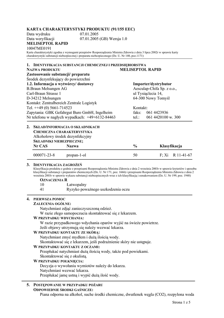 KARTA CHARAKTERYSTYKI PRODUKTU (91/155 EEC) Data wydruku 07.01.2005 Data weryfikacji 07.01.2005 (GB) Wersja 1.0 MELISEPTOL RAPID 10047ME0191 Karta charakterystyki zgodna z wymogami przepisów Rozporządzenia Ministra Zdrowia z dnia 3 lipca 2002r w sprawie karty charakterystyki substancji niebezpiecznej i preparatu niebezpiecznego (Dz. U. Nr 140, poz.1171) 1. IDENTYFIKACJA SUBSTANCJI CHEMICZNEJ I PRZEDSIĘBIORSTWA NAZWA PRODUKTU MELISEPTOL RAPID Zastosowanie substancji/ preparatu Środek dezynfekujący do powierzchni 1.2. Informacja o wytwórcy/ dostawcy Importer/dystrybutor B.Braun Melsungen AG Aesculap-Chifa Sp. z o.o., Carl-Braun Strasse 1 ul Tysiąclecia 14, D-34212 Melsungen 64-300 Nowy Tomyśl Kontakt: Zentralbereich Zentrale Logistyk Tel. ++49 (0) 5661-714523 Kontakt: Zapytania: GBK Gefahrgut Buro GmbH, Ingelheim faks: 061 4423936 Nr telefonu w nagłych wypadkach: +49+6132-84463 tel.: 061 4420100 w. 300 2. SKŁAD/INFORMACJA O SKŁADNIKACH CHEMICZNA CHARAKTERYSTYKA Alkoholowy środek dezynfekcyjny SKŁADNIKI NIEBEZPIECZNE; Nr CAS Nazwa 000071-23-8 propan-1-ol % Klasyfikacja 50 F; Xi R 11-41-67 3. IDENTYFIKACJA ZAGROŻEŃ Klasyfikacja produktu z godnie z przepisami Rozporządzenia Ministra Zdrowia z dnia 2 września 2003r w sprawie kryteriów i sposobu klasyfikacji substancji i preparatów chemicznych (Dz. U. Nr 171, poz. 1666) i przepisami Rozporządzenia Ministra Zdrowia z dnia 2 września 2003r w sprawie wykazu substancji niebezpiecznych wraz z ich klasyfikacją i oznakowaniem (Dz. U. Nr 199, poz. 1948) OZNACZENIA R 10 Łatwopalny 41 Ryzyko poważnego uszkodzenia oczu 4. PIERWSZA POMOC ZALECENIA OGÓLNE: Natychmiast zdjąć zanieczyszczoną odzież. W razie złego samopoczucia skontaktować się z lekarzem. W PRZYPADKU WDYCHANIA: W razie przypadkowego wdychania oparów wyjść na świeże powietrze. Jeśli objawy utrzymują się należy wezwać lekarza. W PRZYPADKU KONTAKTU ZE SKÓRĄ: Natychmiast zmyć mydłem i dużą ilością wody. Skontaktować się z lekarzem, jeśli podrażnienie skóry nie ustępuje. W PRZYPADKU KONTAKTU Z OCZAMI: Przepłukać natychmiast dużą ilością wody, także pod powiekami. Skontaktować się z okulistą. W PRZYPADKU POŁKNIĘCIA: Decyzja o wywołaniu wymiotów należy do lekarza. Natychmiast wezwać lekarza. Przepłukać jamę ustną i wypić dużą ilość wody. 5. POSTĘPOWANIE W PRZYPADKU POŻARU ODPOWIEDNIE ŚRODKI GAŚNICZE: Piana odporna na alkohol, suche środki chemiczne, dwutlenek węgla (CO2), rozpylona woda Strona 1 z 5 KARTA CHARAKTERYSTYKI PRODUKTU (91/155 EEC) Data wydruku 07.01.2005 Data weryfikacji 07.01.2005 (GB) Wersja 1.0 MELISEPTOL RAPID 10047ME0191 ŚRODKI GAŚNICZE, KTÓRYCH NIE WOLNO UŻYWAĆ ZE WZGLĘDÓW BEZPIECZEŃSTWA: Silny strumień wody SZCZEGÓLNE ZAGROŻENIA ZWIĄZANE Z NARAŻENIEM, WYNIKAJĄCYM Z WŁAŚCIWOŚCI SAMEJ SUBSTANCJI, PRODUKTÓW SPALANIA, POWSTAJĄCYCH GAZÓW: Podczas palenia się wytwarza: tlenek i dwutlenek węgla Opary są cięższe od powietrza i odkładają się przy podłodze. Mieszanka oparów/powietrza jest wybuchowa, nawet w pustych, nieoczyszczonych pojemnikach. ŚRODKI OCHRONY INDYWIDUALNEJ DLA STRAŻAKÓW: W przypadku pożaru należy założyć aparat oddechowy. INNE DANE: Trzymać z dala od źródeł zapłonu – nie palić. W przypadku ryzyka schłodzić pojemniki rozpyloną wodą. 6. POSTĘPOWANIE W PRZYPADKU UWOLNIENIA DO ŚRODOWISKA ŚRODKI OCHRONY OSOBISTEJ: Zapewnić dostateczną wentylację. Usunąć wszystkie źródła zapłonu. W przypadku powstania oparów używać respiratorów. Stosować osobiste ubranie ochronne. OCHRONA ŚRODOWISKA: Nie spłukiwać do wód powierzchniowych i kanalizacji sanitarnej. METODY OCZYSZCZANIA: Użyć do nasączenia materiał absorpcyjny (np. piasek, żel krzemowy, uniwersalną lub kwasową substancję wiążącą). Zebrać łopatą do odpowiedniego pojemnika w celu usunięcia. 7. OBCHODZENIE SIĘ Z SUBSTANCJĄ I MAGAZYNOWANIE ZALECENIA BEZPIECZNEGO POSTĘPOWANIA: Zapewnić dobrą wentylację. W trakcie stosowania nie jeść, nie pić i nie palić. Unikać kontaktu preparatu z oczami, skórą i błonami śluzowymi. WYMAGANIA DOTYCZĄCE ZAPOBIEGANIA POŻAROM I EKSPLOZJI: Nie palić. Przechowywać produkt i puste pojemniki z dala od źródeł ciepła i zapłonu. WYMOGI DOTYCZĄCE POMIESZCZEŃ MAGAZYNOWYCH I POJEMNIKÓW: Przechowywać pojemniki szczelnie zamknięte w suchym, chłodnym i dobrze wentylowanym miejscu. ZALECENIA DOTYCZĄCE PRZECHOWYWANIA KILKU SUBSTANCJI RAZEM: Brak zgodności z: czynnikami utleniającymi metalami alkalicznymi i wapniowcami. DALSZE INFORMACJE: Przechowywać z dala od pokarmów, napojów i żywności dla zwierząt. 8. KONTROLA NARAŻENIA/ŚRODKI OCHRONY INDYWIDUALNEJ Rozporządzenie MiPS z dnia 18 grudnia 2002r w sprawie dopuszczalnych stężeń czynników szkodliwych dla zdrowia w środowisku pracy (Dz. U. Nr 217/2002r, poz. 1833) DODATKOWE ZALECENIA TECHNICZNE: Zapewnić odpowiednią wentylację, szczególnie w zamkniętych pomieszczeniach. Strona 2 z 5 KARTA CHARAKTERYSTYKI PRODUKTU (91/155 EEC) Data wydruku 07.01.2005 Data weryfikacji 07.01.2005 (GB) Wersja 1.0 MELISEPTOL RAPID 10047ME0191 SKŁADNIKI O LIMITACH STĘŻENIA KTÓRE NALEŻY MONITOROWAĆ: NR CAS NAZWA KOD [mg/m3] 000071-23-8 propan-1-ol NDS 200 NDSCh 600 UWAGI OCHRONA DRÓG ODDECHOWYCH: W przypadku niewystarczającej wentylacji stosować odpowiedni sprzęt oddechowy (filtr gazu typu A) OCHRONA RĄK: Rękawiczki gumowe Nieprzepuszczalne rękawiczki OCHRONA OCZU: Butelka z czystą wodą do przemywania oczu. Okulary ochronne z szybkami bocznymi OCHRONA SKÓRY: Odzież z długimi rękawami OGÓLNE ZALECENIA OCHRONNE Myć ręce przed przerwami w pracy po zakończeniu pracy. Podczas stosowania nie jeść, nie pić i nie palić. Usunąć i wyprać zanieczyszczone substanjcą ubranie przed powtórnym założeniem. Nie wdychać oparów ani podczas rozpylania. Unikać kontaktu preparatu z oczami, skórą i błoną śluzową. UWAGA: Stosowane środki ochrony muszą spełn