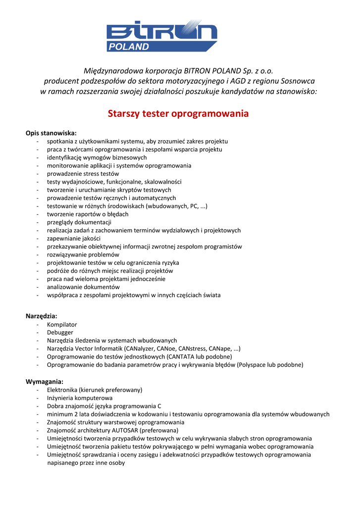 Międzynarodowa korporacja BITRON POLAND Sp. z o.o. producent podzespołów do sektora motoryzacyjnego i AGD z regionu Sosnowca w ramach rozszerzania swojej działalności poszukuje kandydatów na stanowisko: Starszy tester oprogramowania Opis stanowiska: - spotkania z użytkownikami systemu, aby zrozumieć zakres projektu praca z twórcami oprogramowania i zespołami wsparcia projektu identyfikację wymogów biznesowych monitorowanie aplikacji i systemów oprogramowania prowadzenie stress testów testy wydajnościowe, funkcjonalne, skalowalności tworzenie i uruchamianie skryptów testowych prowadzenie testów ręcznych i automatycznych testowanie w różnych środowiskach (wbudowanych, PC, ...) tworzenie raportów o błędach przeglądy dokumentacji realizacja zadań z zachowaniem terminów wydziałowych i projektowych zapewnianie jakości przekazywanie obiektywnej informacji zwrotnej zespołom programistów rozwiązywanie problemów projektowanie testów w celu ograniczenia ryzyka podróże do różnych miejsc realizacji projektów praca nad wieloma projektami jednocześnie analizowanie dokumentów współpraca z zespołami projektowymi w innych częściach świata Narzędzia: - Kompilator Debugger Narzędzia śledzenia w systemach wbudowanych Narzędzia Vector Informatik (CANalyzer, CANoe, CANstress, CANape, ...) Oprogramowanie do testów jednostkowych (CANTATA lub podobne) Oprogramowanie do badania parametrów pracy i wykrywania błędów (Polyspace lub podobne) Wymagania: - Elektronika (kierunek preferowany) Inżynieria komputerowa Dobra znajomość języka programowania C minimum 2 lata doświadczenia w kodowaniu i testowaniu oprogramowania dla systemów wbudowanych Znajomość struktury warstwowej oprogramowania Znajomość architektury AUTOSAR (preferowana) Umiejętności tworzenia przypadków testowych w celu wykrywania słabych stron oprogramowania Umiejętność tworzenia pakietu testów pokrywającego w pełni wymagania wobec oprogramowania Umiejętność sprawdzania i oceny zasięgu i adekwatności przypadków testowych oprogramowania napisanego przez inne osoby - - Umiejętność dokonywania przeglądu wymagań dla oprogramowania pod kątem ich spójności Umiejętność dokonywania przeglądu wymagań dla oprogramowania pod kątem ich testowalności Umiejętność tworzenia skryptów i programów/narzędzi pomocniczych w celu testowania wydajności modułów programowych i/lub automatycznej analizy dużych plików dziennika w celu wyszukania błędów oprogramowania. biegła znajomość języka angielskiego w mowie i w piśmie rozwinięte umiejętności komunikacyjne w mowie i w piśmie, w tym umiejętność utrzymywania kontaktów z różnymi interesariuszami umiejętność rozwiązywania problemów umiejętność pracy pod presją dbałość o szczegóły umiejętność pracy w zespole i pracy indywidualnej umiejętność pracy w napiętych terminach umiejętności organizacyjne (preferowane) Oferujemy: - stabilną i ciekawą pracę w dynamicznie rozwijającej się międzynarodowej firmie - pracę pełną wyzwań - możliwość rozwoju zawodowego - udział w międzynarodowych projektach, docelowo samodzielne prowadzenie projektów Zainteresowanych kandydatów prosimy o przesyłanie ofert zawierających CV, list motywacyjny z dopiskiem Starszy tester drogą elektroniczną [email protected] lub na adres: Bitron Poland Sp. z o.o. Ul. Jedności 46 41-218 Sosnowiec Informujemy, że skontaktujemy się tylko z wybranymi osobami