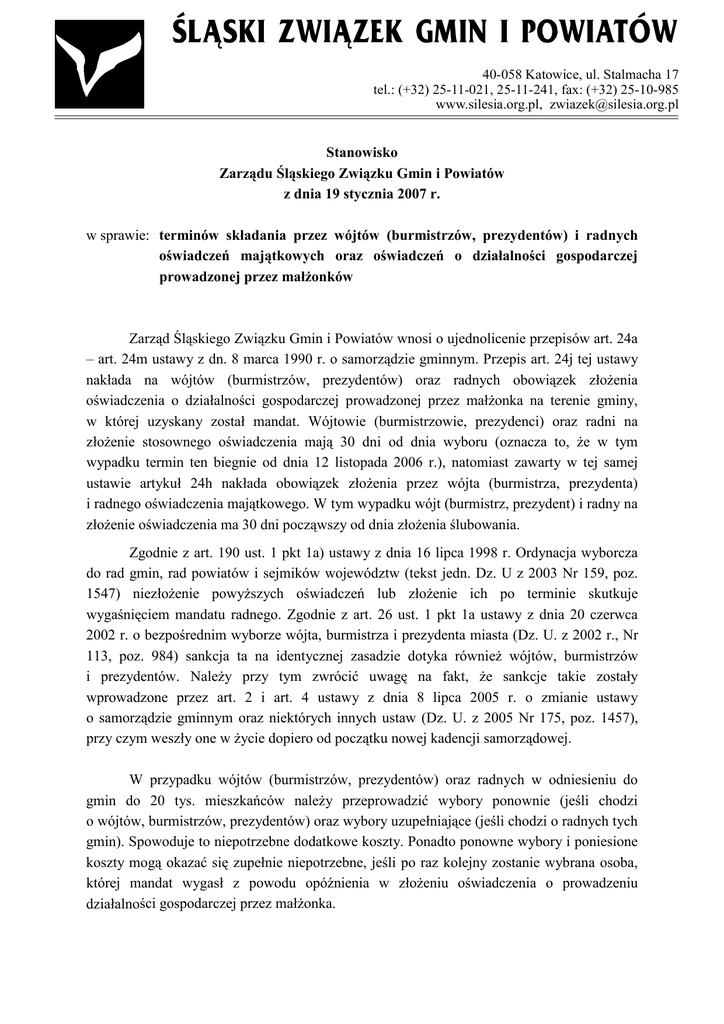 40-058 Katowice, ul. Stalmacha 17 tel.: (+32) 25-11-021, 25-11-241, fax: (+32) 25-10-985 www.silesia.org.pl, [email protected] Stanowisko Zarządu Śląskiego Związku Gmin i Powiatów z dnia 19 stycznia 2007 r. w sprawie: terminów składania przez wójtów (burmistrzów, prezydentów) i radnych oświadczeń majątkowych oraz oświadczeń o działalności gospodarczej prowadzonej przez małŜonków Zarząd Śląskiego Związku Gmin i Powiatów wnosi o ujednolicenie przepisów art. 24a – art. 24m ustawy z dn. 8 marca 1990 r. o samorządzie gminnym. Przepis art. 24j tej ustawy nakłada na wójtów (burmistrzów, prezydentów) oraz radnych obowiązek złoŜenia oświadczenia o działalności gospodarczej prowadzonej przez małŜonka na terenie gminy, w której uzyskany został mandat. Wójtowie (burmistrzowie, prezydenci) oraz radni na złoŜenie stosownego oświadczenia mają 30 dni od dnia wyboru (oznacza to, Ŝe w tym wypadku termin ten biegnie od dnia 12 listopada 2006 r.), natomiast zawarty w tej samej ustawie artykuł 24h nakłada obowiązek złoŜenia przez wójta (burmistrza, prezydenta) i radnego oświadczenia majątkowego. W tym wypadku wójt (burmistrz, prezydent) i radny na złoŜenie oświadczenia ma 30 dni począwszy od dnia złoŜenia ślubowania. Zgodnie z art. 190 ust. 1 pkt 1a) ustawy z dnia 16 lipca 1998 r. Ordynacja wyborcza do rad gmin, rad powiatów i sejmików województw (tekst jedn. Dz. U z 2003 Nr 159, poz. 1547) niezłoŜenie powyŜszych oświadczeń lub złoŜenie ich po terminie skutkuje wygaśnięciem mandatu radnego. Zgodnie z art. 26 ust. 1 pkt 1a ustawy z dnia 20 czerwca 2002 r. o bezpośrednim wyborze wójta, burmistrza i prezydenta miasta (Dz. U. z 2002 r., Nr 113, poz. 984) sankcja ta na identycznej zasadzie dotyka równieŜ wójtów, burmistrzów i prezydentów. NaleŜy przy tym zwrócić uwagę na fakt, Ŝe sankcje takie zostały wprowadzone przez art. 2 i art. 4 ustawy z dnia 8 lipca 2005 r. o zmianie ustawy o samorządzie gminnym oraz niektórych innych ustaw (Dz. U. z 2005 Nr 175, poz. 1457), przy czym weszły one w Ŝycie dopiero od początku nowej kadencji samorządowej. W przypadku wójtów (burmistrzów, prezydentów) oraz radnych w odniesieniu do gmin do 20 tys. mieszkańców naleŜy przeprowadzić wybory ponownie (jeśli chodzi o wójtów, burmistrzów, prezydentów) oraz wybory uzupełniające (jeśli chodzi o radnych tych gmin). Spowoduje to niepotrzebne dodatkowe koszty. Ponadto ponowne wybory i poniesione koszty mogą okazać się zupełnie niepotrzebne, jeśli po raz kolejny zostanie wybrana osoba, której mandat wygasł z powodu opóźnienia w złoŜeniu oświadczenia o prowadzeniu działalności gospodarczej przez małŜonka. UwaŜamy, ze określenie dwóch róŜnych terminów na złoŜenie obu oświadczeń przez wójtów (burmistrzów, prezydentów) i radnych jest wynikiem wyraźnego niedopatrzenia ustawodawcy. Nie istnieje Ŝadne racjonalne uzasadnienie dla stosowania w przypadkach obu oświadczeń dwóch odrębnych zasad obliczania terminów składania powyŜszych oświadczeń. Dodatkowo niejasna jest sytuacja przewodniczących rad. Art. 24j ust. 4 ustawy o samorządzie gminnym stanowi, Ŝe do składanych oświadczeń, o których mowa w ust. 1 i 2 tegoŜ artykułu stosuje się przepisy art. 24h ust. 3. Zgodnie z tymi przepisami przewodniczący rady składa swoje oświadczenie wojewodzie. Przewodniczący rady obejmuje swoją funkcję w dniu, w którym rada dokona aktu wyboru jednego z radnych na to stanowisko, podejmując stosowną uchwałę. Wśród prawników występują wątpliwości, czy w tym wypadku termin złoŜenia oświadczenia o działalności gospodarczej prowadzonej przez małŜonka zaczyna biec – jak w przypadku wszystkich pozostałych radnych - od momentu wyboru na radnego, czy teŜ od momentu wyboru na stanowisko przewodniczącego rady. W wyniku błędów ustawodawcy w samym tylko województwie śląskim wygasło 8 mandatów wójtów i burmistrzów oraz ok. 20 mandatów przewodniczących rad. Ogólnie szacuje się, Ŝe sytuacja ta dotyczyć będzie ok. 10 % radnych w skali całego kraju. NaleŜy przy tym zauwaŜyć, Ŝe mandaty stracili wójtowie i radni cieszący się największym poparciem i zaufaniem społecznym, którzy złoŜyli oba oświadczenia w terminie 30 dni od dnia złoŜenia ślubowania. Miejsce tych radnych – w wypadku gmin powyŜej 20 tys. mieszkańców - zajmą osoby, które w wyborach otrzymały znacznie mniejsze poparcie. W przypadku niektórych gmin w Polsce wystąpiła sytuacja, iŜ ok. 30% radnych wybranych w wyborach w dn. 12 listopada 2006 r. straciło swoje mandaty. Sytuacja taka powoduje znaczący uszczerbek w funkcjonowaniu demokracji, a takŜe utratę zaufania społeczności lokalnych wobec Państwa, czego w kaŜdym wypadku naleŜałoby unikać. NaleŜy takŜe zwrócić uwagę na fakt niespójności uchwalanych przepisów. Z jednej strony art. 24k ustawy o samorządzie gminnym jako konsekwencję niezłoŜenia oświadczeń w ustawowym terminie przewiduje utratę wynagrodzenia, z drugiej zaś ustawa o bezpośrednim wyborze wójta burmistrza i prezydenta miasta oraz ordynacja wyborcza do rad gmin, rad powiatów oraz sejmików województw jako konsekwencję niezłoŜenia oświadczeń wprowadziła utratę mandatu. Opóźnienia w składaniu oświadczeń przez samorządowców nie były celowe i nie wynikały z chęci złamania przepisów, ale z nieuzasadnionej w świetle zdrowego rozsądku rozbieŜności w sposobie określania dwóch terminów dotyczących bardzo zbliŜonych spraw. Dlatego teŜ uwaŜamy, Ŝe nowe przepisy są zbyt restrykcyjne. Na uwagę zasługuje fakt, iŜ w analogicznej sytuacji regulacje dotyczące składania oświadczeń przez posłów i senatorów przewidują nieporównywalnie bardziej łagodne konsekwencje. UwaŜamy, Ŝe to posłowie i senatorowie powinni stanowić wzór do naśladowania dla wszystkich funkcjonariuszy publicznych i obywateli w Państwie, a regulacje ich 