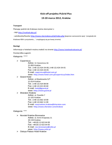 Kick-off projektu PLGrid Plus 19-20 marca 2012, Kraków Transport Planując podróż do Krakowa można skorzystać z: - PKP http://rozklad-pkp.pl/ - autobusów/busów http://www.rda.krakow.pl/pl/index.php (poprzez zaznaczenie opcji ‘przyjazdy do Krakowa RDA z przystanku….’ znajdującej się po lewej stronie) Noclegi Informacje o hotelach można znaleźć na stronie http://www.hotelewkrakowie.pl/ Poniżej kilka sugestii: Kategoria: ***** Copernicus Adres: Ul. Kanonicza 16 31-002 Kraków Tel.: (+48 12) 424-34-00, (+48 12) 424-34-01 Fax: (+48 12) 424-34-05 E-mail: [email protected] www: http://www.hotel.com.pl/copernicus/index.htm Grand Hotel Adres: ul.Sławkowska 5/7 31-014 Kraków Tel.: (+48 12) 424 08 00 Fax: (+48 12) 421 83 60 E-mail: [email protected] www: http://www.grand.pl Sheraton Kraków Adres: ul. Powiśle 7 31-101 Kraków Tel.: (+48 12) 662 10 00 Fax: (+48 12) 662 11 00 E-mail: [email protected] www: http://www.sheraton.com/krakow Kategoria: **** Novotel Kraków Bronowice Adres: ul. Armii Krajowej 11 30-150 Kraków Tel.: +48 (0) 12 622 64 00 Fax: +48 (0) 12 622 64 05 E-mail: [email protected] www: http://www.orbis.pl Ostoya Palace Hotel Kraków Adres: ul. Piłsudskiego 24 31-109 Kraków Tel.: (+48 12) 430 90 00 Fax: (+48 12) 430 90 01 E-mail: [email protected] www: http://www.ostoyapalace.pl Unicus Adres: ul. Floriańska 35/ św. Marka 20 31-020 Kraków Tel.: + 48 12 433 71 11 Fax: + 48 12 433 71 10 E-mail: [email protected] www: http://www.hotelunicus.pl Kategoria: *** Alexander Adres: ul. Garbarska 18 31-131 Kraków Tel.: (+48 12) 422-96-60 Fax: (+48 12) 422-97-61 E-mail: [email protected] www: http://www.alexhotel.pl Elektor Adres: ul. Szpitalna 28 31-024 Kraków Tel.: (+48 12) 423-23-17 Fax: (+48 12) 423-23-27 E-mail: [email protected] www: www.hotelelektor.com.pl Jan Adres: ul. Grodzka 11 31-006 Kraków Tel.: (+48 12) 430 19 69; 431 23 89 Fax: (+48 12) 430 19 92 E-mail: [email protected] www: http://www.hotel-jan.com.pl/