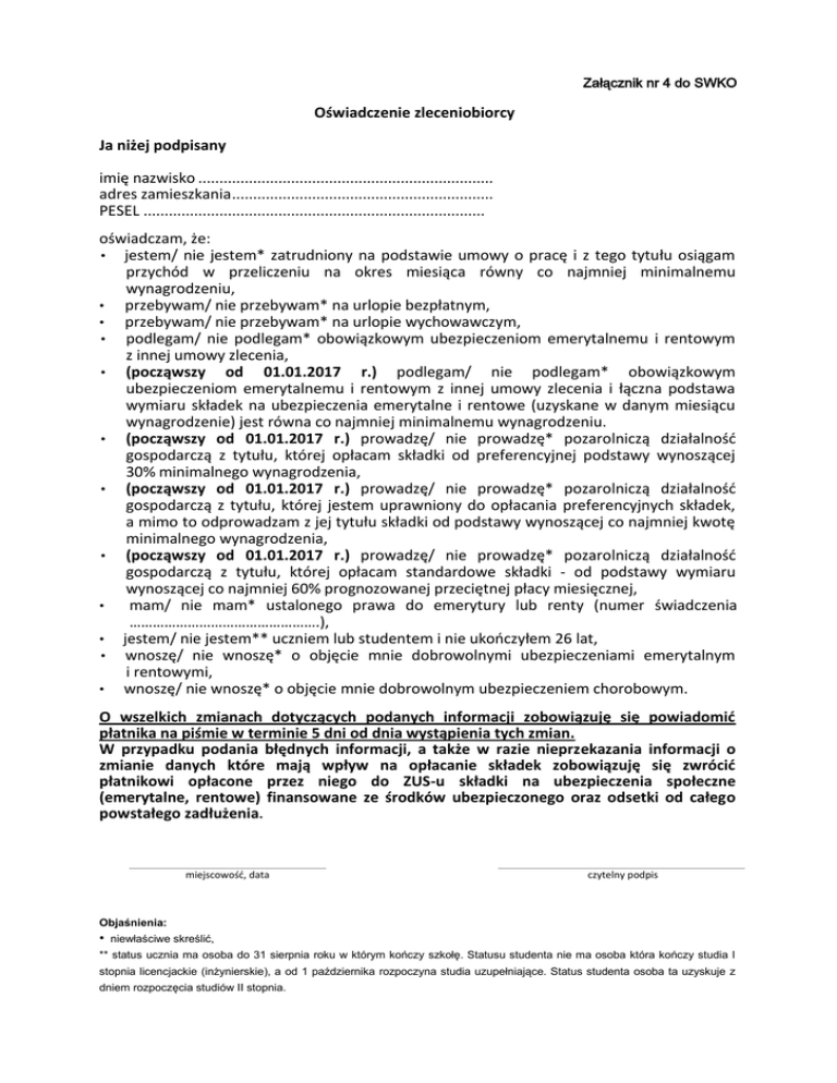 Załącznik nr 4 do SWKO Oświadczenie zleceniobiorcy Ja niżej podpisany imię nazwisko ...................................................................... adres zamieszkania .............................................................. PESEL ................................................................................. oświadczam, że: • jestem/ nie jestem* zatrudniony na podstawie umowy o pracę i z tego tytułu osiągam przychód w przeliczeniu na okres miesiąca równy co najmniej minimalnemu wynagrodzeniu, • przebywam/ nie przebywam* na urlopie bezpłatnym, • przebywam/ nie przebywam* na urlopie wychowawczym, • podlegam/ nie podlegam* obowiązkowym ubezpieczeniom emerytalnemu i rentowym z innej umowy zlecenia, • (począwszy od 01.01.2017 r.) podlegam/ nie podlegam* obowiązkowym ubezpieczeniom emerytalnemu i rentowym z innej umowy zlecenia i łączna podstawa wymiaru składek na ubezpieczenia emerytalne i rentowe (uzyskane w danym miesiącu wynagrodzenie) jest równa co najmniej minimalnemu wynagrodzeniu. • (począwszy od 01.01.2017 r.) prowadzę/ nie prowadzę* pozarolniczą działalnośd gospodarczą z tytułu, której opłacam składki od preferencyjnej podstawy wynoszącej 30% minimalnego wynagrodzenia, • (począwszy od 01.01.2017 r.) prowadzę/ nie prowadzę* pozarolniczą działalnośd gospodarczą z tytułu, której jestem uprawniony do opłacania preferencyjnych składek, a mimo to odprowadzam z jej tytułu składki od podstawy wynoszącej co najmniej kwotę minimalnego wynagrodzenia, • (począwszy od 01.01.2017 r.) prowadzę/ nie prowadzę* pozarolniczą działalnośd gospodarczą z tytułu, której opłacam standardowe składki - od podstawy wymiaru wynoszącej co najmniej 60% prognozowanej przeciętnej płacy miesięcznej, • mam/ nie mam* ustalonego prawa do emerytury lub renty (numer świadczenia ………………………………………….), • jestem/ nie jestem** uczniem lub studentem i nie ukooczyłem 26 lat, • wnoszę/ nie wnoszę* o objęcie mnie dobrowolnymi ubezpieczeniami emerytalnym i rentowymi, • wnoszę/ nie wnoszę* o objęcie mnie dobrowolnym ubezpieczeniem chorobowym. O wszelkich zmianach dotyczących podanych informacji zobowiązuję się powiadomid płatnika na piśmie w terminie 5 dni od dnia wystąpienia tych zmian. W przypadku podania błędnych informacji, a także w razie nieprzekazania informacji o zmianie danych które mają wpływ na opłacanie składek zobowiązuję się zwrócid płatnikowi opłacone przez niego do ZUS-u składki na ubezpieczenia społeczne (emerytalne, rentowe) finansowane ze środków ubezpieczonego oraz odsetki od całego powstałego zadłużenia. miejscowośd, data czytelny podpis Objaśnienia: • niewłaściwe skreślić, ** status ucznia ma osoba do 31 sierpnia roku w którym kończy szkołę. Statusu studenta nie ma osoba która kończy studia I stopnia licencjackie (inżynierskie), a od 1 października rozpoczyna studia uzupełniające. Status studenta osoba ta uzyskuje z dniem rozpoczęcia studiów II stopnia.