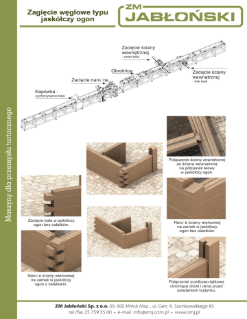 Zagięcie węgłowe typu jaskółczy ogon Zacięcie ściany wewnętrznej - czoło bala Obrotnica Zacięcie narożne Zacięcie ściany wewnętrznej - bok bala Kapówka wyrównywanie bala Połączenie ściany zewnętrznej ze ścianą wewnętrzną na półzamek teowy w jaskółczy ogon. Zacięcie bala w jaskółczy ogon bez ostatków. Naroże ściany wieńcowej na zamek w jaskółczy ogon z ostatkami. Naroże ściany wieńcowej na zamek w jaskółczy ogon bez ostatków. Połączenie sumikowo-łątkowe chroniące drzwi i okna przed osiadaniem budynku. Zagięcie węgłowe typu jaskółczy ogon Linia do zacięć węgłowych „Jaskółczy ogon”. Linia przeznaczona jest do wykonywania zacięć w jaskółczy ogon. Wszystkie zacięcia wykonywane są piłami tarczowymi dzięki czemu zyskujemy bardzo wysoką jakość i dokładność zadęć. Linia stanowi niezbędne wyposażenie przy seryjnej produkcji domów z bali. Dane techniczne: Szerokość bala Wysokość bala Moc zainstalowana 7 zestawów z piłami tarczowymi 6 - 18 m 12 - 24 m 34 kW