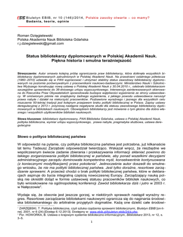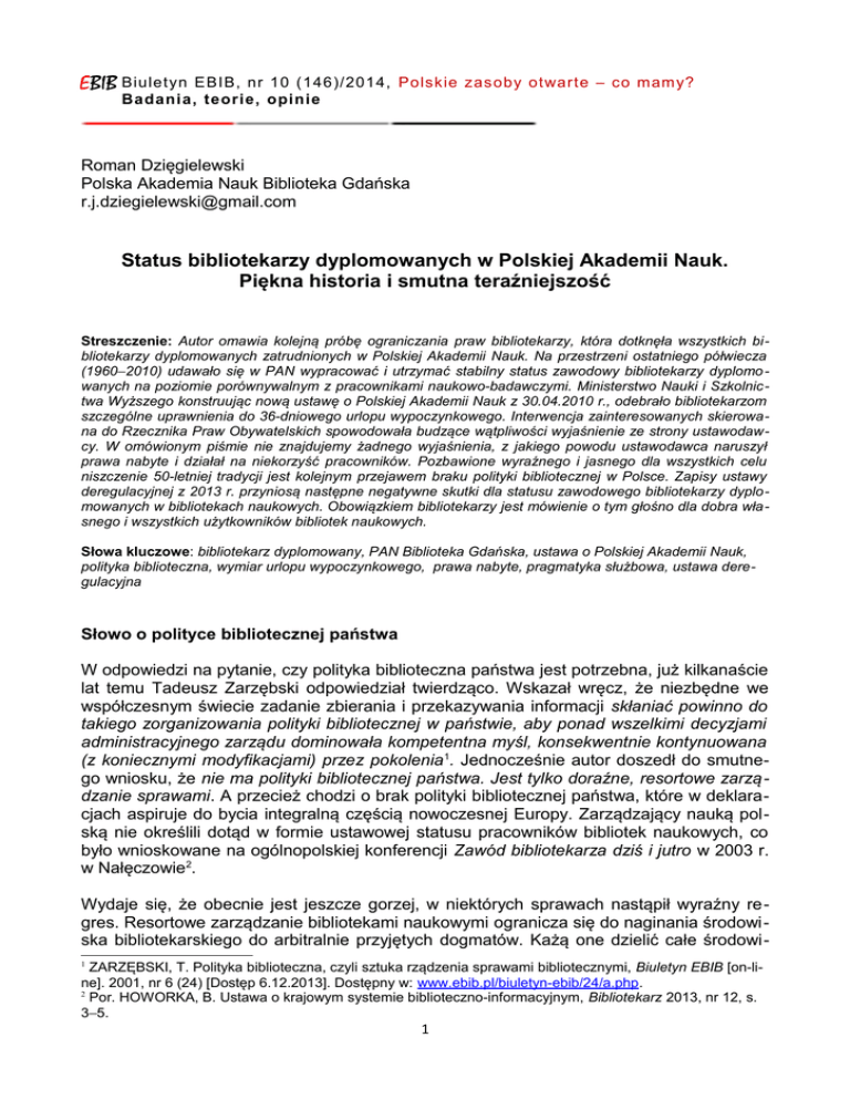 1. Biuletyn EBIB, nr 10 (146)/2014, Polskie zasoby otwarte – co mam y? Badania, teorie, opinie Roman Dzięgielewski Polska Akademia Nauk Biblioteka Gdańska [email protected] Status bibliotekarzy dyplomowanych w Polskiej Akademii Nauk. Piękna historia i smutna teraźniejszość Streszczenie: Autor omawia kolejną próbę ograniczania praw bibliotekarzy, która dotknęła wszystkich bibliotekarzy dyplomowanych zatrudnionych w Polskiej Akademii Nauk. Na przestrzeni ostatniego półwiecza (1960–2010) udawało się w PAN wypracować i utrzymać stabilny status zawodowy bibliotekarzy dyplomo wanych na poziomie porównywalnym z pracownikami naukowo-badawczymi. Ministerstwo Nauki i Szkolnictwa Wyższego konstruując nową ustawę o Polskiej Akademii Nauk z 30.04.2010 r., odebrało bibliotekarzom szczególne uprawnienia do 36-dniowego urlopu wypoczynkowego. Interwencja zainteresowanych skierowana do Rzecznika Praw Obywatelskich spowodowała budzące wątpliwości wyjaśnienie ze strony ustawodawcy. W omówionym piśmie nie znajdujemy żadnego wyjaśnienia, z jakiego powodu ustawodawca naruszył prawa nabyte i działał na niekorzyść pracowników. Pozbawione wyraźnego i jasnego dla wszystkich celu niszczenie 50-letniej tradycji jest kolejnym przejawem braku polityki bibliotecznej w Polsce. Zapisy ustawy deregulacyjnej z 2013 r. przyniosą następne negatywne skutki dla statusu zawodowego bibliotekarzy dyplomowanych w bibliotekach naukowych. Obowiązkiem bibliotekarzy jest mówienie o tym głośno dla dobra własnego i wszystkich użytkowników bibliotek naukowych. Słowa kluczowe: bibliotekarz dyplomowany, PAN Biblioteka Gdańska, ustawa o Polskiej Akademii Nauk, polityka biblioteczna, wymiar urlopu wypoczynkowego, prawa nabyte, pragmatyka służbowa, ustawa deregulacyjna Słowo o polityce bibliotecznej państwa W odpowiedzi na pytanie, czy polityka biblioteczna państwa jest potrzebna, już kilkanaście lat temu Tadeusz Zarzębski odpowiedział twierdząco. Wskazał wręcz, że niezbędne we współczesnym świecie zadanie zbierania i przekazywania informacji skłaniać powinno do takiego zorganizowania polityki bibliotecznej w państwie, aby ponad wszelkimi decyzjami administracyjnego zarządu dominowała kompetentna myśl, konsekwentnie kontynuowana (z koniecznymi modyfikacjami) przez pokolenia 1. Jednocześnie autor doszedł do smutnego wniosku, że nie ma polityki bibliotecznej państwa. Jest tylko doraźne, resortowe zarządzanie sprawami. A przecież chodzi o brak polityki bibliotecznej państwa, które w deklaracjach aspiruje do bycia integralną częścią nowoczesnej Europy. Zarządzający nauką polską nie określili dotąd w formie ustawowej statusu pracowników bibliotek naukowych, co było wnioskowane na ogólnopolskiej konferencji Zawód bibliotekarza dziś i jutro w 2003 r. w Nałęczowie2. Wydaje się, że obecnie jest jeszcze gorzej, w niektórych sprawach nastąpił wyraźny regres. Resortowe zarządzanie bibliotekami naukowymi ogranicza się do naginania środowiska bibliotekarskiego do arbitralnie przyjętych dogmatów. Każą one dzielić całe środowi1 ZARZĘBSKI, T. Polityka biblioteczna, czyli sztuka rządzenia sprawami bibliotecznymi, Biuletyn EBIB [on-line]. 2001, nr 6 (24) [Dostęp 6.12.2013]. Dostępny w: www.ebib.pl/biuletyn-ebib/24/a.php. 2 Por. HOWORKA, B. Ustawa o krajowym systemie biblioteczno-informacyjnym, Bibliotekarz 2013, nr 12, s. 3–5. 1 1. Biuletyn EBIB, nr 10 (146)/2014, Polskie zasoby otwarte – co mam y? Badania, teorie, opinie sko naukowe na struktury hierarchiczne, które z mocy prawa posiadają nierówny status. Regulacje prawne ograniczają się do konfrontowania bibliotekarzy z pracownikami uczelni zajmujących się dydaktyką i wyznaczania odpowiednio niższego miejsca. Trudno zrozumieć nową logikę, zwłaszcza że do tej pory było zupełnie odwrotnie. Tworzenie nierówno ści na poziomie uprawnień pracowniczych z góry wyklucza równoważne role, jakie w rozwoju nauki mają do spełnienia dysponenci i poszukiwacze informacji, czyli bibliotekarze i pracownicy naukowi. Trudno znaleźć spójność pomiędzy prawnym degradowaniem pozycji bibliotekarzy dyplomowanych a potrzebą wspierania modernizacji bibliotek naukowych. Polskie biblioteki pokonały dawne zaniedbania, mocno weszły do świata komputeryzacji i cyfryzacji, tworząc biblioteki cyfrowe i bazy danych, wobec czego potrzebują wyspecjalizowanych kadr. Zarządcy nauki polskiej chyba tego nie zauważyli. Ciągle pokutuje dawne przekonanie, że bibliotekarzom w Polsce nie trzeba wiele ofiarować, bo mają silny etos zawodowy i niezachwiane poczucie „misji”. Niektóre pomysły i działania mają charakter nieświadomej destrukcji. Artur Jazdon uważa, że przeforsowana na siłę w stosunku do bibliotekarzy dyplomowanych ustawa deregulacyjna jest wynikiem niezrozumienia i braku należytego rozpoznania sytuacji tej grupy zawodowej, przynieść może wiele skutków negatywnych, nieprzewidywanych i niezakładanych przez jej pomysłodawców 3. Status bibliotekarzy uczelnianych po 2005 r. W niniejszym artykule zostaną przedstawione efekty działalności ustawodawczej Ministerstwa Nauki i Szkolnictwa Wyższego, które degradują status bibliotekarzy dyplomowanych w Polskiej Akademii Nauk. Ale już wcześniej otrzymaliśmy sygnał ostrzegawczy, że sytu acja prawna wszystkich bibliotekarzy dyplomowanych w Polsce zaczęła się zmieniać na niekorzyść. Ministerstwo Nauki i Szkolnictwa Wyższego w ustawie Prawo o szkolnictwie wyższym z dnia 27 lipca 2005 r. utrzymało dotychczasowe uprawnienia, ale jedynie wobec bibliotekarzy dyplomowanych mianowanych. Tylko oni zostali potraktowani jako nauczyciele akademiccy (art. 108) i posiadają prawo do 36-dniowego urlopu (art. 133, ust. 1). Ponadto ich tygodniowy czas pracy wynosi 36 godzin (art. 130, ust. 7). Odnośnie urlopów pozostałych pracowników bibliotek zastosowano przepisy kodeksu pracy. W efekcie tych zmian na wielu uczelniac