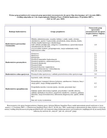 Wykaz grup projektowych i oznaczeń grup uprawnień rzeczoznawców do spraw bhp obowiązujący od 1 stycznia 2008 r. (według załącznika nr 1 do rozporządzenia Ministra Pracy i Polityki Społecznej z 19 grudnia 2007 r. – DzU nr 247, poz. 1835) Rodzaje budownictwa Grupy projektowe Oznaczenia grup uprawnień rzeczoznawców do spraw bezpieczeństwa i higieny pracy Budownictwo powszechne i komunalne Obiekty administracyjne, socjalne, kultury i sztuki, nauki, oświaty, szkolnictwa, sportu i wypoczynku, przedszkola, domy dziecka, hotele, obiekty handlu hurtowego i detalicznego, małe zakłady produkcyjne, usługowe i rzemieślnicze z przewidywanym zatrudnieniem do 20 osób, oczyszczalnie ścieków, przepompownie, stacje uzdatniania wody, budownictwo rolne 1.0 Budownictwo przemysłowe Górnictwo Hutnictwo Energetyka Przemysł materiałów budowlanych Przemysł metalowy, elektromaszynowy Przemysł chemiczny Przemysł lekki Przemysł drzewny i papierniczy Przemysł elektroniczny i teletechniczny Inne niż wyżej wymienione 2.1 2.2 2.3 2.4 2.5 2.6 2.7 2.8 2.9 2.10 Budownictwo rolno-spożywcze Przemysł rolno-spożywczy i zakłady przetwórstwa rolno-spożywczego 3.0 Łączność, radio, telewizja 4.1 Komunikacja i transport (dworce kolejowe, autobusowe i lotnicze, bazy i stacje paliw, stacje obsługi pojazdów itp.) 4.2 Gospodarka morska i rzeczna (porty, stocznie, przystanie itp.) 4.3 Zakłady opieki zdrowotnej (szpitale, przychodnie i ośrodki zdrowia, zakłady opiekuńczo-lecznicze, pogotowie ratunkowe, sanatoria, gabinety lekarskie, stacje krwiodawstwa, laboratoria diagnostyczne, apteki, żłobki itp.) 4.4 Inne niż wyżej wymienione 4.5 Budownictwo specjalistyczne Rzeczoznawcy do spraw bezpieczeństwa i higieny pracy, którym Główny Inspektor Pracy nadał uprawnienia przed wejściem w życie ustawy z 13 kwietnia 2007 r. o Państwowej Inspekcji Pracy (Dz.U. Nr 89, poz. 589), zachowują te uprawnienia po dniu wejścia w życie tej ustawy według dotychczasowych grup projektowych i ich oznaczeń (dane podawane przez rzeczoznawców znajdujących się na naszej liście odnoszą się zarówno do „starych”, jak i do „nowych” grup).