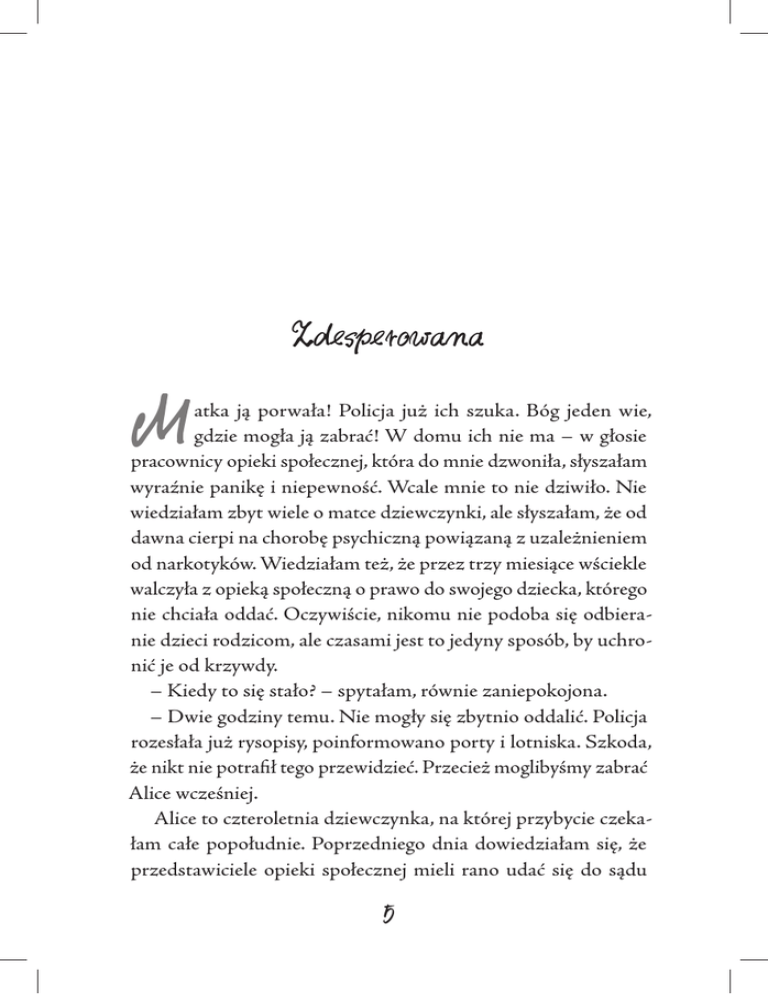 Zdesperowana M atka ją porwała! Policja już ich szuka. Bóg jeden wie, gdzie mogła ją zabrać! W domu ich nie ma – w głosie pracownicy opieki społecznej, która do mnie dzwoniła, słyszałam wyraźnie panikę i niepewność. Wcale mnie to nie dziwiło. Nie wiedziałam zbyt wiele o matce dziewczynki, ale słyszałam, że od dawna cierpi na chorobę psychiczną powiązaną z uzależnieniem od narkotyków. Wiedziałam też, że przez trzy miesiące wściekle walczyła z opieką społeczną o prawo do swojego dziecka, którego nie chciała oddać. Oczywiście, nikomu nie podoba się odbieranie dzieci rodzicom, ale czasami jest to jedyny sposób, by uchronić je od krzywdy. – Kiedy to się stało? – spytałam, równie zaniepokojona. – Dwie godziny temu. Nie mogły się zbytnio oddalić. Policja rozesłała już rysopisy, poinformowano porty i lotniska. Szkoda, że nikt nie potrafił tego przewidzieć. Przecież moglibyśmy zabrać Alice wcześniej. Alice to czteroletnia dziewczynka, na której przybycie czekałam całe popołudnie. Poprzedniego dnia dowiedziałam się, że przedstawiciele opieki społecznej mieli rano udać się do sądu 5 Mamusiu, wróć na rozprawę o tymczasowe postanowienie w sprawie opieki nad Alice. Ze skierowania zawierającego podstawowe informacje o dziecku wynikało, że oboje rodzice są narkomanami, a ponieważ żadne z nich nie było w stanie opiekować się córką, dziewczynka mieszkała u dziadków ze strony matki. Przeczytałam też, pamiętam, że Alice codziennie chodziła do przedszkola na dziewiątą rano, a odbierano ją o 15.15. – Porwała ją z przedszkola? – zapytałam zaskoczona. Zdawałam sobie sprawę, jakie procedury obowiązują obecnie w placówkach oświatowych. Odpowiedź padła po dłuższej chwili. – Nie. To wychowawczyni poinformowała nas, gdy okazało się, że Alice nie dotarła do przedszkola. Po wyjściu z sądu poszliśmy prosto do dziadków, ale tam też jej nie było. No cóż, może nie pozjadałam wszystkich rozumów, ale gdybym sama pracowała w pomocy społecznej i doszłoby do sytuacji, że dziecko, które zaraz ma trafić do rodziny zastępczej, nie pojawia się w przedszkolu w dniu rozprawy, to chyba zaczęłabym coś podejrzewać. – Obawiamy się, że dziadkowie mogli brać udział w uprowadzeniu wnuczki – dodała. – Właśnie przesłuchują ich policjanci. Za chwilę sama do nich jadę. Zadzwonię do pani później. – Dobrze. Dziękuję za informacje. Mam nadzieję, że Alice szybko się odnajdzie. – Ja też – usłyszałam. – I że nic jej się nie stanie. Odłożyłam słuchawkę i wróciłam do kuchni, gdzie przygotowywałam obiad. Była już 17.30, a na Alice czekałam od trzynastej. Obawy i niepewność, które zwykle towarzyszyły mi, gdy oczekiwałam przybycia nowego podopiecznego, teraz zamieniły się w najprawdziwszy strach. I choć nigdy nie widziałam Alice 6 Zdesperowana (znałam ją tylko z ogólnego opisu), wiedziałam wystarczająco, by się o nią martwić. Jej niezrównoważona psychicznie matka, pewnie pod wpływem narkotyków, w desperackim akcie porwała własną córkę i teraz próbowała uciekać – wszystko, by tylko nie stracić dziecka. Kto wie, jakie myśli przebiegały przez jej głowę i do czego jeszcze była zdolna? Wyobraziłam sobie nagłówki gazet: „Matka skacze z córką z mostu” czy „Znaleziono zwłoki matki z dzieckiem”. Moje mroczne myśli były oczywiście przesadzone, ale takie rzeczy czasem się zdarzają, szczególnie gdy ludzie są zdesperowani lub działają w stanie odurzenia narkotykami. Dziesięć minut później rozbrzmiał dzwonek telefonu. Chwyciłam za słuchawkę w nadziei, że usłyszę informację o odnalezieniu Alice całej i zdrowej. Była to jednak Jill, moja osoba kontaktowa w agencji, dla której prowadziłam rodzinę zastępczą. W jej głosie usłyszałam tę samą obawę, którą wyczułam ze strony mej poprzedniej rozmówczyni, a która zdążyła się udzielić i mnie samej. – Dzwonili do ciebie z pomocy społecznej? – spytała. – Poprosiłam, żeby cię poinformowali jak najszybciej. Ja całe popołudnie spędziłam na spotkaniu. – Tak, dzwonili chwilę temu, ale jeszcze nie znaleźli Alice. Policja zaczęła poszukiwania. – Biedne dziecko – Jill westchnęła głęboko. – I biedna mama – dodała. – To prawda, ale matka musi wiedzieć, że jej się to nie uda. Prędzej czy później ją znajdą, a porywanie własnego dziecka na pewno nie poprawi jej sytuacji. – Taka matka nie będzie się zastanawiać – stwierdziła Jill. – Z tyloma problemami na głowie będzie działać pod wpływem impulsu i wyłączy racjonalne myślenie – te słowa wcale nie 7 Mamusiu, wróć pomogły mi uwierzyć w bezpieczeństwo matki i córki. – Martha pytała, czy gdy znajdą Alice, mają przyprowadzić ją prosto do ciebie, oczywiście przy założeniu, że nie będzie wymagała opieki lekarskiej. Powiedziałam, że tak, nawet jeśli to będzie po godzinach pracy. – Pewnie, przywieźcie ją tutaj – potwierdziłam. Nie mogłam się też powstrzymać od małego przytyku: – A tak w ogóle, Jill, to ja nie mam wyznaczonych godzin urzędowania. – Jasne. Wiesz, co miałam na myśli. – Aha. Miejmy nadzieję, że policja szybko namierzy Alice. – Też mam taką nadzieję. Biedactwu i bez tego całego zamieszania trudno byłoby się przyzwyczaić do nowej sytuacji. Pochłonięta myślami wróciłam do kuchni i mocno już opóźnionego obiadu. Dołączył do mnie Adrian, któremu głośno burczało w brzuchu. – Mamo, kiedy będzie obiad? – zapytał. Mój syn miał wtedy czternaście lat, był ciągle głodny i rósł jak na drożdżach. Już wtedy był o dobre 10 centymetrów wyższy ode mnie i zbliżał się do wzrostu swego ojca, który miał ponad metr osiemdziesiąt. Niestety, ojciec Adriana nie mieszkał już z nami. – Za pół godzinki będzie gotowy – odpowiedziałam. – Zjedz jabłko, jeśli j