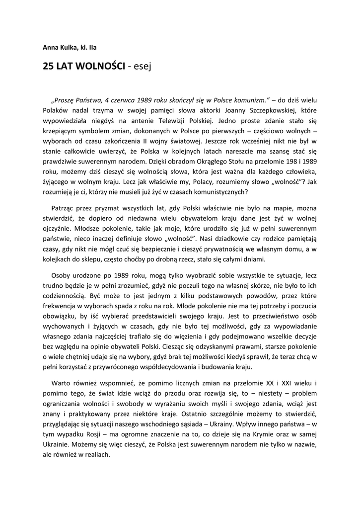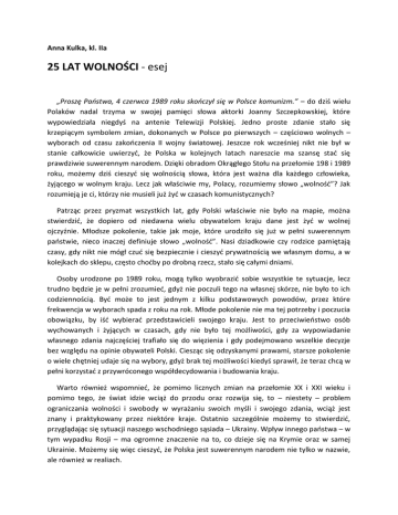 Anna Kulka, kl. IIa 25 LAT WOLNOŚCI - esej „Proszę Państwa, 4 czerwca 1989 roku skończył się w Polsce komunizm.” – do dziś wielu Polaków nadal trzyma w swojej pamięci słowa aktorki Joanny Szczepkowskiej, które wypowiedziała niegdyś na antenie Telewizji Polskiej. Jedno proste zdanie stało się krzepiącym symbolem zmian, dokonanych w Polsce po pierwszych – częściowo wolnych – wyborach od czasu zakończenia II wojny światowej. Jeszcze rok wcześniej nikt nie był w stanie całkowicie uwierzyć, że Polska w kolejnych latach nareszcie ma szansę stać się prawdziwie suwerennym narodem. Dzięki obradom Okrągłego Stołu na przełomie 198 i 1989 roku, możemy dziś cieszyć się wolnością słowa, która jest ważna dla każdego człowieka, żyjącego w wolnym kraju. Lecz jak właściwie my, Polacy, rozumiemy słowo „wolność”? Jak rozumieją je ci, którzy nie musieli już żyć w czasach komunistycznych? Patrząc przez pryzmat wszystkich lat, gdy Polski właściwie nie było na mapie, można stwierdzić, że dopiero od niedawna wielu obywatelom kraju dane jest żyć w wolnej ojczyźnie. Młodsze pokolenie, takie jak moje, które urodziło się już w pełni suwerennym państwie, nieco inaczej definiuje słowo „wolność”. Nasi dziadkowie czy rodzice pamiętają czasy, gdy nikt nie mógł czuć się bezpiecznie i cieszyć prywatnością we własnym domu, a w kolejkach do sklepu, często choćby po drobną rzecz, stało się całymi dniami. Osoby urodzone po 1989 roku, mogą tylko wyobrazić sobie wszystkie te sytuacje, lecz trudno będzie je w pełni zrozumieć, gdyż nie poczuli tego na własnej skórze, nie było to ich codziennością. Być może to jest jednym z kilku podstawowych powodów, przez które frekwencja w wyborach spada z roku na rok. Młode pokolenie nie ma tej potrzeby i poczucia obowiązku, by iść wybierać przedstawicieli swojego kraju. Jest to przeciwieństwo osób wychowanych i żyjących w czasach, gdy nie było tej możliwości, gdy za wypowiadanie własnego zdania najczęściej trafiało się do więzienia i gdy podejmowano wszelkie decyzje bez względu na opinie obywateli Polski. Ciesząc się odzyskanymi prawami, starsze pokolenie o wiele chętniej udaje się na wybory, gdyż brak tej możliwości kiedyś sprawił, że teraz chcą w pełni korzystać z przywróconego współdecydowania i budowania kraju. Warto również wspomnieć, że pomimo licznych zmian na przełomie XX i XXI wieku i pomimo tego, że świat idzie wciąż do przodu oraz rozwija się, to – niestety – problem ograniczania wolności i swobody w wyrażaniu swoich myśli i swojego zdania, wciąż jest znany i praktykowany przez niektóre kraje. Ostatnio szczególnie możemy to stwierdzić, przyglądając się sytuacji naszego wschodniego sąsiada – Ukrainy. Wpływ innego państwa – w tym wypadku Rosji – ma ogromne znaczenie na to, co dzieje się na Krymie oraz w samej Ukrainie. Możemy się więc cieszyć, że Polska jest suwerennym narodem nie tylko w nazwie, ale również w realiach. Skąd więc wciąż nasuwające się pytania? Dlaczego młodemu pokoleniu coraz bardziej brak potrzeby współdecydowania o tym, kto reprezentuje nasze państwo? Dzisiaj my, młodzi, stawiamy sobie w życiu inne priorytety i cele. Biegniemy wciąż za czymś nowym, próbujemy odnaleźć swoje miejsce w świecie, mamy wiele obowiązków i spraw na głowie. Jednak czy te tłumaczenie usprawiedliwiają naszą niechęć do wspólnego budowania państwa? Skoro pozwalamy innym decydować za nad, to może lepiej przywrócić dawne ograniczenia i znieść wolność słowa, skoro i tak z niej nie korzystamy? Oczywiście byłby to absurdalny pomysł, choć pewnie okazać by się mogło, że o wiele skuteczniejszy niż uświadamianie sobie samemu o znaczeniu naszego udziału w wyborach. „[…] wolność wtedy tylko istnieje, kiedy się z niej korzysta” – pisał w jednej ze swych powieści Éric-Emmanuel Schmitt. Przyjrzyjmy się sobie: jak korzystamy z wolności? Czujemy się wolni, ale czy prawdziwa wolność to ta, gdzie jedną z najważniejszych wartości w naszym życiu, ojczyznę, odstawiamy na boczny tor? Wybieramy tym samym prostszą drogę i pozwalamy innym decydować za nas. Uwstecznianie się i bierność nie jest dobrym sposobem na życie, dlatego ja już teraz, jako uczeń wiem, że po ukończeniu osiemnastu lat pójdę z dumą skorzystać z mojej wolności i wrzucę do urny mój własny, nienarzucony przez nikogo głos.