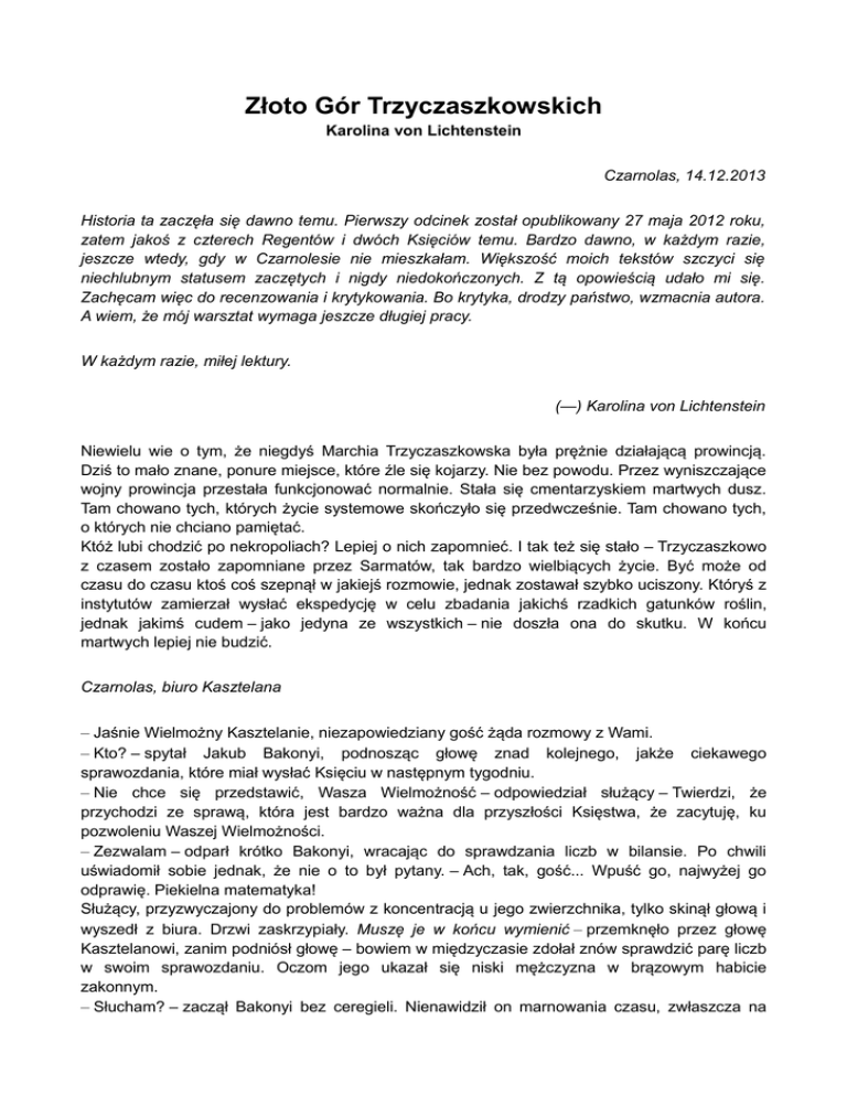 Złoto Gór Trzyczaszkowskich Karolina von Lichtenstein Czarnolas, 14.12.2013 Historia ta zaczęła się dawno temu. Pierwszy odcinek został opublikowany 27 maja 2012 roku, zatem jakoś z czterech Regentów i dwóch Księciów temu. Bardzo dawno, w każdym razie, jeszcze wtedy, gdy w Czarnolesie nie mieszkałam. Większość moich tekstów szczyci się niechlubnym statusem zaczętych i nigdy niedokończonych. Z tą opowieścią udało mi się. Zachęcam więc do recenzowania i krytykowania. Bo krytyka, drodzy państwo, wzmacnia autora. A wiem, że mój warsztat wymaga jeszcze długiej pracy. W każdym razie, miłej lektury. (—) Karolina von Lichtenstein Niewielu wie o tym, że niegdyś Marchia Trzyczaszkowska była prężnie działającą prowincją. Dziś to mało znane, ponure miejsce, które źle się kojarzy. Nie bez powodu. Przez wyniszczające wojny prowincja przestała funkcjonować normalnie. Stała się cmentarzyskiem martwych dusz. Tam chowano tych, których życie systemowe skończyło się przedwcześnie. Tam chowano tych, o których nie chciano pamiętać. Któż lubi chodzić po nekropoliach? Lepiej o nich zapomnieć. I tak też się stało – Trzyczaszkowo z czasem zostało zapomniane przez Sarmatów, tak bardzo wielbiących życie. Być może od czasu do czasu ktoś coś szepnął w jakiejś rozmowie, jednak zostawał szybko uciszony. Któryś z instytutów zamierzał wysłać ekspedycję w celu zbadania jakichś rzadkich gatunków roślin, jednak jakimś cudem – jako jedyna ze wszystkich – nie doszła ona do skutku. W końcu martwych lepiej nie budzić. Czarnolas, biuro Kasztelana – Jaśnie Wielmożny Kasztelanie, niezapowiedziany gość żąda rozmowy z Wami. – Kto? – spytał Jakub Bakonyi, podnosząc głowę znad kolejnego, jakże ciekawego sprawozdania, które miał wysłać Księciu w następnym tygodniu. – Nie chce się przedstawić, Wasza Wielmożność – odpowiedział służący – Twierdzi, że przychodzi ze sprawą, która jest bardzo ważna dla przyszłości Księstwa, że zacytuję, ku pozwoleniu Waszej Wielmożności. – Zezwalam – odparł krótko Bakonyi, wracając do sprawdzania liczb w bilansie. Po chwili uświadomił sobie jednak, że nie o to był pytany. – Ach, tak, gość... Wpuść go, najwyżej go odprawię. Piekielna matematyka! Służący, przyzwyczajony do problemów z koncentracją u jego zwierzchnika, tylko skinął głową i wyszedł z biura. Drzwi zaskrzypiały. Muszę je w końcu wymienić – przemknęło przez głowę Kasztelanowi, zanim podniósł głowę – bowiem w międzyczasie zdołał znów sprawdzić parę liczb w swoim sprawozdaniu. Oczom jego ukazał się niski mężczyzna w brązowym habicie zakonnym. – Słucham? – zaczął Bakonyi bez ceregieli. Nienawidził on marnowania czasu, zwłaszcza na coś tak nieistotnego, jak powitania. – Niebezpieczeństwo przybyło – odparł gość. – Słucham? – powtórzył Kasztelan, jakby nie dowierzając temu, co usłyszał przed chwilą – Ma pan mi coś ciekawego do powiedzenia? – Tak – odpowiedział – Niebezpieczeństwo przybyło. Trzyczaszkowo ożyło. – Rymy są zaiste ciekawe, ale nie mam czasu na ich słuchanie. Proszę przejść do rzeczy albo nasza rozmowa zostanie zakończona – rzekł Jakub z nutką niecierpliwości w głosie. – Trzyczaszkowo ożyło – powtórzył zakonnik – Martwi wychodzą z ziemi. Zagrażają wszystkim. A Czarnolas jest najbliżej. Będzie pierwszym ich celem. – Słucham? – po raz trzeci powtórzył Kasztelan – Niby czemu ktokolwiek w Trzyczaszkowie miałby żyć? Przecież to martwe miejsce! – Ale martwi wychodzą z ziemi – ze stoickim spokojem odparł mężczyzna – To nie jest dobre. – Bzdury pan gada. Martwi ludzie mają to do siebie, że w ziemi leżą, a nie z niej wychodzą. Proszę w tej chwili wyjść stąd i nie marnować więcej mojego bezcennego czasu! – Kasztelan podniósł ton głosu, nieco poirytowany gościem. – Dobrze. Ale zobaczy pan. Oni żyją – odparł zakonnik i ruszył w kierunku drzwi. Jednak Bakonyi już nie słuchał go, pogrążając się w swojej pracy. Grodzisk Słońce oświetlało cały Grodzisk swoim blaskiem już od rana. Nic dziwnego, że Minister Obrony Narodowej szedł po grodziskim chodniku w bardzo wesołym nastroju. – Param pam pam, dzisiaj dokupimy dodatkowy kram! – naprędce sklecił rym, z którego był tak dumny, że aż go powtórzył parę razy. – O tak, kramy to przyszłość almerskiego zboża! Niestety, bardzo filozoficzne rozmyślania pana ministra zostały przerwane przez wibracje telefonu w jego kieszeni. – Tak, słucham Cię, mój drogi Krzyyysiu? – Panie ministrze, przyjechał Książę i prosi pana, żeby wrócił do biura – w słuchawce rozległ się głos Krzysztofa Bojara, starosty grodziskiego i jednocześnie sekretarza w ministerstwie. – Książę? Król Baridasu? – Minister Wiśnicki osłupiał. – Ale czemu? – Nie wiem, niech pan szybko przychodzi! – odparł Bojar i rozłączył się. A co z moim grillem, co z moim piwem, które miałem wypić za pięć minut? – mina Wiśnickiego już nie była taka wesoła, jak przed paroma minutami. – No trudno, Król przyjechał, znaczy się, coś ważnego… Godzinę później, to samo miasto – Proszę mi wybaczyć, panie ministrze. – powitał go Książę – Nie niepokoiłbym pana, gdyby nie było potrzeby. – Ale widocznie jest – odparł Wojciech Wiśnicki, rozsiadając się na krześle przeznaczonym dla gościa, podczas gdy władca siedział za biurkiem w gabinecie ministra, zaś zaaferowany Bojar przygotowywał kawę. – Ano jest – zgodził się Piotr Grzegorz – Otrzymałem niepokojące doniesienia ze Starosarmacji. Prawdę mówiąc, wezwałem także Kanclerza. Lada chwila powinien się tutaj pojawić. Fiu, fiu, coś poważnego... – pomyślał Wiśnicki, zaczynając się lekko denerwować – Rozumiem. – powiedział na głos – W takim razie może zacze