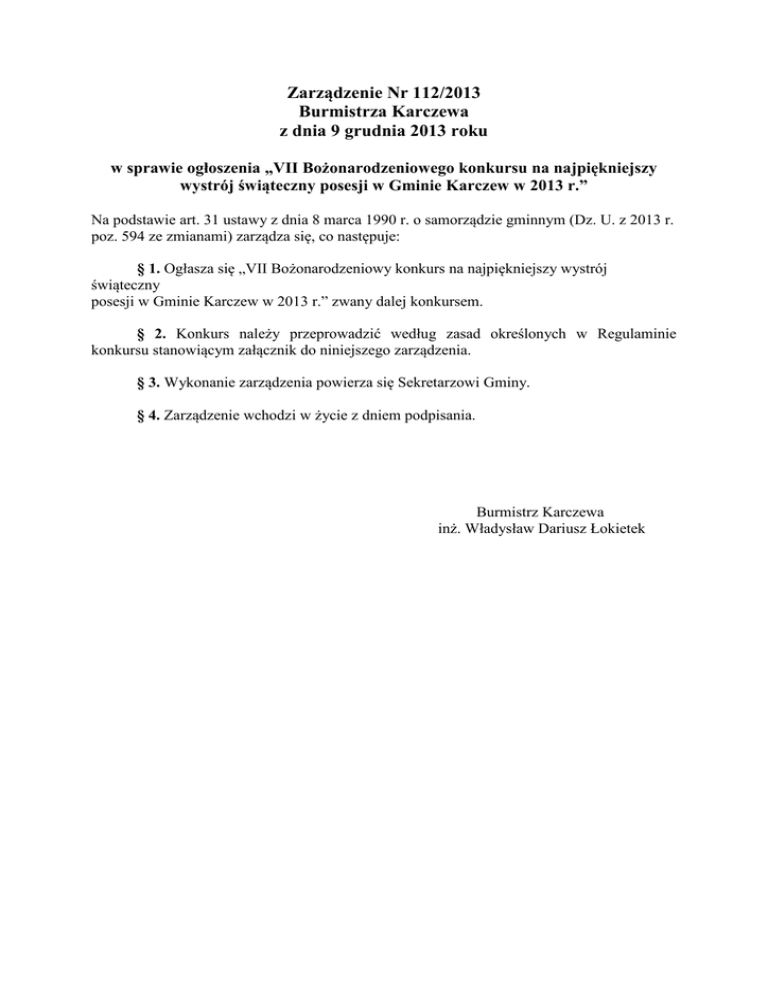 Zarządzenie Nr 112/2013 Burmistrza Karczewa z dnia 9 grudnia 2013 roku w sprawie ogłoszenia „VII Bożonarodzeniowego konkursu na najpiękniejszy wystrój świąteczny posesji w Gminie Karczew w 2013 r.” Na podstawie art. 31 ustawy z dnia 8 marca 1990 r. o samorządzie gminnym (Dz. U. z 2013 r. poz. 594 ze zmianami) zarządza się, co następuje: § 1. Ogłasza się „VII Bożonarodzeniowy konkurs na najpiękniejszy wystrój świąteczny posesji w Gminie Karczew w 2013 r.” zwany dalej konkursem. § 2. Konkurs należy przeprowadzić według zasad określonych w Regulaminie konkursu stanowiącym załącznik do niniejszego zarządzenia. § 3. Wykonanie zarządzenia powierza się Sekretarzowi Gminy. § 4. Zarządzenie wchodzi w życie z dniem podpisania. Burmistrz Karczewa inż. Władysław Dariusz Łokietek Załącznik do Zarządzenia Nr 112/2013 Burmistrza Karczewa z dnia 9 grudnia 2013 r. Regulamin „VII Bożonarodzeniowego konkursu na najpiękniejszy wystrój świąteczny posesji w Gminie Karczew 2013 r.” I. Cel konkursu: 1. Wyłonienie najładniejszej i najciekawszej dekoracji świątecznej zainstalowanej na terenie posesji. 2. Wzbogacenie i uatrakcyjnienie wizerunku Gminy Karczew w okresie świąt Bożego Narodzenia i Nowego Roku. 3. Promocja pomysłowości oraz nowatorskich rozwiązań dekoracyjnych, mających na celu podkreślenie estetycznego wizerunku posesji. 4. Inspirowanie mieszkańców Gminy do współtworzenia atmosfery świąt Bożego Narodzenia poprzez dekorowanie swoich posesji oświetleniem świątecznym. II. Organizatorzy konkursu: 1. Organizatorem konkursu jest Burmistrz Karczewa. 2. W imieniu Burmistrza Karczewa prace związane z konkursem koordynuje Wydział Organizacji i Nadzoru. III. Termin przeprowadzenia konkursu: Od 16 grudnia 2013 roku do 3 stycznia 2014 roku. IV. Uczestnicy konkursu: 1. Udział w konkursie mogą brać właściciele, najemcy lub dzierżawcy posesji oraz instytucje z terenu Gminy Karczew. 2. W konkursie nie mogą brać udziału Laureaci V i VI Bożonarodzeniowego konkursu na najpiękniejszy wystrój świąteczny posesji w Gminie Karczew. 3. W konkursie nie mogą brać udziału pracownicy Urzędu Miejskiego w Karczewie. V. Tryb zgłaszania nieruchomości do konkursu: 1. Do konkursu można zgłosić dekorację świąteczną: 1) budynków indywidualnych, 2) ogródków przydomowych, 3) ogrodzeń przydomowych, 4) budynków użyteczności publicznej, np. tereny wokół restauracji, szkół, przedszkoli, kościołów, instytucji, 5) osiedli mieszkaniowych (spółdzielnie, wspólnoty, budynki komunalne). 2. Warunkiem udziału w konkursie jest dokonanie pisemnego zgłoszenia do konkursu w nieprzekraczalnym terminie do dnia 3 stycznia 2014 roku na karcie zgłoszeniowej stanowiącej Załącznik nr 1 do niniejszego Regulaminu. 3. Wypełnione zgłoszenia należy składać w Biurze Obsługi Mieszkańców Urzędu Miejskiego w Karczewie w godz. od 800 do 1600. 4. Karty zgłoszeniowe dostępne są w Biurze Obsługi Mieszkańców Urzędu Miejskiego w Karczewie w godz. od 800 do 1600 oraz na stronie internetowej Gminy Karczew. 5. Zgłoszenie do konkursu jest równoznaczne ze zgodą na oględziny posesji, a także prezentację zgłoszonego obiektu i dekoracji oraz danych osobowych zgłaszającego w mediach. 6. Uczestnicy są zobowiązani do przechowywania kopii karty zgłoszeniowej, z potwierdzeniem jej złożenia w Urzędzie Miejskim, do czasu rozstrzygnięcia konkursu. VI. Warunki przeprowadzenia konkursu: 1. Organizator konkursu zastrzega sobie prawo do odstąpienia od przeprowadzenia konkursu jeżeli nie wpłyną do Urzędu Miejskiego w Karczewie co najmniej 2 zgłoszenia. 2. Organizator konkursu zastrzega sobie prawo do nie rozpatrywania zgłoszeń, które wpłyną do Urzędu Miejskiego po terminie wskazanym w niniejszym Regulaminie. 3. Ostateczną decyzję w sprawie przeprowadzenia lub odstąpienia od przeprowadzenia konkursu podejmuje Komisja Konkursowa. 4. Decyzja komisji konkursowej jest ostateczna i nie podlega odwołaniu. VII. Kryteria oceny: 1. Staranność wykonania. 2. Innowacyjność dekoracji i pomysł na ozdobienie posesji. 3. Nawiązanie do tradycji świąteczno – noworocznej. 4. Kompozycja przestrzenna. 5. Walory estetyczne. VIII. Komisja konkursowa: 1. Oceny posesji dokonywać będzie Komisja Konkursowa w składzie: 1) Przewodniczący – Ilona Burkowska, 2) Członek – Marta Okońska, 3) Członek – Anna Sikora. 2. Komisja konkursowa dokona indywidualnej oceny na Karcie oceny, stanowiącej załącznik nr 2 do niniejszego Regulaminu. Przyjmuje się skalę ocen od 1 do 10 punktów. Ocena ostateczna jest wyliczoną średnią arytmetyczną ocen punktowych poszczególnych członków komisji. W przypadku równej ilości punktów decyduje głos Przewodniczącego Komisji. 3. Posesja, która zostanie najwyżej oceniona otrzyma tytuł „Najładniejszego Bożonarodzeniowego Wystroju na terenie Gminy Karczew w roku 2013”, a zgłaszający otrzyma nagrodę Burmistrza Karczewa. 4. Komisja konkursowa ogłosi wyniki konkursu do 10 stycznia 2014 r. IX. Rozstrzygnięcie konkursu: 1. Wyniki konkursu ogłoszone zostaną na stronie internetowej Gminy Karczew. 2. Zwycięzcy konkursu o terminie i miejscu wręczenia nagród zostaną powiadomieni telefonicznie. X. Postanowienia końcowe: Dodatkowe informacje o konkursie można uzyskać w Wydziale Organizacji i Nadzoru Urzędu Miejskiego w Karczewie pod nr tel. (22) 780 65 16 wewn. 104 Burmistrz Karczewa inż. Władysław Dariusz Łokietek Załącznik nr 1 do Regulaminu Imię i nazwisko zgłaszającego ……………………………………………………………… KARTA ZGŁOSZENIOWA DO „VII BOŻONARODZENIOWEGO KONKURSU NA NAJPIĘKNIEJSZY WYSTRÓJ ŚWIĄTECZNY POSESJI W GMINIE KARCZEW W ROKU 2013” Dane kandydata Adres (ulica, nr budynku) Tytuł prawny do lokalu mieszkalnego UWAGI PESEL …………………….… Nr dowodu osobistego ………………………. Nr NIP …………………