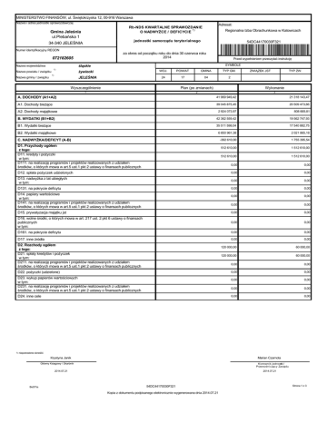 MINISTERSTWO FINANSÓW, ul. Świętokrzyska 12, 00-916 Warszawa Nazwa i adres jednostki sprawozdawczej Gmina Jeleśnia ul.Plebańska 1 Numer identyfikacyjny REGON Nazwa województwa Nazwa powiatu / związku Nazwa gminy / związku śląskie WOJ. JELEŚNIA 1) 24 Wyszczególnienie A. DOCHODY (A1+A2) 54DC44170030F321 za okres od początku roku do dnia 30 czerwca roku 2014 żywiecki 1) Regionalna Izba Obrachunkowa w Katowicach jednostki samorządu terytorialnego 34-340 JELEŚNIA 072182605 Adresat: Rb-NDS KWARTALNE SPRAWOZDANIE 1) O NADWYŻCE / DEFICYCIE POWIAT Przed wypełnieniem przeczytać instrukcję SYMBOLE GMINA 17 TYP GM. 04 2 Plan (po zmianach) 1 2 A1. Dochody bieżące ZWIĄZEK JST TYP ZW. Wykonanie 41 969 949,42 3 39 045 875,45 A2. Dochody majątkowe 21 318 143,47 20 509 473,66 B. WYDATKI (B1+B2) 2 924 073,97 808 669,81 42 362 559,42 19 562 747,93 B2. Wydatki majątkowe 35 511 598,04 17 540 882,75 6 850 961,38 2 021 865,18 -392 610,00 1 755 395,54 512 610,00 1 512 610,00 512 610,00 1 512 610,00 0,00 0,00 0,00 0,00 0,00 0,00 0,00 0,00 0,00 0,00 0,00 0,00 0,00 0,00 0,00 0,00 0,00 0,00 0,00 0,00 120 000,00 60 000,00 120 000,00 60 000,00 0,00 0,00 0,00 0,00 0,00 0,00 0,00 0,00 0,00 0,00 B1. Wydatki bieżące C. NADWYŻKA/DEFICYT (A-B) D1. Przychody ogółem z tego: D11. kredyty i pożyczki w tym: D111. na realizację programów i projektów realizowanych z udziałem środków, o których mowa w art.5 ust.1 pkt 2 ustawy o finansach publicznych D12. spłata pożyczek udzielonych D13. nadwyżka z lat ubiegłych w tym: D131. na pokrycie deficytu D14. papiery wartościowe w tym: D141. na realizację programów i projektów realizowanych z udziałem środków, o których mowa w art.5 ust.1 pkt 2 ustawy o finansach publicznych D15. prywatyzacja majątku jst D16. wolne środki, o których mowa w art. 217 ust. 2 pkt 6 ustawy o finansach publicznych w tym: D161. na pokrycie deficytu D17. inne źródła D2. Rozchody ogółem z tego: D21. spłaty kredytów i pożyczek w tym: D211. na realizację programów i projektów realizowanych z udziałem środków, o których mowa w art.5 ust.1 pkt 2 ustawy o finansach publicznych D22. pożyczki (udzielone) D23. wykup papierów wartościowych w tym: D231. na realizację programów i projektów realizowanych z udziałem środków, o których mowa w art.5 ust.1 pkt 2 ustawy o finansach publicznych D24. inne cele 1) niepotrzebne skreślić Krystyna Janik Marian Czarnota Główny Księgowy / Skarbnik Kierownik jednostki / Przewodnic ząc y Zarządu 2014.07.21 BeSTia 2014.07.21 54DC44170030F321 Kopia z dokumentu podpisanego elektronicznie wygenerowana dnia 2014.07.21 Strona 1 z 3 Dane uzupełniające: E. Finansowanie deficytu, zgodnie z art. 217 ust. 2 ustawy o finansach publicznych Wyszczególnienie Plan (po zmianach) 1 2) 2 E. FINANSOWANIE DEFICYTU (E1+E2+E3+E4+E5) 4) z tego: E1. sprzedaż papierów wartościowych wyemitowanych przez jednostkę samorządu terytorialnego E2. kredyty i pożyczki E3. prywatyzacja majątku jednostki samorządu terytorialnego Wykonanie 392 610,00 jednostki wypełniają za I, II, III i IV kwartał 4) wypełniają jednostki, w których planowana lub wykonana różnica między dochodami a wydatkami jest ujemna 0,00 0,00 392 610,00 0,00 0,00 0,00 0,00 0,00 0,00 0,00 E5. wolne środki jako nadwyżka środków pieniężnych na rachunku bieżącym budżetu jednostki samorządu terytorialnego, wynikających z rozliczeń wyemitowanych papierów wartościowych, kredytów i pożyczek z lat ubiegłych 3) 3 0,00 E4. nadwyżka budżetu jednostki samorządu terytorialnego z lat ubiegłych 2) 3) jednostki wypełniają tylko za IV kwartał F. Dane uzupełniające do wyliczenia relacji, o których mowa w art. 242 i 243 ustawy o finansach publicznych Wyszczególnienie Plan (po zmianach) 1 F1. Łączna kwota wyłączeń z relacji, o której mowa w art. 243 ust. 1 ustawy o finansach publicznych w okresie sprawozdawczym w tym: F11. kwota wyłączeń, o których mowa w art. 243 ust. 3 ustawy o finansach publicznych F12. kwota wyłączeń, o których mowa w art. 243 ust. 3a ustawy o finansach publicznych F13. wykup papierów wartościowych, spłata kredytów i pożyczek zaciągniętych na spłatę przejętych zobowiązań samodzielnego publicznego zakładu opieki zdrowotnej F14. wykup obligacji nominowanych w walutach obcych wyemitowanych na zagraniczne rynki przed 1 stycznia 2010 r. F2. Zobowiązania związku współtworzonego przez jednostkę samorządu terytorialnego przypadające do spłaty w roku budżetowym F3. Kwota związana z realizacją wydatków bieżących, o których mowa w art. 242 ustawy o finansach publicznych F4. Kwota wydatków bieżących ponoszonych na spłatę przejętych zobowiązań samodzielnego publicznego zakładu opieki zdrowotnej przekształconego na zasadach określonych w ustawie o działalności leczniczej Krystyna Janik 3 748 282,20 0,00 748 282,20 0,00 0,00 0,00 0,00 0,00 0,00 0,00 0,00 0,00 258 134,11 82 155,32 0,00 0,00 Marian Czarnota Główny Księgowy / Skarbnik Kierownik jednostki / Przewodnic ząc y Zarządu 2014.07.21 2014.07.21 BeSTia Wykonanie 2 54DC44170030F321 Kopia z dokumentu podpisanego elektronicznie wygenerowana dnia 2014.07.21 Strona 2 z 3 Wyjaśnienia do sprawozdania Rb-NDS Krystyna Janik Marian Czarnota Główny Księgowy / Skarbnik Kierownik jednostki / Przewodnic ząc y Zarządu 2014.07.21 2014.07.21 BeSTia 54DC44170030F321 Kopia z dokumentu podpisanego elektronicznie wygenerowana dnia 2014.07.21 Strona 3 z 3