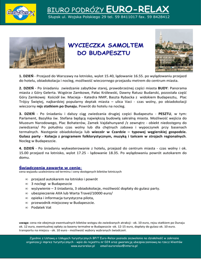 BIURO PODRÓŻY EURO-RELAX Słupsk ul. Wojska Polskiego 29 tel. 59 8411017 fax. 59 8428412 WYCIECZKA SAMOLTEM DO BUDAPESZTU 1. DZIEŃ - Przejazd do Warszawy na lotnisko, wylot 15.40, lądowanie 16.55. po wylądowaniu przejazd do hotelu, obiadokolacja i nocleg, możliwość wieczornego przejazdu metrem do centrum miasta. 2. DZIEŃ - Po śniadaniu zwiedzanie zabytków starej, prawobrzeżnej części miasta BUDY: Panorama miasta z Góry Gelerta. Wzgórze Zamkowe, Pałac Królewski, Dawny Ratusz Budanski, pozostała część Góry Zamkowej Kościół św. Macieja - Katedra NMP, Baszta Rybacka z widokiem Budapesztu, Plac Trójcy Świętej, najbardziej popularny deptak miasta – ulica Vaci - czas wolny, po obiadokolacji wieczorny rejs statkiem po Dunaju. Powrót do hotelu na nocleg. 3. DZIEŃ - Po śniadaniu i dalszy ciąg zwiedzania drugiej części Budapesztu - PESZTU, w tym: Parlament, Bazylika św. Stefana będącą największą budowlą sakralną miasta. Możliwość wejścia do Muzeum Narodowego, Plac Bohaterów, Zamek Vajdahunyand /z zewnątrz - obiekt niedostępny do zwiedzania/ Po południu czas wolny lub dla chętnych zabawa i wypoczynek przy basenach termalnych. Następnie obiadokolacja lub wieczór w Czardzie – typowej węgierskiej gospodzie. Gulasz party - Kolacja z programem folklorystycznym, muzyką i tańcem w strojach regionalnych. Nocleg w Budapeszcie. 4. DZIEŃ - Po śniadaniu wykwaterowanie z hotelu, przejazd do centrum miasta - czas wolny i ok. 15.00 przejazd na lotnisko, wylot 17.25 - lądowanie 18.35. Po wylądowaniu powrót autokarem do domu. Świadczenia zawarte w cenie: cena wyjazdu uzależniona od terminu i ceny dostępnych biletów lotniczych • • • • • • • przejazd autokarem na lotnisko i powrót 3 noclegi w Budapeszcie wyżywienie – 3 śniadania, 3 obiadokolacje, możliwość dopłaty do gulasz party. ubezpieczenie AXA lub Warta Travel/10000 euro/ opieka i informacja turystyczna pilota, przewodnik miejscowy w Budapeszcie. Podatek Vat uwaga: cena nie obejmuje ewentualnych biletów wstępu do zwiedzanych atrakcji - ok. 10 euro, rejsu statkiem po Dunaju ok. 12 euro, ewentualnej opłaty za baseny termalne w Budapeszcie -ok. 12-15 euro, dopłaty do gulasz ok. 10 euro. transportu na miejscu - ok. 10 euro - możliwość wybory wybranych świadczeń. Zgodnie z Ustawą o Usługach turystycznych BPiT Euro-Relax posiada zezwolenie na działalność w zakresie organizacji imprez turystycznych - wpis do rejestru nr 024 oraz gwarancję ubezpieczeniową na rzecz klientów www.eurorelax.pl email:[email protected]