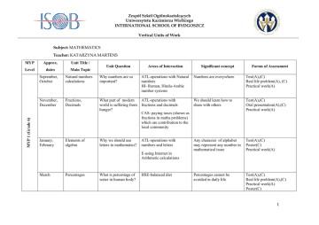 Zespół Szkół Ogólnokształcących Uniwersytetu Kazimierza Wielkiego INTERNATIONAL SCHOOL OF BYDGOSZCZ Vertical Units of Work Subject: MATHEMATICS Teacher: KATARZYNA MARTENS Approx. Unit Title / Level dates Main Topic MYP 1 (Grade 6) MYP Unit Question Areas of Interaction Significant concept Forms of Assessment September, October Natural numbers calculations Why numbers are so important? ATL-operations with Natural numbers HI- Roman, Hindu-Arabic number systems Numbers are everywhere Test(A),(C) Real life problem(A), (C) Practical work(A) November, December Fractions, Decimals What part of modern world is suffering from hunger? ATL-operations with fractions and decimals We should learn how to share with others Test(A),(C) Oral presentation(A),(C) Practical work(A) Why we should use letters in mathematics? ATL-operations with numbers and letters Any character of alphabet may represent any number in mathematical issue Test(A),(C) Poster(C) Practical work(A) Percentages cannot be avoided in daily life Test(A),(C) Real life problem(A),(C) Practical work(A) Poster(C) January, February Elements of algebra CAS- paying taxes (shown as fractions in maths problems) which are contribution to the local community E-using Internet in Arithmetic calculations March Percentages What is percentage of water in human body? HSE-balanced diet 1 Zespół Szkół Ogólnokształcących Uniwersytetu Kazimierza Wielkiego INTERNATIONAL SCHOOL OF BYDGOSZCZ MYP 2 (Grade 7) Vertical Units of Work April, May Polygons Where we can observe polygons in our environment? E- using Internet in Arithmetic calculations; planning landscaping Geometry inspires Test(A),(C) Real life problem(A),(C) Practical work(A) June 3D-shapes – Right Right prisms behind Prisms my window…Can I spot them? E- developing practical projects such as: designing/making models of real or imagined buildings HI-pictograms as a form of nonverbal communication, history of calculating machines; universality of maths language We live in three dimensional reality Test(A),(C) Real life problem(A), (C) Practical work(A) September Positive Rational Numbers-number calculations Do numbers help in verbal communication? Numbers as the form of communication Test(A),(C) Poster(C) Investigation(B), (C), (D) October, November Types and Constructions of 2D-shapes How to calculate the area and perimeter of the playground near to the school? HI- developing maths ideas such as symmetry in geometry; investigating links between geometry and shapes and motifs of different cultures Understanding geometric relations is one of the methods of understanding world construction Test(A),(C) Essay(A) Practical work(A) December, January 3D-shapes (solids) – properties What are greatest geometrical projects which are known to us? E-developing practical projects, town planning, making models of real/imagined buildings Geometrical projects might respond the needs of local environments Test(A)(C) Practical work(A) Essay(A) Investigation (B),(C),(D) February Percentages. Sharing in given Ratio Is it possible to estimate the percentage of fat in daily diet? ATL-calculating percentages, sharing in given ratio, proportional values Percentages are in service of healthy living Test(A),(C) Practical work(A) Essay(A) HSE-balanced diet 2 Zespół Szkół Ogólnokształcących Uniwersytetu Kazimierza Wielkiego INTERNATIONAL SCHOOL OF BYDGOSZCZ Vertical Units of Work MYP 3 (Grade 8) MYP 2 March, April Introduction to Algebra What is the algebraic savoir-vivre? ATL-transformations of algebraic expressions Algebra as the way of codifying information Test(A), (C) Practical work(A) Exhibition (A), (C),(D) HI- universality of maths language; creating mortgage plans- using algebraic equations May, June Coordinates, Graphs How to find out the position of an object on the diagram? CAS-analysing articles related to social issues and drawing graphs; using tests to measure fitness of different groups of a community- analysing results Social issues might be shown using graphs Test(A),(C) Poster(C) September Real Numbers Why use calculators? HSE- calculating number of eaten calories Calculating machines in service of humans October Percentages and their usage How do we calculate percentages? HI- compound interestpercentages in taking mortgage credits; universality of maths language Information related to daily life might be coded in percentage diagrams Test(A), (C) Poster(C) Investigation(B),(C), (D) Test(A),(C) Poster(C) Investigation(B),(C),(D) November, December Elements of Algebra How to keep balance in equation? CAS- using equations in problems related to public transport and travel; using proportion to show relation between fitness of different groups of a community We should know how to keep the balance to live healthy life Test(A),(C) Poster(C) Investigation(B),(C),(D) 3 Zespół Szkół Ogólnokształcących Uniwersytetu Kazimierza Wielkiego INTERNATIONAL SCHOOL OF BYDGOSZCZ MYP 3 Vertical Units of Work January, February Plane geometry What are the properties of 2Dshapes? E- using Internet in Arithmetic calculations; planning landscaping; using modelling to predict or interpret natural patterns such as rising sea levels due to global warming; drawing graphs in exchange calculations Humans use geometry to plan and influence environments Test(A),(C) Poster(C) Investigation(B),(C),(D) Opened-ended questions(A),(C),(D) March, April Axial symmetry What characterizes symmetrical objects? HI- universality of maths language; creating tessellations Everything what’s beautiful is symmetrical Test(A),(C) Investigation(B),(C),(D) May, June Collection and organization of data What is statistical student like? ATL- developing statistical data, calculating probability Statistic can inform as well as mislead Test(A),(C) Investigation(B),(C),(D) Opened-ended questions(A),(C),(D) HSE- using observation, a data analysis and statistics to promote a road safety campaign around the school 4 Zespół Szkół Ogólno