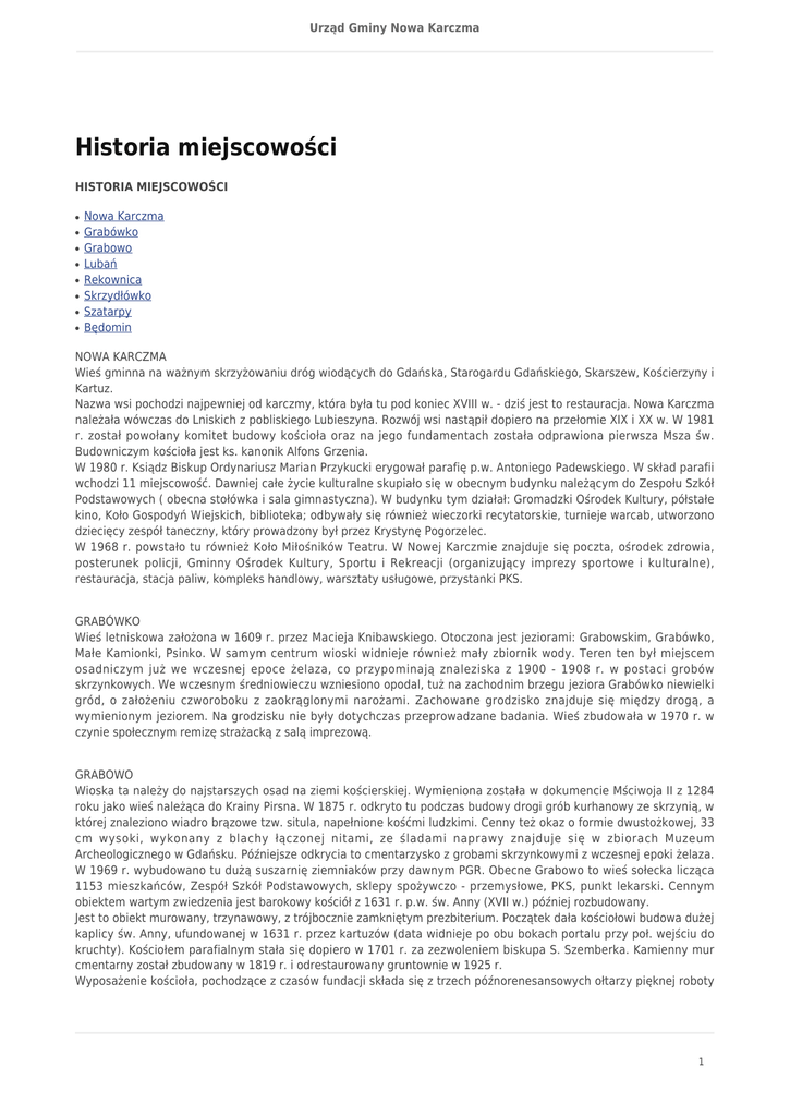 Urząd Gminy Nowa Karczma Historia miejscowości HISTORIA MIEJSCOWOŚCI ● ● ● ● ● ● ● ● Nowa Karczma Grabówko Grabowo Lubań Rekownica Skrzydłówko Szatarpy Będomin NOWA KARCZMA Wieś gminna na ważnym skrzyżowaniu dróg wiodących do Gdańska, Starogardu Gdańskiego, Skarszew, Kościerzyny i Kartuz. Nazwa wsi pochodzi najpewniej od karczmy, która była tu pod koniec XVIII w. - dziś jest to restauracja. Nowa Karczma należała wówczas do Lniskich z pobliskiego Lubieszyna. Rozwój wsi nastąpił dopiero na przełomie XIX i XX w. W 1981 r. został powołany komitet budowy kościoła oraz na jego fundamentach została odprawiona pierwsza Msza św. Budowniczym kościoła jest ks. kanonik Alfons Grzenia. W 1980 r. Ksiądz Biskup Ordynariusz Marian Przykucki erygował parafię p.w. Antoniego Padewskiego. W skład parafii wchodzi 11 miejscowość. Dawniej całe życie kulturalne skupiało się w obecnym budynku należącym do Zespołu Szkół Podstawowych ( obecna stołówka i sala gimnastyczna). W budynku tym działał: Gromadzki Ośrodek Kultury, półstałe kino, Koło Gospodyń Wiejskich, biblioteka; odbywały się również wieczorki recytatorskie, turnieje warcab, utworzono dziecięcy zespół taneczny, który prowadzony był przez Krystynę Pogorzelec. W 1968 r. powstało tu również Koło Miłośników Teatru. W Nowej Karczmie znajduje się poczta, ośrodek zdrowia, posterunek policji, Gminny Ośrodek Kultury, Sportu i Rekreacji (organizujący imprezy sportowe i kulturalne), restauracja, stacja paliw, kompleks handlowy, warsztaty usługowe, przystanki PKS. GRABÓWKO Wieś letniskowa założona w 1609 r. przez Macieja Knibawskiego. Otoczona jest jeziorami: Grabowskim, Grabówko, Małe Kamionki, Psinko. W samym centrum wioski widnieje również mały zbiornik wody. Teren ten był miejscem osadniczym już we wczesnej epoce żelaza, co przypominają znaleziska z 1900 - 1908 r. w postaci grobów skrzynkowych. We wczesnym średniowieczu wzniesiono opodal, tuż na zachodnim brzegu jeziora Grabówko niewielki gród, o założeniu czworoboku z zaokrąglonymi narożami. Zachowane grodzisko znajduje się między drogą, a wymienionym jeziorem. Na grodzisku nie były dotychczas przeprowadzane badania. Wieś zbudowała w 1970 r. w czynie społecznym remizę strażacką z salą imprezową. GRABOWO Wioska ta należy do najstarszych osad na ziemi kościerskiej. Wymieniona została w dokumencie Mściwoja II z 1284 roku jako wieś należąca do Krainy Pirsna. W 1875 r. odkryto tu podczas budowy drogi grób kurhanowy ze skrzynią, w której znaleziono wiadro brązowe tzw. situla, napełnione kośćmi ludzkimi. Cenny też okaz o formie dwustożkowej, 33 cm wysoki, wykonany z blachy łączonej nitami, ze śladami naprawy znajduje się w zbiorach Muzeum Archeologicznego w Gdańsku. Późniejsze odkrycia to cmentarzysko z grobami skrzynkowymi z wczesnej epoki żelaza. W 1969 r. wybudowano tu dużą suszarnię ziemniaków przy dawnym PGR. Obecne Grabowo to wieś sołecka licząca 1153 mieszkańców, Zespół Szkół Podstawowych, sklepy spożywczo - przemysłowe, PKS, punkt lekarski. Cennym obiektem wartym zwiedzenia jest barokowy kościół z 1631 r. p.w. św. Anny (XVII w.) później rozbudowany. Jest to obiekt murowany, trzynawowy, z trójbocznie zamkniętym prezbiterium. Początek dała kościołowi budowa dużej kaplicy św. Anny, ufundowanej w 1631 r. przez kartuzów (data widnieje po obu bokach portalu przy poł. wejściu do kruchty). Kościołem parafialnym stała się dopiero w 1701 r. za zezwoleniem biskupa S. Szemberka. Kamienny mur cmentarny został zbudowany w 1819 r. i odrestaurowany gruntownie w 1925 r. Wyposażenie kościoła, pochodzące z czasów fundacji składa się z trzech późnorenesansowych ołtarzy pięknej roboty 1 Urząd Gminy Nowa Karczma snycerskiej, zapewne dzieło mnichów kartuskich. W głównym ołtarzu duży obraz z pierwszej połowy XVII w. We wnęce prezbiterium znajduje się rzeźba „Ukrzyżowanie” z XVIII w. Przed kościołem znajduje się grobowiec ks. Jana Cichockiego, działacza społecznego. W Grabowie znajdują się również pomniki przyrody: klon pospolity właściciel Gabriela Wińczewska, 2 klony pospolite właściciel Parafia Rzymsko Katolicka (przy plebani, oznakowane tabliczkami), klon pospolity właściciele H. M. Tyczyńscy. LUBAŃ W latach 1945 - 1946 i 1956 znaleziono tu cmentarzysko, a w grobach kilka popielnic. Groby skrzynkowe pochodzące z 650 -110 w. p.n.e. znaleziono je w czterech miejscach. Pierwszy zapis o tej wsi pochodzi 1294r. W XVI - XVII w. siedzieli na tutejszych włościach drobni szlachcice: obok Lubańskich Jezierscy, Poczerniccy, Węsierscy. Obecny Lubań to 953 mieszkańców; trzy sklepy spożywczo - przemysłowe; Ośrodek Doradztwa Rolniczego (ODR zakład budżetowy); „Tojan” sp. z o.o.; Technikum Żywienia z internatem, który został zbudowany jako hotel dla kilkudziesięciu osób przybywających z okolicznych powiatów na szkolenia, konsultacje, kursy itp. agromów gromadzkich czy innych chętnych wzbogacenia swej wiedzy rolniczej; Zespół Szkół Podstawowych; kościół wzniesiony w 1987 r. p.w. św. Piotra i Pawła (filia parafii w Rekownicy). Na drodze prowadzącej z Lubania do Liniewka znajduje się grób nieznanego żołnierza poległego podczas drugiej wojny światowej. W pobliskim lesie znajduje się bardzo stara sosna (mieszkańcy twierdzą, że ma ona około 100 lat). W Lubaniu w 1997 r. rozpoczęto budowę gminnej oczyszczalni ścieków, a we wrześniu w 1999 r. została ona uruchomiona. Dwa razy w roku organizowane są przez ODR targi rolnicze. REKOWNICA Mała miejscowość sołecka licząca 134 mieszkańców. Cennymi obiektami wartymi zwiedzenia to młyn, który ma prawdopodobnie (wg mieszkańców) ponad 100 lat; kościół z 1904r. Od starszych ludzi można dowiedzieć się, że na tym miejscu gdzie obecnie stoi kościół - był kościół z lepianki, później drewniany i w zależnośc