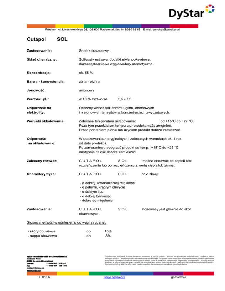 Perskór ul. Limanowskiego 95, 26-600 Radom tel./fax: 048/369 98 65 E-mail: [email protected] Cutapol SOL Zastosowanie: Środek tłuszczowy . Skład chemiczny: Sulfonaty estrowe, dodatki etylenooksydowe, dużocząsteczkowe węglowodory aromatyczne. Koncentracja: ok. 65 % Barwa - konsystencja: żółta - płynna Jonowość: anionowy Wartość pH: w 10 % roztworze: Odporność na elektrolity: Odporny wobec soli chromu, glinu, anionowych i niejonowych tensydów w koncentracjach zwyczajowych. Warunki składowania: Zalecana temperatura składowania: od +15°C do +27 °C. Poza tym przedziałem temperatur produkt może zmętnieć. Przed pobraniem próbki lub użyciem produkt dobrze zamieszać. Odporność na składowanie: W opakowaniach oryginalnych i zalecanych warunkach ok. 1 rok od daty produkcji. Po zamarznięciu podgrzać produkt do temp. +15°C do +25 °C, następnie całość dobrze zamieszać. Zalecany roztwór: CUTAPOL SOL można dodawać do kąpieli bez rozcieńczania lub po rozcieńczeniu z wodą ciepłą lub zimną. Charakterystyka: CUTAPOL 5,5 - 7,5 SOL daje skóry: - o dobrej, równomiernej miękkości - o pełnym, krągłym chwycie - o ścisłym licu - o dobrej barwności - dobre do międlenia Zastosowanie: CUTAPOL obuwiowych. SOL stosowany jest głównie do skór Stosowane ilości w odniesieniu do wagi struganej. - skóry obuwiowe - nappa obuwiowa DyStar Textilfarben GmbH & Co. Deutschland KG. Isardamm 79-83 82538 Geretsried, Deutschland Telefon: ++49 (0) 8171 - 628 - 417 Fax: ++49 (0) 8171 - 628 - 396 [email protected] www.dystar.com L 816 b do do 10% 8% Przedstawione informacje i nasze doradztwo techniczne w słowie, piśmie i poprzez pzreprowadzane doświadczenia wynikają z naszej najlepszej wiedzy, i służą jedynie jako niezobowiązujące wskazówki. Doradztwo nasze nie zwalnia od przeprowadzania własnych prób celem weryfikacji oferowanych środków pomocniczych tudzież celów i metod ich zastosowania. Stosowanie, przetwarzanie i przerób naszych środków w celu wytworzenia nowych produktów pozostaje poza naszym zasięgiem kontroli i podlega wyłącznie Państwa odpowiedzialności. Sprzedaż naszych produktów odbywa się zgodnie z ogólnie obowiązującymi warunkami sprzedaży i dostaw. www.perskor.pl garbarstwo Perskór ul. Limanowskiego 95, 26-600 Radom tel./fax: 048/369 98 65 E-mail: [email protected] Skóra obuwiowa, dogarbowana roślinnie-syntanowo Grubość: 1,8 - 2,0 mm Proces % Produkt Płukanie Neutralizacja Dogarbowanie 300 0,3 100,0 1,0 1,0 1,0 4,0 4,0 4,0 1,0 1,0 woda kwas szczawiowy woda TANNIT CUTAPOL MACROL TANNIT mimoza quebracho CUTAPOL MACROL Symbol ex wet-blue Temp. Czas 30 15 30 KNS SOL RKL LP 1 30 L 816 b pH 4,4 10 20 60 SOL RKL 100,0 woda 45 0,3 kwas mrówkowy 85% Płukanie 300,0 woda 20 1,0 Utanit (Benckiser) 413 Skóry wyłożyć na kozły i pozostawić przez noc, wyżąć, suszyć próżniowo, dosuszyć na powietrzu, klimatyzować, zmiękczyć. DyStar Textilfarben GmbH & Co. Deutschland KG. Isardamm 79-83 82538 Geretsried, Deutschland Telefon: ++49 (0) 8171 - 628 - 417 Fax: ++49 (0) 8171 - 628 - 396 [email protected] www.dystar.com pH/uwagi 60 10 15 20 przez noc rano pH 3,8 10 Przedstawione informacje i nasze doradztwo techniczne w słowie, piśmie i poprzez pzreprowadzane doświadczenia wynikają z naszej najlepszej wiedzy, i służą jedynie jako niezobowiązujące wskazówki. Doradztwo nasze nie zwalnia od przeprowadzania własnych prób celem weryfikacji oferowanych środków pomocniczych tudzież celów i metod ich zastosowania. Stosowanie, przetwarzanie i przerób naszych środków w celu wytworzenia nowych produktów pozostaje poza naszym zasięgiem kontroli i podlega wyłącznie Państwa odpowiedzialności. Sprzedaż naszych produktów odbywa się zgodnie z ogólnie obowiązującymi warunkami sprzedaży i dostaw. www.perskor.pl garbarstwo Perskór ul. Limanowskiego 95, 26-600 Radom tel./fax: 048/369 98 65 E-mail: [email protected] Przykłady zastosowań: Skóra obuwiowa Grubość: Proces 1,8 mm % Produkt Symbol ex wet-blue Temp. Czas pH/uwagi Płukanie 200,0 woda 45 0,5 kwas szczawiowy 30 Neutralizacja 120,0 woda 35 0,4 TANNIT LSW 1,2 mrówczan sodu 3,0 TANNIT KNS 40 100,0 woda 50 3,0 GAROVAL AP 30 1,0 mimoza 20 3,0 TANNIT VGS 3,0 Relugan (BASF) C 3,0 TANNIT VWL 40 Płukanie 300,0 woda 20 10 Natłuszczanie 80,0 woda 55 6,0 CUTAPOL SOL 0,8 MACROL RKL 60 0,5 kwas mrówkowy 85% 20 Płukanie 300,0 woda 20 10 Skóry wyłożyć na kozły i pozostawić przez noc, wyżąć, suszyć próżniowo,dosuszyć na powietrzu, klimatyzować, zmiękczyć. Skóra obuwiowa, crust Grubość: 2,0 mm Proces % Produkt Symbol ex wet-blue Temp. Czas pH 4,2 pH/uwagi Płukanie 300 woda 30 0,1 kwas mrówkowy 85% 10 Neutralizacja 150,0 woda 50 Dogarbowanie 2,0 TANNIT KNS 1,0 TANNIT LP 1 60 3,0 TANNIT VWL 60 2,0 TANNIT RES fl. 5,0 GAROVAL AP 60 0,5 kwas mrówkowy 85% 30 Płukanie 300,0 woda 50 10 Natłuszczanie 150,0 woda 50 2,0 MACROL RKL 4,0 CUTAPOL SOL 3,0 PLUVION L 90 45 0,5 kwas mrówkowy 85% 30 Płukanie 200,0 woda 20 10 Skóry wyłożyć na kozły i pozostawić przez noc, wyżąć, suszyć próżniowo,dosuszyć na powietrzu, klimatyzować, zmiękczyć. DyStar Textilfarben GmbH & Co. Deutschland KG. Isardamm 79-83 82538 Geretsried, Deutschland Telefon: ++49 (0) 8171 - 628 - 417 Fax: ++49 (0) 8171 - 628 - 396 [email protected] www.dystar.com L 816 b pH 4,5 # pH 4,4 pH 5,0 pH 4,0 pH 3,8 Przedstawione informacje i nasze doradztwo techniczne w słowie, piśmie i poprzez pzreprowadzane doświadczenia wynikają z naszej najlepszej wiedzy, i służą jedynie jako niezobowiązujące wskazówki. Doradztwo nasze nie zwalnia od przeprowadzania własnych prób celem weryfikacji oferowanych środków pomocniczych tudzież celów i metod ich zastosowania. Stosowanie, przetwarzanie i przerób naszych środków w celu wytworzenia nowych produktów pozostaje poza naszym zasięgiem kontroli i podlega wyłącznie Państwa odpowiedzialności. Sprzedaż naszych produktów odbywa 