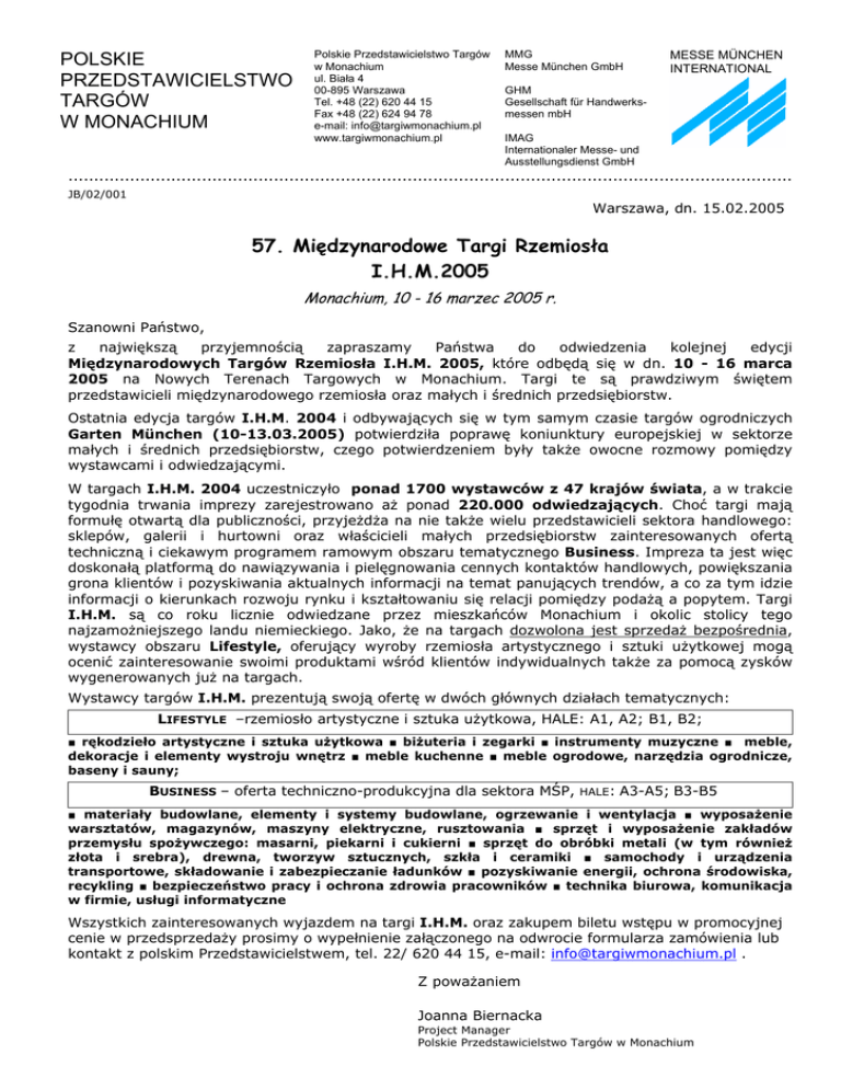 POLSKIE PRZEDSTAWICIELSTWO TARGÓW W MONACHIUM Polskie Przedstawicielstwo Targów w Monachium ul. Biała 4 00-895 Warszawa Tel. +48 (22) 620 44 15 Fax +48 (22) 624 94 78 e-mail: [email protected] www.targiwmonachium.pl MMG Messe München GmbH MESSE MÜNCHEN INTERNATIONAL GHM Gesellschaft für Handwerksmessen mbH IMAG Internationaler Messe- und Ausstellungsdienst GmbH ............................................................................................................................................. JB/02/001 Warszawa, dn. 15.02.2005 57. Międzynarodowe Targi Rzemiosła I.H.M.2005 Monachium, 10 - 16 marzec 2005 r. Szanowni Państwo, z największą przyjemnością zapraszamy Państwa do odwiedzenia kolejnej edycji Międzynarodowych Targów Rzemiosła I.H.M. 2005, które odbędą się w dn. 10 - 16 marca 2005 na Nowych Terenach Targowych w Monachium. Targi te są prawdziwym świętem przedstawicieli międzynarodowego rzemiosła oraz małych i średnich przedsiębiorstw. Ostatnia edycja targów I.H.M. 2004 i odbywających się w tym samym czasie targów ogrodniczych Garten München (10-13.03.2005) potwierdziła poprawę koniunktury europejskiej w sektorze małych i średnich przedsiębiorstw, czego potwierdzeniem były także owocne rozmowy pomiędzy wystawcami i odwiedzającymi. W targach I.H.M. 2004 uczestniczyło ponad 1700 wystawców z 47 krajów świata, a w trakcie tygodnia trwania imprezy zarejestrowano aż ponad 220.000 odwiedzających. Choć targi mają formułę otwartą dla publiczności, przyjeżdża na nie także wielu przedstawicieli sektora handlowego: sklepów, galerii i hurtowni oraz właścicieli małych przedsiębiorstw zainteresowanych ofertą techniczną i ciekawym programem ramowym obszaru tematycznego Business. Impreza ta jest więc doskonałą platformą do nawiązywania i pielęgnowania cennych kontaktów handlowych, powiększania grona klientów i pozyskiwania aktualnych informacji na temat panujących trendów, a co za tym idzie informacji o kierunkach rozwoju rynku i kształtowaniu się relacji pomiędzy podażą a popytem. Targi I.H.M. są co roku licznie odwiedzane przez mieszkańców Monachium i okolic stolicy tego najzamożniejszego landu niemieckiego. Jako, że na targach dozwolona jest sprzedaż bezpośrednia, wystawcy obszaru Lifestyle, oferujący wyroby rzemiosła artystycznego i sztuki użytkowej mogą ocenić zainteresowanie swoimi produktami wśród klientów indywidualnych także za pomocą zysków wygenerowanych już na targach. Wystawcy targów I.H.M. prezentują swoją ofertę w dwóch głównych działach tematycznych: LIFESTYLE –rzemiosło artystyczne i sztuka użytkowa, HALE: A1, A2; B1, B2; ■ rękodzieło artystyczne i sztuka użytkowa ■ biżuteria i zegarki ■ instrumenty muzyczne ■ meble, dekoracje i elementy wystroju wnętrz ■ meble kuchenne ■ meble ogrodowe, narzędzia ogrodnicze, baseny i sauny; BUSINESS – oferta techniczno-produkcyjna dla sektora MŚP, HALE: A3-A5; B3-B5 ■ materiały budowlane, elementy i systemy budowlane, ogrzewanie i wentylacja ■ wyposażenie warsztatów, magazynów, maszyny elektryczne, rusztowania ■ sprzęt i wyposażenie zakładów przemysłu spożywczego: masarni, piekarni i cukierni ■ sprzęt do obróbki metali (w tym również złota i srebra), drewna, tworzyw sztucznych, szkła i ceramiki ■ samochody i urządzenia transportowe, składowanie i zabezpieczanie ładunków ■ pozyskiwanie energii, ochrona środowiska, recykling ■ bezpieczeństwo pracy i ochrona zdrowia pracowników ■ technika biurowa, komunikacja w firmie, usługi informatyczne Wszystkich zainteresowanych wyjazdem na targi I.H.M. oraz zakupem biletu wstępu w promocyjnej cenie w przedsprzedaży prosimy o wypełnienie załączonego na odwrocie formularza zamówienia lub kontakt z polskim Przedstawicielstwem, tel. 22/ 620 44 15, e-mail: [email protected] . Z poważaniem Joanna Biernacka Project Manager Polskie Przedstawicielstwo Targów w Monachium