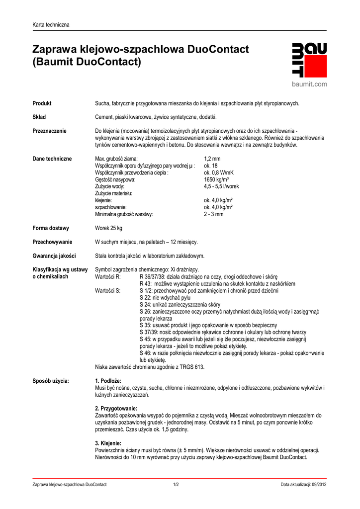Karta techniczna Zaprawa klejowo-szpachlowa DuoContact (Baumit DuoContact) Produkt Sucha, fabrycznie przygotowana mieszanka do klejenia i szpachlowania płyt styropianowych. Skład Cement, piaski kwarcowe, żywice syntetyczne, dodatki. Przeznaczenie Do klejenia (mocowania) termoizolacyjnych płyt styropianowych oraz do ich szpachlowania wykonywania warstwy zbrojącej z zastosowaniem siatki z włókna szklanego. Również do szpachlowania tynków cementowo-wapiennych i betonu. Do stosowania wewnątrz i na zewnątrz budynków. Dane techniczne Max. grubość ziarna: Współczynnik oporu dyfuzyjnego pary wodnej µ : Współczynnik przewodzenia ciepła : Gęstość nasypowa: Zużycie wody: Zużycie materiału: klejenie: szpachlowanie: Minimalna grubość warstwy: 1,2 mm ok. 18 ok. 0,8 W/mK 1650 kg/m³ 4,5 - 5,5 l/worek ok. 4,0 kg/m² ok. 4,0 kg/m² 2 - 3 mm Forma dostawy Worek 25 kg Przechowywanie W suchym miejscu, na paletach – 12 miesięcy. Gwarancja jakości Stała kontrola jakości w laboratorium zakładowym. Klasyfikacja wg ustawy o chemikaliach Symbol zagrożenia chemicznego: Xi drażniący. Wartości R: R 36/37/38: działa drażniąco na oczy, drogi oddechowe i skórę R 43: możliwe wystąpienie uczulenia na skutek kontaktu z naskórkiem Wartości S: S 1/2: przechowywać pod zamknięciem i chronić przed dziećmi S 22: nie wdychać pyłu S 24: unikać zanieczyszczenia skóry S 26: zanieczyszczone oczy przemyć natychmiast dużą ilością wody i zasięg¬nąć porady lekarza S 35: usuwać produkt i jego opakowanie w sposób bezpieczny S 37/39: nosić odpowiednie rękawice ochronne i okulary lub ochronę twarzy S 45: w przypadku awarii lub jeżeli się źle poczujesz, niezwłocznie zasięgnij porady lekarza - jeżeli to możliwe pokaż etykietę. S 46: w razie połknięcia niezwłocznie zasięgnij porady lekarza - pokaż opako¬wanie lub etykietę. Niska zawartość chromianu zgodnie z TRGS 613. Sposób użycia: 1. Podłoże: Musi być nośne, czyste, suche, chłonne i niezmrożone, odpylone i odtłuszczone, pozbawione wykwitów i luźnych zanieczyszczeń. 2. Przygotowanie: Zawartość opakowania wsypać do pojemnika z czystą wodą. Mieszać wolnoobrotowym mieszadłem do uzyskania pozbawionej grudek - jednorodnej masy. Odstawić na 5 minut, po czym ponownie krótko przemieszać. Czas użycia ok. 1,5 godziny. 3. Klejenie: Powierzchnia ściany musi być równa (± 5 mm/m). Większe nierówności usuwać w oddzielnej operacji. Nierówności do 10 mm wyrównać przy użyciu zaprawy klejowo-szpachlowej Baumit DuoContact. Zaprawa klejowo-szpachlowa DuoContact 1/2 Data aktualizacji: 09/2012 Karta techniczna Nanosić zaprawę na płytę styropianowa metodą obwiedniowo-punktową - w postaci ciągłego garbu na jej obrzeżach oraz trzech placków wzdłuż osi płyty. Przy równym podłożu możliwe jest nanoszenie zaprawy pacą zębatą na całej powierzchni. Kołkowanie płyt należy dokonywać po 24 godzinnej przerwie technologicznej w takiej ilości łączników na 1 m2 jak przewiduje projekt. 4. Szpachlowanie: Na przyklejone do podłoża płyty styropianowe nanosić zaprawę pacą zębatą 10 mm i wtapiać pionowe pasy siatki z włókna szklanego Baumit StarTex, całkowicie ją przykrywając zaprawą szpachlową. Łączone pasy siatki muszą na siebie zachodzić na szerokość min. 10 cm. Minimalna grubość warstwy szpachlowej 2 - 3 mm. Nierówności podłoża nie mogą być wyrównywane warstwą zbrojącą. Szczelin w płytach styropianowych nie wolno wypełniać zaprawą szpachlową. Jeśli warstwa zbrojąca nie została wykonana w ciągu dwóch tygodni od przyklejenia płyt styropianowych - należy je przeszlifować grubym papierem ściernym lub specjalną tarką do styropianu. Przed rozpoczęciem kolejnych etapów prac, po szpachlowaniu wymagana jest min. 3-dniowa przerwa technologiczna. 5. Szpachlowanie na tynkach i betonie: Nanosić zaprawę szpachlową Baumit DuoContact po uprzednim odpowiednim przygotowaniu podłoża (patrz „podłoże”). Przed całopowierzchniowym szpachlowaniem uzupełnić wcześniej jego ewentualne ubytki. 6. Wskazówki: Temperatura otoczenia, podłoża i materiału w trakcie obróbki oraz przez co najmniej 12 godzin od aplikacji nie może być niższa niż +5°C. Nie stosować żadnych dodatków i domieszek. Wysoka wilgotność powietrza oraz niskie temperatury znacznie wydłużają czas schnięcia produktu. W przypadku zbrojenia powierzchni elewacji siatką z włókna szklanego należy zwrócić uwagę, aby nie była ona uszkodzona lub nie pozostawała odsłonięta (nie przykryta warstwą zaprawy szpachlowej). Przy podwójnym zbrojeniu, drugą warstwę nanieść najwcześniej po upływie jednego dnia. Natychmiast po użyciu zaprawy umyć narzędzia czystą wodą. W trakcie prowadzonych prac chronić obszary zagrożone kontaktem z zaprawą (szkło, ceramikę, metal itp.). Zalecane powłoki wykończeniowe: Tynki akrylowe Baumit GranoporTop oraz tynki mineralne Baumit EdelPutz Spezial Nasze zalecenia w zakresie stosowanych technik, przekazywane słowem i pismem w celu wsparcia nabywcy (użytkownika) opracowane w oparciu o nasze doświadczenia i aktualny stan wiedzy są niewiążące i nie uzasadniają prawnego stosunku umownego oraz żadnych zobowiązań ubocznych z tytułu umowy kupna (sprzedaży). Nie zwalniają one nabywcy od sprawdzenia na własną odpowiedzialność przydatności naszych produktów do przewidzianego zastosowania. Należy przestrzegać ogólnych zasad techniki budowlanej. Zastrzegamy sobie możliwość zmian, które służą technicznemu postępowi i ulepszeniu produktu lub jego zastosowaniu. Wraz z ukazaniem się niniejszej informacji technicznej wcześniejsze jej wersje tracą ważność. Najbardziej aktualne informacje znajdziecie Państwo na naszych stronach internetowych. Poza tym obowiązują nasze "Ogólne warunki umów" znajdujące się w katalogach produktów. Nasza gęsta sieć przedstawicielstw gwarantuje szybkie doradztwo i 