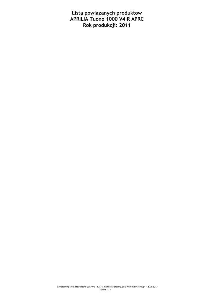 Lista powiazanych produktow APRILIA Tuono 1000 V4 R APRC Rok produkcji: 2011 :: Wszelkie prawa zastrzeżone (c) 2002 - 2017 :: [email protected] :: www.italyracing.pl :: 6.03.2017 strona 1 / 1