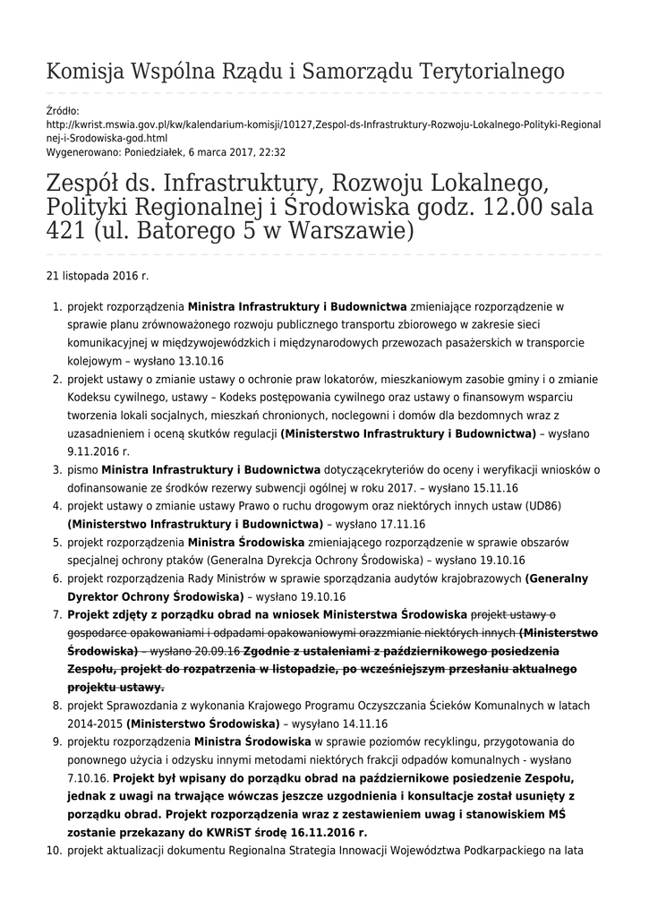 Komisja Wspólna Rządu i Samorządu Terytorialnego Źródło: http://kwrist.mswia.gov.pl/kw/kalendarium-komisji/10127,Zespol-ds-Infrastruktury-Rozwoju-Lokalnego-Polityki-Regional nej-i-Srodowiska-god.html Wygenerowano: Poniedziałek, 6 marca 2017, 22:32 Zespół ds. Infrastruktury, Rozwoju Lokalnego, Polityki Regionalnej i Środowiska godz. 12.00 sala 421 (ul. Batorego 5 w Warszawie) 21 listopada 2016 r. 1. projekt rozporządzenia Ministra Infrastruktury i Budownictwa zmieniające rozporządzenie w sprawie planu zrównoważonego rozwoju publicznego transportu zbiorowego w zakresie sieci komunikacyjnej w międzywojewódzkich i międzynarodowych przewozach pasażerskich w transporcie kolejowym – wysłano 13.10.16 2. projekt ustawy o zmianie ustawy o ochronie praw lokatorów, mieszkaniowym zasobie gminy i o zmianie Kodeksu cywilnego, ustawy – Kodeks postępowania cywilnego oraz ustawy o finansowym wsparciu tworzenia lokali socjalnych, mieszkań chronionych, noclegowni i domów dla bezdomnych wraz z uzasadnieniem i oceną skutków regulacji (Ministerstwo Infrastruktury i Budownictwa) – wysłano 9.11.2016 r. 3. pismo Ministra Infrastruktury i Budownictwa dotyczącekryteriów do oceny i weryfikacji wniosków o dofinansowanie ze środków rezerwy subwencji ogólnej w roku 2017. – wysłano 15.11.16 4. projekt ustawy o zmianie ustawy Prawo o ruchu drogowym oraz niektórych innych ustaw (UD86) (Ministerstwo Infrastruktury i Budownictwa) – wysłano 17.11.16 5. projekt rozporządzenia Ministra Środowiska zmieniającego rozporządzenie w sprawie obszarów specjalnej ochrony ptaków (Generalna Dyrekcja Ochrony Środowiska) – wysłano 19.10.16 6. projekt rozporządzenia Rady Ministrów w sprawie sporządzania audytów krajobrazowych (Generalny Dyrektor Ochrony Środowiska) – wysłano 19.10.16 7. Projekt zdjęty z porządku obrad na wniosek Ministerstwa Środowiska projekt ustawy o gospodarce opakowaniami i odpadami opakowaniowymi orazzmianie niektórych innych (Ministerstwo Środowiska) – wysłano 20.09.16 Zgodnie z ustaleniami z październikowego posiedzenia Zespołu, projekt do rozpatrzenia w listopadzie, po wcześniejszym przesłaniu aktualnego projektu ustawy. 8. projekt Sprawozdania z wykonania Krajowego Programu Oczyszczania Ścieków Komunalnych w latach 2014-2015 (Ministerstwo Środowiska) – wysyłano 14.11.16 9. projektu rozporządzenia Ministra Środowiska w sprawie poziomów recyklingu, przygotowania do ponownego użycia i odzysku innymi metodami niektórych frakcji odpadów komunalnych - wysłano 7.10.16. Projekt był wpisany do porządku obrad na październikowe posiedzenie Zespołu, jednak z uwagi na trwające wówczas jeszcze uzgodnienia i konsultacje został usunięty z porządku obrad. Projekt rozporządzenia wraz z zestawieniem uwag i stanowiskiem MŚ zostanie przekazany do KWRiST środę 16.11.2016 r. 10. projekt aktualizacji dokumentu Regionalna Strategia Innowacji Województwa Podkarpackiego na lata 2014-2020 na rzecz inteligentnej specjalizacji (RIS3) – wysłano 20.10.16 11. „Strategia Rozwoju Miasta Poznania 2020+” – wysyłano 10.11.16 12. projekt ustawy o zasadach zarządzania mieniem państwowym (Ministerstwo Skarbu Państwa) – wysłano 15.11.16 13. projekt ustawy – Przepisy wprowadzające ustawęo zasadach zarządzania mieniem państwowym (Ministerstwo Skarbu Państwa) – wysłano 15.11.16 Wstecz Drukuj Generuj PDF Powiadom znajomego