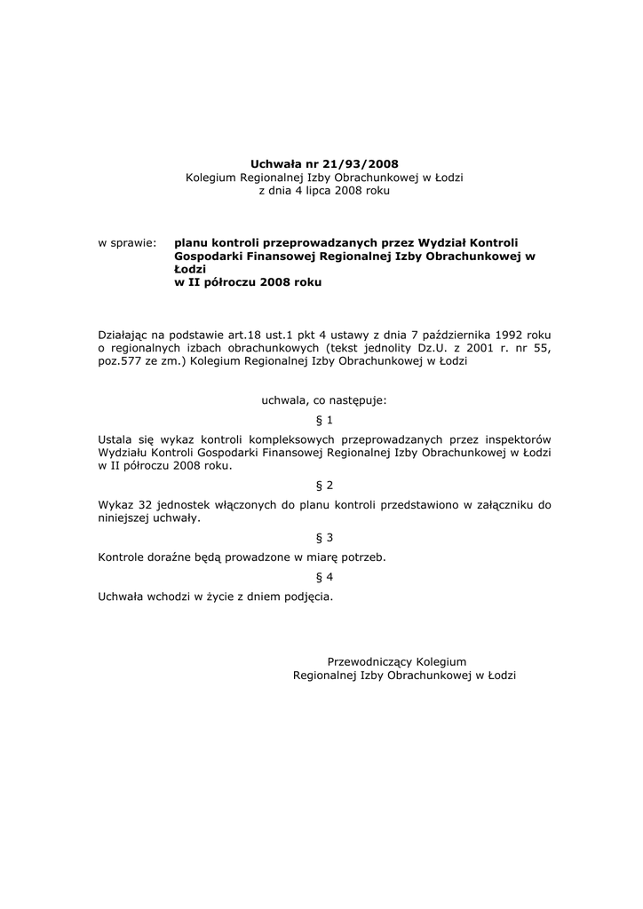 Uchwała nr 21/93/2008 Kolegium Regionalnej Izby Obrachunkowej