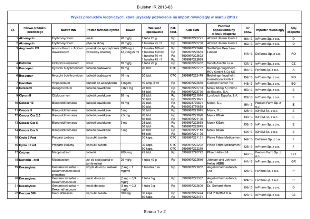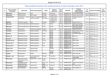Biuletyn IR 2013-03 Wykaz produktów leczniczych, które uzyskały pozwolenie na import równoległy w marcu 2013 r. 1 Aknemycin Erythromycinum maść 20 mg/g 1 tuba 25 g Rp 5909997222721 Podmiot odpowiedzialny w kraju eksportu Almirall Hermal GmbH 2 Aknemycin Erythromycinum płyn na skórę 20 mg/g 1 butelka 25 ml Rp 5909997222738 Almirall Hermal GmbH 3 Augmentin ES Rp Rp Rp Rp Rp 5909997222646 5909997222653 5909997222622 5909997222639 5909997222462 SmithKline Beecham Limited 4 Batrafen Amoxicillinum + Acidum proszek do sporządzania (600 mg + 1 butelka 100 ml clavulanicum zawiesiny doustnej 42,9 mg)/5 ml 1 butelka 150 ml 1 butelka 50 ml 1 butelka 75 ml Ciclopiroxi olaminum krem 10 mg/g 1 tuba 20 g 5 Buscopan Hyoscini butylbromidum tabletki drażowane 10 mg 20 tabl. OTC 5909997222707 6 Buscopan Hyoscini butylbromidum tabletki drażowane 10 mg 20 tabl. OTC 5909997222479 7 Cavinton Vinpocetinum roztwór do wstrzykiwań 5 mg/ml 10 amp. 2 ml Rp 5909997222660 Boehringer Ingelheim RCV GmbH & Co KG Boehringer Ingelheim International GmbH Gedeon Richter Plc. 8 Cerazette Desogestrelum tabletki powlekane 0,075 mg 9 Cipramil Citalopramum tabletki powlekane 20 mg Bisoprololi fumaras tabletki powlekane 10 mg 11 Concor 5 Bisoprololi fumaras tabletki powlekane 5 mg Rp Rp Rp Rp Rp Rp Rp 5909997222783 5909997222790 5909997221014 5909997221021 5902023770821 5902023770838 5909997221045 Merck Sharp & Dohme de España, S.A. Lundbeck España, S.A. 10 Concor 10 28 tabl. 84 tabl. 28 tabl. 56 tabl. 30 tabl. 60 tabl. 30 tabl. 12 Concor Cor 2,5 Bisoprololi fumaras tabletki powlekane 2,5 mg Bisoprololi fumaras tabletki powlekane 5 mg 14 Concor Cor 5 Bisoprololi fumaras tabletki powlekane 5 mg 15 Cyclo 3 Fort Preparat złożony kapsułki twarde Rp Rp Rp Rp Rp Rp OTC 5909997221090 5909997221106 5909997222868 5909997222875 5909997221113 5909997221120 5909997221151 Merck KGaA 13 Concor Cor 5 28 tabl. 56 tabl. 28 tabl. 56 tabl. 28 tabl. 56 tabl. 30 kaps. 16 Cyclo 3 Fort Preparat złożony kapsułki twarde Misoprostolum tabletki 200 mcg OTC OTC Rp 5909997222202 5909997222219 5902023770722 Pierre Fabre Medicament 17 Cytotec 30 kaps. 60 kaps. 42 tabl. 18 Daktarin - oral Miconazolum 20 mg/g 1 tuba 40 g Rp 5909997222516 19 Dexamytrex Gentamicini sulfas + Dexamethasoni natrii phosphas Gentamicini sulfas + Dexamethasonum Gentamicini sulfas + Dexamethasonum Calcii dobesilas żel do stosowania w jamie ustnej krople do oczu, roztwór (5 mg + 1 mg)/ml 1 butelka 5 ml Rp 5909997221052 Johnson and Johnson Hellas AEBE Angelini FarmacêuticA, Lda (5 mg + 0,3 mg)/g (5 mg + 0,3 mg)/g 500 mg 1 tuba 3 g Rp 5909997222387 1 tuba 3 g Rp 5909997222806 30 kaps. 60 kaps. Rp Rp 5909997222424 5909997222431 Lp. Nazwa produktu leczniczego 20 Dexamytrex 21 Dexamytrex 22 Doxium 500 Nazwa INN Postać farmaceutyczna maść do oczu maść do oczu kapsułki twarde Dawka Wielkość opakowania Strona 1 z 2 Kat. dost. KOD EAN Sanofi-Aventis s.r.o. Merck, S.L. Merck, S.L. Merck KGaA Merck KGaA Pierre Fabre Medicament Pfizer Hellas SA Angelini Farmacêutica, Lda. Dr. Gerhard Mann OM PHARMA S.A. Nr pozw. Importer równoległy Kraj eksportu 161/13 InPharm Sp. z o.o. D 162/13 InPharm Sp. z o.o. D 147/13 Delfarma Sp. z o.o. RO 137/13 InPharm Sp. z o.o. CZ 151/13 Forfarm Sp. z o.o. A 152/13 InPharm Sp. z o.o. RO 148/13 InPharm Sp. z o.o. BG 159/13 InPharm Sp. z o.o. E 122/13 InPharm Sp. z o.o. E Pretium Farm Sp. z o.o. 128/13 ICHEM Sp. z o.o. 154/13 E E 130/13 ICHEM Sp. z o.o. E 158/13 InPharm Sp. z o.o. E 131/13 ICHEM Sp. z o.o. E 142/13 Delfarma Sp. z o.o. F 125/13 InPharm Sp. z o.o. F 149/13 Pretium Farm Sp. z o.o. GR 141/13 InPharm Sp. z o.o. GR 126/13 Forfarm Sp. z o.o. P 124/13 Forfarm Sp. z o.o. P 156/13 InPharm Sp. z o.o. D 123/13 InPharm Sp. z o.o. CZ Biuletyn IR 2013-03 Lp. Nazwa produktu leczniczego 23 Fervex Nazwa INN Postać farmaceutyczna Dawka Wielkość opakowania Kat. dost. KOD EAN granulat do sporządzania 500 mg + 200 5 sasz. 13,1 g roztworu doustnego mg + 25 mg 8 sasz. 13,1 g OTC OTC 5909997222226 5909997222233 granulat do sporządzania 280 mg + 100 8 sasz. 3 g roztworu doustnego mg + 10 mg OTC 5909997221199 25 Fucidin Paracetamolum + Acidum ascorbicum + Pheniramini maleas Paracetamolum + Acidum ascorbicum + Pheniramini maleas Acidum fusidicum 26 Hepa-Merz 3000 Ornithini aspartas granulat do sporządzania 3 g/5 g roztworu doustnego 24 Fervex Junior krem 20 mg/g Rp 5909997222523 10 sasz. 5 g 30 sasz. 5 g 50 sasz. 5 g 100 sasz. 5 g 1 butelka 38 g Rp Rp Rp Rp Rp 5909997222813 5909997222820 5909997222837 5909997222844 5909997222554 Leo Pharmaceutical Hellas S.A. Merz Pharma Austria GmbH Lidocainum aerozol, roztwór 28 Loceryl Amorolfinum 1 butelka 2,5 ml Rp 5909997222851 29 Menopur Menotropinum lakier do paznokci 50 mg/m leczniczy proszek i rozpuszczalnik 75 IU FSH + do sporządzania 75 IU LH roztworu do wstrzykiwań 5 fiol. + 5 amp. 10 fiol. + 10 amp. Rp Rp 5909997222769 5909997222776 FERRING S.A.S. Alverini citras + Simeticonum Povidonum kapsułki miękkie 20 kaps. Rp 5902023770692 krople do oczu 60 mg + 300 mg 50 mg/ml OTC 5909997222455 Laboratoires Mayoly Spindler Laboratoires THEA 32 PentoHEXAL 600 Retard 33 Sinupret Pentoxifyllinum tabletki o przedłu 600 mg 30 tabl. Rp 5909997222196 Hexal AG Preparat ziołowy tabletki drażowane Ferrosi sulfas + Acidum ascorbicum Benzydamini hydrochloridum tabletki o przedłużonym 100 mg Fe(II) uwalnianiu + 60 mg roztwór do płukania jamy 1,5 mg/ml ustnej i gard OTC OTC Rp 5909997222530 5909997222547 5909997221038 Bionorica SE 34 Sorbifer Durules 50 tabl. 100 tabl. 50 tabl. 1 butelka 250 ml OTC 5909997222714 36 Tenaxum Rilmenidinum tabletki 1 mg 30 tabl. 37 Voltaren Emulgel 1% Diclofenacum natricum żel 10 mg/g 1 tuba 100 g 1 tuba 20 g 1 tuba 50 g 30 tabl. 50 tabl. 100 tabl. 30 tabl. 50 tabl. 100 tabl. 12 tabl. 24 tabl. 21 tabl. 63 tabl. 31 Oculotect Fluid 35 Tantum Verde 38 Xanax 39 Xanax Alprazolamum Alprazolamum tabletki tabletki 0,25 mg 0,5 mg 40 Xifaxan Rifaximinum tabletki powlekane 200 mg 41 Yasmine