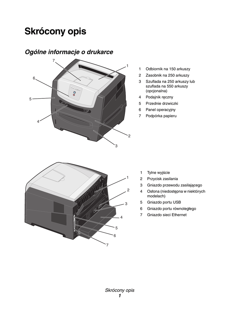Skrócony opis Ogólne informacje o drukarce 7 1 6 5 1 Odbiornik na 150 arkuszy 2 Zasobnik na 250 arkuszy 3 Szuflada na 250 arkuszy lub szuflada na 550 arkuszy (opcjonalna) 4 Podajnik ręczny 5 Przednie drzwiczki 6 Panel operacyjny 7 Podpórka papieru 4 2 3 1 2 3 4 5 6 7 Skrócony opis 1 1 Tylne wyjście 2 Przycisk zasilania 3 Gniazdo przewodu zasilającego 4 Osłona (niedostępna w niektórych modelach) 5 Gniazdo portu USB 6 Gniazdo portu równoległego 7 Gniazdo sieci Ethernet Opis panelu operacyjnego Na panelu operacyjnym znajduje się 5 kontrolek i 2 przyciski. Uwaga: Przycisk Kontynuuj pełni również funkcję kontrolki. 1 3 2 4 7 5 6 1 Błąd 5 Gotowa 2 Zacięcie papieru 6 Przycisk Anuluj 3 Załaduj papier 7 Przycisk Kontynuuj 4 Mało toneru/Wymień zestaw bębna światłoczułego Postępowanie w przypadku najczęściej występujących sekwencji kontrolek informujących o błędzie: • Naciśnij i zwolnij przycisk Kontynuuj , aby wznowić drukowanie. • Aby wyświetlić kod dodatkowego błędu, dwa razy szybko naciśnij i zwolnij przycisk Kontynuuj . • Naciśnij i zwolnij przycisk Anuluj • Aby zresetować drukarkę, naciśnij i przytrzymaj przycisk Anuluj zaświecą wszystkie kontrolki. , aby anulować bieżące zadanie drukowania. Opis panelu operacyjnego 2 , aż do chwili, gdy Znaczenie kontrolek na panelu operacyjnym Kontrolki umieszczone na panelu operacyjnym mają różne znaczenie w zależności od ich sekwencji. Kontrolki, które są wyłączone, włączone i/lub migają, informują o stanie drukarki, konieczności interwencji użytkownika lub konieczności naprawy. Najczęściej występujące sekwencje kontrolek = Włączona Stan drukarki = Miga Kontynuuj Błąd Mało toneru/ Wymień zestaw bębna światłoczułego = Miga powoli Załaduj papier Gotowa/Wygaszacz Zajęta Włączony tryb druku szesnastkowego Oczekiwanie Opróżnianie bufora/ Zmniejszona rozdzielczość Niegotowa (drukarka jest wyłączona) Zamknij drzwiczki Znaczenie kontrolek na panelu operacyjnym 3 Zacięcie papieru Puste = Wyłączona Gotowa Najczęściej występujące sekwencje kontrolek (ciąg dalszy) = Włączona Stan drukarki = Miga Kontynuuj Błąd Mało toneru/ Wymień zestaw bębna światłoczułego = Miga powoli Załaduj papier Za mały obszar sortowania/ Za mało pamięci Zbyt złożona strona Anuluj zadanie/ Resetuj drukarkę Załaduj nośnik wydruku Załaduj podajnik ręczny Mało toneru Niezgodność regionu kasety z tonerem Ostrzeżenie o zużyciu zestawu bębna światłoczułego Wymień zestaw bębna światłoczułego (zatrzymanie pracy drukarki) Znaczenie kontrolek na panelu operacyjnym 4 Zacięcie papieru Puste = Wyłączona Gotowa Najczęściej występujące sekwencje kontrolek (ciąg dalszy) = Włączona Stan drukarki = Miga Kontynuuj Błąd Mało toneru/ Wymień zestaw bębna światłoczułego = Miga powoli Załaduj papier Programowanie kodu mechanizmu/ Programowanie kodu systemu Nieprawidłowy kod mechanizmu/ Nieprawidłowy kod sieci Błędy interfejsu sieciowego/ Interfejs hosta wyłączony Błąd wymagający serwisu Błąd drukarki Błąd drukarki – zacięcie papieru Krótki papier Odbiornik pełny Znaczenie kontrolek na panelu operacyjnym 5 Zacięcie papieru Puste = Wyłączona Gotowa Drukowanie stron ustawień menu i konfiguracji sieci Aby wydrukować stronę z ustawieniami menu i stronę z informacjami o konfiguracji sieci, należy kliknąć przycisk Kontynuuj przy stanie drukarki Gotowa. Na stronie z ustawieniami menu: – Sprawdź, czy zainstalowane opcjonalne elementy drukarki są wyszczególnione prawidłowo na liście Zainstalowane funkcje. Jeśli dany element nie jest wymieniony na liście Zainstalowane funkcje, wyłącz drukarkę, wyjmij wtyczkę przewodu zasilającego z gniazdka elektrycznego i zainstaluj ten element ponownie. – – Sprawdź, czy ilość zainstalowanej pamięci zgadza się z wartością podaną w sekcji Informacje o drukarce. Sprawdź, czy zasobniki są skonfigurowane odpowiednio do rozmiaru i typu załadowanego papieru. Drukowanie strony testowej za pomocą komputera 1 Kliknij kolejno polecenia: Start Æ Ustawienia Æ Drukarki. 2 Wybierz drukarkę. 3 Kliknij kolejno polecenia: Plik Æ Właściwości. 4 Kliknij polecenie Drukuj stronę testową. Przywracanie ustawień fabrycznych Czasami przywrócenie ustawień fabrycznych drukarki pozwala rozwiązać problemy związane z formatowaniem. Przywracanie ustawień fabrycznych 1 Wyłącz drukarkę. 2 Otwórz przednie drzwiczki. 3 Podczas ponownego włączania drukarki naciśnij przycisk Kontynuuj. 4 Przytrzymaj przycisk Kontynuuj, aż zaświecą po kolei wszystkie kontrolki, a następnie zwolnij przycisk Kontynuuj. 5 Zamknij przednie drzwiczki. 6 Naciśnij przycisk Anuluj. 7 Naciśnij przycisk Kontynuuj, aż na panelu operacyjnym zaświecą po kolei wszystkie kontrolki. Zaświecą kontrolki Załaduj papier, Mało toneru/Wymień zestaw bębna światłoczułego, Gotowa i Kontynuuj. Drukowanie stron ustawień menu i konfiguracji sieci 6 8 Zwolnij przycisk Kontynuuj. 9 Wyłącz drukarkę, a następnie włącz ją ponownie. Ustawienia fabryczne zostały przywrócone. Korzystanie z narzędzia do konfiguracji drukarki lokalnej Narzędzie do konfiguracji drukarki lokalnej umożliwia modyfikowanie ustawień drukarki, które nie są dostępne z poziomu sterownika drukarki (na przykład włączenie funkcji Sterowanie alarmem, jeśli drukarka ma generować sygnał dźwiękowy, gdy wymagana jest interwencja). W celu otwarcia narzędzia do konfiguracji drukarki lokalnej w aplikacji zainstalowanej w komputerze należy kliknąć kolejno opcje: Start Æ Wszystkie programy Æ Lexmark Æ Local Printer Settings Utility (Narzędzie do konfiguracji drukarki lokalnej). W przypadku wybrania niestandardowej ścieżki instalacyjnej podczas instalowania oprogramowania z dysku CD-ROM ze sterownikami należy ponownie uruchomić ten dysk i kliknąć opcję View Documentation (Wyświetl dokumentację) w celu uzyskania instrukcji na t