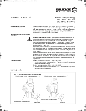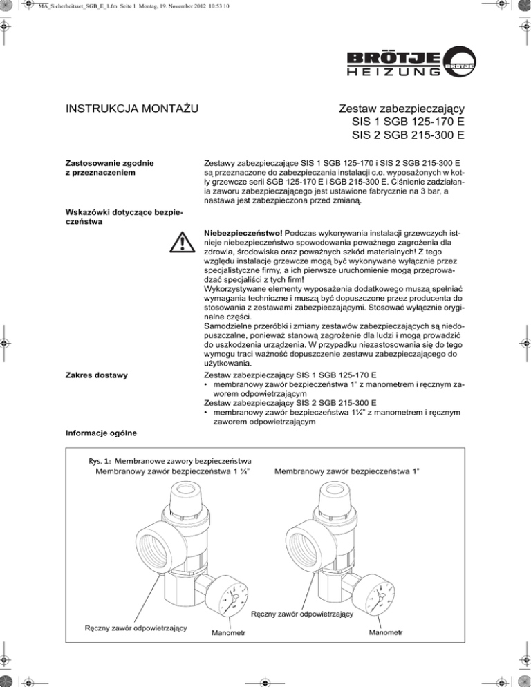 MA_Sicherheitsset_SGB_E_1.fm Seite 1 Montag, 19. November 2012 10:53 10 INSTRUKCJA MONTAŻU Zastosowanie zgodnie z przeznaczeniem Zestaw zabezpieczający SIS 1 SGB 125-170 E SIS 2 SGB 215-300 E Zestawy zabezpieczające SIS 1 SGB 125-170 i SIS 2 SGB 215-300 E są przeznaczone do zabezpieczania instalacji c.o. wyposażonych w kotły grzewcze serii SGB 125-170 E i SGB 215-300 E. Ciśnienie zadziałania zaworu zabezpieczającego jest ustawione fabrycznie na 3 bar, a nastawa jest zabezpieczona przed zmianą. Wskazówki dotyczące bezpieczeństwa Niebezpieczeństwo! Podczas wykonywania instalacji grzewczych istnieje niebezpieczeństwo spowodowania poważnego zagrożenia dla zdrowia, środowiska oraz poważnych szkód materialnych! Z tego względu instalacje grzewcze mogą być wykonywane wyłącznie przez specjalistyczne firmy, a ich pierwsze uruchomienie mogą przeprowadzać specjaliści z tych firm! Wykorzystywane elementy wyposażenia dodatkowego muszą spełniać wymagania techniczne i muszą być dopuszczone przez producenta do stosowania z zestawami zabezpieczającymi. Stosować wyłącznie oryginalne części. Samodzielne przeróbki i zmiany zestawów zabezpieczających są niedopuszczalne, ponieważ stanową zagrożenie dla ludzi i mogą prowadzić do uszkodzenia urządzenia. W przypadku niezastosowania się do tego wymogu traci ważność dopuszczenie zestawu zabezpieczającego do użytkowania. Zakres dostawy Zestaw zabezpieczający SIS 1 SGB 125-170 E • membranowy zawór bezpieczeństwa 1” z manometrem i ręcznym zaworem odpowietrzającym Zestaw zabezpieczający SIS 2 SGB 215-300 E • membranowy zawór bezpieczeństwa 1¼” z manometrem i ręcznym zaworem odpowietrzającym Informacje ogólne Rys. 1: Membranowe zawory bezpieczeństwa Membranowy zawór bezpieczeństwa 1 ¼” Membranowy zawór bezpieczeństwa 1” Ręczny zawór odpowietrzający Ręczny zawór odpowietrzający Manometr Manometr MA_Sicherheitsset_SGB_E_1.fm Seite 2 Montag, 19. November 2012 10:53 10 Montaż Podczas montażu należy stosować się do poniższych zaleceń • Membranowy zawór bezpieczeństwa musi być zamontowany w najwyższym punkcie źródła ciepła lub w bezpośrednim pobliżu źródła ciepła. • Pomiędzy membranowym zaworem bezpieczeństwa i źródłem ciepła można zamontować prosty odcinek przewodu połączeniowego o maks. długości 1 m i średnicy odpowiadającej przekrojowi wlotu. • Przewód wydmuchowy należy ułożyć ze spadkiem. • Przekrój przewodu wydmuchowego musi być taki sam jak przekrój wylotu membranowego zaworu bezpieczeństwa (rys. 2). • Przewód wydmuchowy może mieć najwyżej 2 łuki i nie może być dłuższy niż 2 m. • Przewód wydmuchowy należy wykonać tak, żeby w przypadku zadziałania zaworu bezpieczeństwa nie był możliwy wzrost ciśnienia. • Przewód wydmuchowy nie może być wyprowadzony na zewnątrz, jego wylot musi być otwarty i musi umożliwiać obserwację. • Wypływająca ewentualnie woda grzewcza musi być odprowadzona w bezpieczny sposób. • Jeżeli wylot przewodu wydmuchowego jest umieszczony w lejku odpływowym, to średnica wylotu lejka musi być dwa razy większa od wlotu zaworu. D Rys. 2: Membranowy zawór bezpieczeństwa z przewodem wydmuchowym R = 3D Do L Ø L≤2m L≥2m L≤4m kW 20 1 ¼” 1 ½” 125/170 30 1 ½” 2” 215/260/300 Do Ø SIS 1 SGB 1” SIS 2 SGB 1 ¼” Konserwacja Sprawność działania membranowego zaworu bezpieczeństwa należy kontrolować podczas corocznej konserwacji. August Brötje GmbH · Postfach 13 54 · 26171 Rastede Telefon 04402 80-0 · Telefax 04402 80-583 · www.broetje.pl 7308626-01 11.12 D typ