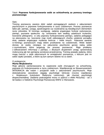 Tytuł: Poprawa funkcjonowania osób ze schizofrenią za pomocą treningu poznawczego Opis: Trening poznawczy zawiera zbiór zadań pomagających osobom z zaburzeniami psychicznymi w poprawie funkcjonowania w życiu codziennym. Procesy poznawcze takie jak: pamięć, uwaga, spostrzeganie czy wyobraźnia są nieodłącznym elementem życia człowieka. W treningu występują zadania angażujące funkcje wykonawcze, pamięć, poznanie społeczne np. sortowanie kart według ustalonych kryteriów, tworzenie piktogramu w celu poprawy funkcjonowania pamięci, zadania polegające na planowaniu np. tworzenie map myśli ułatwiających choćby ustalenie porządku dnia, zadania angażujące myślenia twórcze i wiele innych. Polecenia zawarte w treningu poznawczym mają dobre przełożenie na codzienność. Wiele badań donosi, że osoby cierpiące na zaburzenia psychiczne gorzej radzą sobie z czynnościami, które angażują ów procesy poznawcze. Maja problemy z odtwarzaniem informacji z pamięci, z dłuższym skupieniem uwagi, sprawnością motoryczną jak też pamięcią wzrokowo-przestrzenną. Trening posiada zadania, które mogą ćwiczyć u osób zaburzonych te umiejętności poznawcze, z którymi jest im sobie ciężko poradzić, a które są tym samym istotne na co dzień. O prelegencie: Marta Wojtulewicz Moje główne zainteresowania to wspieranie osób chorujących na schizofrenię, poprawa ich funkcjonowania w życiu codziennym. Współpracuję ze Stowarzyszeniem INTEGRACJA dla rodzin i przyjaciół osób z zaburzeniami psychicznymi. Moje doświadczenia zawodowe sięgają psychologii lotniczej (roczna współpraca z Wojskowym Instytutem Medycyny Lotnicznej), jak również psychologii eksperymentalnej (badania postrzegania mowy w oparciu o efekt McGurka) - od 3 lat badacz w Katedrze Psychologii Poznawczej WSFiZ w Warszawie.