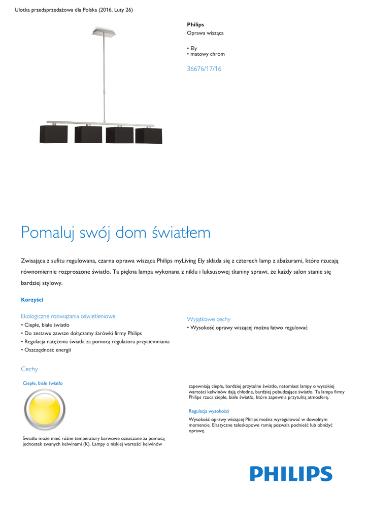 Ulotka przedsprzedażowa dla Polska (2016, Luty 26) Philips Oprawa wisząca • Ely • matowy chrom 36676/17/16 Pomaluj swój dom światłem Zwisająca z sufitu regulowana, czarna oprawa wisząca Philips myLiving Ely składa się z czterech lamp z abażurami, które rzucają równomiernie rozproszone światło. Ta piękna lampa wykonana z niklu i luksusowej tkaniny sprawi, że każdy salon stanie się bardziej stylowy. Korzyści Ekologiczne rozwiązania oświetleniowe • Ciepłe, białe światło • Do zestawu zawsze dołączamy żarówki firmy Philips • Regulacja natężenia światła za pomocą regulatora przyciemniania • Oszczędność energii Wyjątkowe cechy • Wysokość oprawy wiszącej można łatwo regulować Cechy Ciepłe, białe światło zapewniają ciepłe, bardziej przytulne światło, natomiast lampy o wysokiej wartości kelwinów dają chłodne, bardziej pobudzające światło. Ta lampa firmy Philips rzuca ciepłe, białe światło, które zapewnia przytulną atmosferę. Regulacja wysokości Wysokość oprawy wiszącej Philips można wyregulować w dowolnym momencie. Elastyczne teleskopowe ramię pozwala podnieść lub obniżyć oprawę. Światło może mieć różne temperatury barwowe oznaczane za pomocą jednostek zwanych kelwinami (K). Lampy o niskiej wartości kelwinów Do zestawu zawsze dołączamy żarówki firmy Philips Oszczędność energii W zestawie znajdują się wysokiej jakości, energooszczędne żarówki Philips EcoClassic, które pozwalają osiągnąć najlepszy efekt oświetleniowy. Ta energooszczędna lampa firmy Philips zużywa mniej energii niż tradycyjne źródła światła, co pozwala zmniejszyć rachunki za prąd i przyczynia się do ochrony środowiska. Możliwość przyciemniania Ta lampa firmy Philips jest wyposażona w funkcję regulacji natężenia światła za pomocą regulatora przyciemniania (niedołączony do zestawu). Dzięki temu można podkreślić element wystroju lub stworzyć idealną atmosferę na każdą okazję — niezależnie od tego, czy chodzi o romantyczną kolację we dwoje czy o relaks z rodziną i przyjaciółmi w salonie. Specyfikacje Prosimy pamiętać, że jest to ulotka przedsprzedażowa. Treść ulotki jest zgodna z naszą najlepszą wiedzą w momencie publikacji i w odniesieniu do danego kraju (podane powyżej). Treść ulotki może ulec zmianie bez powiadomienia. Firma Philips nie ponosi odpowiedzialności za treść ulotki. Stylistyka i wykończenie Materiał Kolor metal tkanina matowy chrom Dodatkowe funkcje/akcesoria w zestawie Możliwość przyciemniania Żarówki halogenowe w zestawie Regulacja wysokości TAK TAK TAK Wymiary i waga produktu Minimalna wysokość Maksymalna wysokość Długość Szerokość Waga netto 88 cm 133,2 cm 94 cm 16 cm 2,895 kg Dane techniczne Zasilanie sieciowe Technologia źródła światła Liczba źródeł światła Trzonek Moc źródła światła w zestawie Maksymalna moc wymiennego źródła światła Barwa światła Maksymalna trwałość źródła światła Oprawa z możliwością przyciemniania LED Wbudowane źródło światła LED Klasa energetyczna dołączonego źródła światła Oprawa jest zgodna ze źródłami światła klasy Współczynnik IP Przedział 220–240 V 50–60 Hz halogen 230 V 4 E14 42 W 42 W Klasa ochronności Źródło światła odpowiadające tradycyjnej żarówce o mocy Moc strumienia świetlnego dołączonego źródła światła w lumenach Nie NIE D C do E IP20 ochrona przed przedmiotami powyżej 12,5 mm brak ochrony przed wodą I — uziemienie 55 W 630 lm Serwis Gwarancja 2 lata Wymiary i waga opakowania Wysokość Długość Szerokość Waga 14,2 cm 91,7 cm 27,8 cm 4,000 kg Różne ciepła biel 2000 godz. TAK Opracowano z myślą o Styl Typ Salon i sypialnia Nowoczesne Oprawa wisząca Dane wkrótce ulegną zmianie 2016, Luty 26 Dane wkrótce ulegną zmianie 2016, Luty 26 Version: 1.0.1 EAN: 8718291468585 © 2016 Koninklijke Philips Electronics N.V. Wszelkie prawa zastrzeżone Dane mogą ulec zmianie bez uprzedniego powiadomienia. Znak towarowy jest własnością Koninklijke Philips Electronics N.V. lub odpowiednich podmiotów . www.philips.com