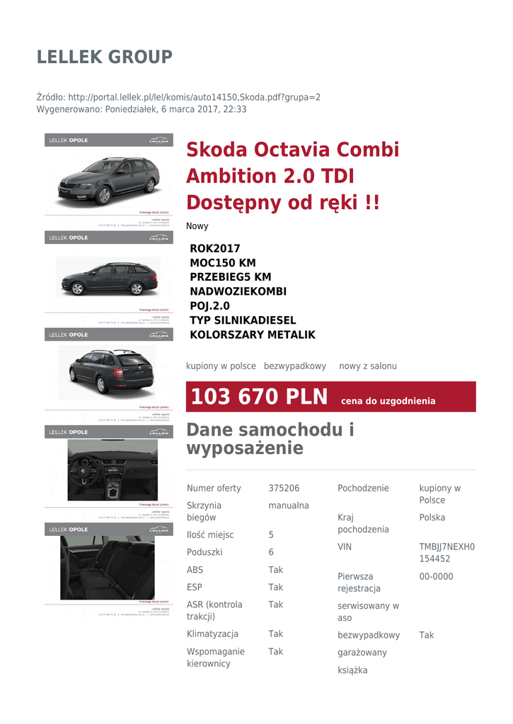 LELLEK GROUP Źródło: http://portal.lellek.pl/lel/komis/auto14150,Skoda.pdf?grupa=2 Wygenerowano: Poniedziałek, 6 marca 2017, 22:33 Skoda Octavia Combi Ambition 2.0 TDI Dostępny od ręki !! Nowy ROK2017 MOC150 KM PRZEBIEG5 KM NADWOZIEKOMBI POJ.2.0 TYP SILNIKADIESEL KOLORSZARY METALIK kupiony w polsce bezwypadkowy 103 670 PLN nowy z salonu cena do uzgodnienia Dane samochodu i wyposażenie Numer oferty 375206 Pochodzenie kupiony w Polsce Skrzynia biegów manualna Kraj pochodzenia Polska Ilość miejsc 5 Poduszki 6 VIN TMBJJ7NEXH0 154452 ABS Tak ESP Tak Pierwsza rejestracja 00-0000 ASR (kontrola trakcji) Tak serwisowany w aso Klimatyzacja Tak bezwypadkowy Wspomaganie kierownicy Tak garażowany książka Tak serwisowa Radioodtwarza cz Tak Podgrzewane fotele Tak kupiony w salonie Alufelgi Tak tunning Miejsce postoju Opole Sławice homologacja I właściciel Handlowiec stan idealny właściciel niepalący Opis dodatkowy Samochód dostępny od ręki ! Krzysztof Stanik 77 400 70 00 w. 0125 zapytaj mobile Charakterystyka spalania cykl miejski 5.1 l/100km cykl pozamiejski 3.9 l/100km cykl mieszany 4.3 l/100km emisja CO2 113 g/km Gwarancja mechaniczna 24 miesięcy perforacja nadwozia 144 miesięcy Ubezpieczenie Ubezpieczenie dostępne Wyposażony w : 4 głośniki z przodu 5 zagłówków regulowanych na wysokość (środkowy zagłówek z tyłu jeden stopień regulacji) Asymetrycznie dzielone oparcie tylnej kanapy (60:40) Czujnik parkowania z tyłu ESP z ABS, MSR, ASR, EDS, HBA i TPM Elektrycznie podgrzewane i sterowane lusterka zewnętrzne w kolorze nadwozia Elektrycznie sterowane szyby z przodu i z tyłu Fotel kierowcy i pasażera z regulacją wysokości Funkcja Start-Stop Gniazdo 12 V w komorze bagażnika Hamulce tarczowe z tyłu Kieszeń na kamizelkę odblaskową pod fotelem kierowcy Klimatyzacja manualna Climatic Komputer pokładowy z wyświetlaczem Maxi - DOT Kurtyny powietrzne Podgrzewana tylna szyba Podłokietnik z przodu ze schowkiem Poduszki powietrzne czołowe i boczne kierowcy oraz pasażera z przodu, dezaktywacja czołowej poduszki powietrznej pasażera z przodu Przednie reflektory przeciwmgłowe Przednie reflektory z funkcją świateł do jazdy dziennej Radio BLUES (wejście USB, SD, AUX-IN) Schowek na okulary Sygnał dźwiękowy niezgaszonych świateł Trzypunktowe pasy bezpieczeństwa kierowcy i pasażera z napinaczami, regulowane na wysokość i trzy trzypunktowe pasy bezpieczeństwa z tyłu Uchwyt z parasolką pod fotelem pasażera Wycieraczka AERO szyby tylnej ze stałą częstotliwością pracy Wycieraczki AERO szyby przedniej z regulacją szybkości pracy Zdalne sterowanie centralnego zamka (2 składane kluczyki) Kredyt Kredyt dostępny Zeskanuj kod, aby zobaczyć ofertę online Wyposażenie standardowe: Wnętrze Dekor Silver Brushed Lampki z przodu do czytania dla kierowcy i pasażera Pakiet Chrome (chromowane elementy gałki dźwigni zmiany biegów, przycisk dźwigni hamulca ręcznego, detale na kierownicy) Trójramienna skórzana wielofunkcyjna kierownica obsługująca radio z małym pakietem skórzanym Uchwyty ISOFIX na zewnętrznych miejscach kanapy tylnej Klamki drzwi oraz lusterka zewnętrzne w kolorze nadwozia Zderzaki w kolorze nadwozia 4 składane uchwyty w podsufitce (tylne z haczykiem) ACS – system pokolizyjny Kieszenie drzwi tylnych - z miejscem na 0,5-litrową butelkę Kieszenie w panelach drzwi przednich – z miejscem na 1,5-litrową butelkę Kieszenie w tylnej części oparć foteli przednich Lampka w podsufitce na środku Podpowiedź zmiany biegów Podświetlenie bagażnika (1 lampka) Półka nad częścią bagażową Regulowana w dwóch płaszczyznach kolumna kierownicy Skrobaczka do szyb (w pokrywie wlewu paliwa) Światła przeciwmgłowe z tyłu Trzecie światło stopu z tyłu Uchwyt na kwity parkingowe Wewnętrzny obieg powietrza z filtrem przeciwpyłowym Chromowana ramka wokół grilla Przyciemnione szyby Chromowane elementy kontrolne nawiewów powietrza Deska rozdzielcza czarna Klamki wewnętrzne – chromowane Panel instrumentów Ambition (chromowany pierścień zegarów obrotomierza i prędkościomierza) Wnętrze AMBITION czarne Dodatkowo został wyposażony w : SUNSET - tylne szyby o wyższym stopniu przyciemnienia Obręcze kół ze stopów lekkich MINORIS 6,5Jx16" Zapasowe koło stalowe pełnowymiarowe, podnośnik, klucz, bez zestawu naprawczego Podgrzewane fotele przednie Elektrycznie sterowane, podgrzewane i składane lusterka zewnętrzne z podświetleniem wokół drzwi Pakiet amazing !!! Samochód wyposażony również w komplet kół zimowych !!! Zdjęcia mają charakter poglądowy. Nota prawna Informacja nie stanowi oferty w rozumieniu art. 66 Kodeksu Cywilnego. Podane dane mają charakter wyłącznie informacyjny. Pełna informacja dostępna jest u handlowca. Sprzedający nie odpowiada za ewentualne błędy lub nieaktualność ogłoszenia.