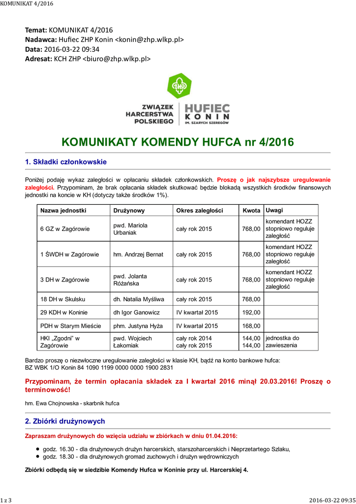 KOMUNIKAT4/2016 1z3 Temat: KOMUNIKAT 4/2016 Nadawca: Hufiec ZHP Konin <[email protected]> Data: 2016-03-22 09:34 Adresat: KCH ZHP <[email protected]> KOMUNIKATY KOMENDY HUFCA nr 4/2016 1. Składki członkowskie Poniżej podaję wykaz zaległości w opłacaniu składek członkowskich. Proszę o jak najszybsze uregulowanie zaległości. Przypominam, że brak opłacania składek skutkować będzie blokadą wszystkich środków finansowych jednostki na koncie w KH (dotyczy także środków 1%). Nazwa jednostki Drużynowy Okres zaległości Kwota Uwagi 6 GZ w Zagórowie pwd. Mariola Urbaniak cały rok 2015 komendant HOZZ 768,00 stopniowo reguluje zaległość 1 ŚWDH w Zagórowie hm. Andrzej Bernat cały rok 2015 komendant HOZZ 768,00 stopniowo reguluje zaległość 3 DH w Zagórowie pwd. Jolanta Różańska cały rok 2015 komendant HOZZ 768,00 stopniowo reguluje zaległość 18 DH w Skulsku dh. Natalia Myśliwa cały rok 2015 768,00 29 KDH w Koninie dh Igor Ganowicz IV kwartał 2015 192,00 PDH w Starym Mieście phm. Justyna Hyża IV kwartał 2015 168,00 HKI „Zgodni” w Zagórowie pwd. Wojciech Łakomiak cały rok 2014 cały rok 2015 144,00 jednostka do 144,00 zawieszenia Bardzo proszę o niezwłoczne uregulowanie zaległości w klasie KH, bądź na konto bankowe hufca: BZ WBK 1/O Konin 84 1090 1199 0000 0000 1900 2831 Przypominam, że termin opłacania składek za I kwartał 2016 minął 20.03.2016! Proszę o terminowość! hm. Ewa Chojnowska - skarbnik hufca 2. Zbiórki drużynowych Zapraszam drużynowych do wzięcia udziału w zbiórkach w dniu 01.04.2016: godz. 16.30 - dla drużynowych drużyn harcerskich, starszoharcerskich i Nieprzetartego Szlaku, godz. 18.30 - dla drużynowych gromad zuchowych i drużyn wędrowniczych Zbiórki odbędą się w siedzibie Komendy Hufca w Koninie przy ul. Harcerskiej 4. 2016-03-2209:35 KOMUNIKAT4/2016 2z3 hm. Michał Kałużny - komendant hufca 3. Ogólnopolska Konferencja Instruktorska Zapraszamy instruktorów oraz wędrowników pełniących funkcje instruktorskie do wzięcia udziału w Ogólnopolskiej Konferencji Instruktorskiej BYĆ WYCHOWAWCĄ... Konferencja odbędzie się w sobotę 23.04.2016 r. Zapraszamy instruktorów z całej Polski, więc udział kadry instruktorskiej naszego hufca jest bardzo pożądany! Szczegóły w załączniku. hm. Alina Głowacka - przewodnicząca HZKK 4. JUBILEUSZOWY ZLOT HUFCA Komenda Hufca informuje, że Jubileuszowy Zlot Hufca z okazji 100-lecia Harcerstwa na Ziemi Konińskiej odbędzie się w Koninie w dn. 20-22.05.2016 r. Szczegóły zostaną podane w terminie późniejszym. hm. Michał Kałużny - komendant hufca hm. Michał Kałużny - komendant hufca 5. XXI Kurs Przewodnikowski wraz z Kursem Drużynowych - przypomnienie Serdecznie zapraszamy na XXI Kurs Przewodnikowski wraz z Kursem Drużynowych Zuchowych i Harcerskich. 1. Termin: 17.07-27.07 2016 r. 2. Miejsce: Letnia Baza Hufca ZHP Konin, ul. Graniczna 10, 72-346 Pobierowo 3. Cena: koszt kursu 930 zł, w tym: - 465 zł - odpłatność uczestnika, - 465 zł - dofinansowanie komendy hufca. 4. Kontakt: Komenda Hufca ZHP (063) 243 19 20, e-mail: [email protected] lub przewodnicząca HZKK: hm. Alina Głowacka - 692-798-015, e-mail: [email protected] 5. Termin zgłoszeń: 30 kwietnia 2016 roku na załączonej karcie kwalifikacyjnej 6. Warunki rekrutacji: • wiek - co najmniej 16 lat (rocznikowo), • zobowiązanie się do prowadzenia, przejęcia lub założenia gromady lub drużyny, • rekomendacja bezpośredniego przełożonego (np. drużynowego, szczepowego lub namiestnika, ewentualnie komendanta hufca). hm. Alina Głowacka - przewodnicząca HZKK 6. Opłać składki z góry za 2016! To się opłaca! Komenda hufca na posiedzeniu w dniu 29.01.2011 przyjęła uchwałę nr 33/XVIII, w której postanowiła, co następuje: 1. Wprowadza się wydawanie drużynom, gromadom i kręgom Certyfikatu Jednostki. 2. Certyfikat, o którym mowa w pkt. 1 otrzymuje drużyna, gromada lub krąg, która do końca I kwartału danego roku kalendarzowego (do 31 marca) opłaci składki członkowskie za cały rok kalendarzowy z góry za wszystkich członków jednostki zgodnie z danymi z systemu EWIDENCJA ZHP. 3. Certyfikat obowiązuje od 1 kwietnia roku kalendarzowego, za który opłacono składki do 31 marca roku następnego. 4. Wykaz jednostek, które otrzymują Certyfikat ogłasza komendant hufca corocznie do 10 kwietnia. 5. Certyfikat Jednostki uprawnia drużynę, gromadę, krąg w danym roku kalendarzowym do: - otrzymania 20% zniżki na wpisowe na imprezy ogólnohufcowe (zlot, złaz, biwak z okazji Dnia Myśli Braterskiej, rajd wiosenny), - niepotrącania przez Komendę Hufca 5% tytułem kosztów obsługi kampanii 1% podatku. Zachęcam do skorzystania z tej możliwości! Naprawdę warto. hm. Ewa Chojnowska – skarbnik hufca 2016-03-2209:35 KOMUNIKAT4/2016 3z3 Chcesz być na bieżąco? Regularnie odwiedzaj strony ZHP: www.zhp.pl www.zhp.wlkp.pl www.konin.zhp.pl Ten e-mail został wysłany z komputera wolnego od wirusów chronionego przez Avast. www.avast.com Załączniki: Ogólnopolska Konferencja Instruktorska 2016.pdf 176 KB XXI Kurs Drużynowych - karta kwalifikacyjna.doc 173 KB 2016-03-2209:35