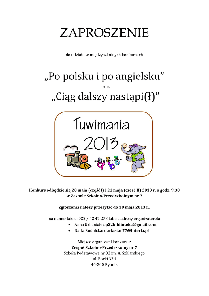 ZAPROSZENIE do udziału w międzyszkolnych konkursach „Po polsku i po angielsku” oraz „Ciąg dalszy nastąpi(ł)” Konkurs odbędzie się 20 maja (część I) i 21 maja (część II) 2013 r. o godz. 9:30 w Zespole Szkolno-Przedszkolnym nr 7 Zgłoszenia należy przesyłać do 10 maja 2013 r.: na numer faksu: 032 / 42 47 278 lub na adresy organizatorek: Anna Urbaniak: [email protected] Daria Rudnicka: [email protected] Miejsce organizacji konkursu: Zespół Szkolno-Przedszkolny nr 7 Szkoła Podstawowa nr 32 im. A. Szklarskiego ul. Borki 37d 44-200 Rybnik ZAŁOŻENIA REGULAMINOWE Międzyszkolnego Konkursu „Po polsku i po angielsku – Tuwimania 2013” 1. Celem konkursu jest: a) motywowanie uczniów do nauki języka angielskiego, b) doskonalenie czytania ze zrozumieniem, c) popularyzacja czytelnictwa, d) popularyzacja twórczości Juliana Tuwima w ramach obchodów Roku Juliana Tuwima (2013), e) promowanie dzieci uzdolnionych, f) zachęcanie dzieci do wystąpień publicznych i podnoszenie poczucia własnej wartości, g) wpajanie zasad współdziałania w grupie, kształcenie postaw pożądanych społecznie, h) integracja dzieci przedszkolnych i uczniów. 2. Konkurs podzielony jest na dwie części: a) część I – klasy II i III szkół podstawowych, b) część II – dla wychowanków przedszkola z grup dzieci sześcioletnich oraz uczniów klas I szkół podstawowych. 3. W konkursie mogą wziąć udział wychowankowie przedszkola z grup dzieci sześcioletnich oraz uczniowie klas I-III szkół podstawowych z Rybnika i powiatu rybnickiego. W zmaganiach biorą udział 3-osobowe drużyny (część I) oraz grupy i klasy szkolne (część II), po jednej z każdej zgłoszonej placówki. 4. Warunki uczestnictwa w konkursie dla uczestników części I (klasy II i III SP): a) znajomość wierszy Juliana Tuwima: Lokomotywa, Rzepka, Abecadło, Okulary, O Grzesiu kłamczuchu i jego cioci, Zosia Samosia, Słoń Trąbalski, Ptasie radio, Skakanka, Spóźniony słowik, List do dzieci, Dyzio marzyciel, Cuda i dziwy, Słówka i słufka, Dwa Michały, O panu Tralalińskim, Murzynek Bambo. b) znajomość języka angielskiego na poziomie podstawy programowej kl. II i III szkoły podstawowej (nazwy zawodów, kolorów, zwierząt i ptaków, członków rodziny, liczby), c) ocenie podlegają przebrania dzieci (nawiązujące do podanych wierszy). 5. Warunki uczestnictwa w konkursie dla uczestników części II (przedszkola i klasy I SP): a) znajomość wierszy Juliana Tuwima: Lokomotywa, Rzepka, Abecadło, Okulary, Zosia Samosia, Skakanka, Spóźniony słowik, List do dzieci, Dyzio marzyciel, Murzynek Bambo. b) znajomość języka angielskiego – nazwy kolorów, zwierząt, członków rodziny, liczby od 1 do 10, c) przygotowanie przez grupę krótkiej scenki na podstawie treści wybranego wiersza (do 5 minut), d) ocenie podlegają przebrania dzieci (nawiązujące do podanych wierszy). 6. Zgłoszenia (karty zgłoszenia – załącznik 1 do regulaminu) należy nadsyłać do 10 maja 2013 r. Można to uczynić w następujący sposób: a) osobiście lub pocztą (decyduje data stempla) na adres: Zespół Szkolno-Przedszkolny nr 7 ul. Borki 37d 44-200 Rybnik b) faksem na numer: 0 32 / 42 47 278 c) na adresy e-mail: [email protected] (Anna Urbaniak), [email protected] (Daria Rudnicka) 7. Na laureatów konkursu czekają atrakcyjne nagrody. 8. Wszystkie aktualne informacje, a w przyszłości także zdjęcia uczestników i podziękowania wszystkim, którzy wesprą naszą inicjatywę, zostaną zamieszczone na stronie: sp32.rybnik.pl oraz biblioteka.sp32.rybnik.pl. 9. Udział w konkursie jest równoznaczny ze zgodą na bezpłatną publikację na stronie internetowej organizatora oraz w prasie wizerunków uczestników oraz nazwisk zwycięzców. ZAŁOŻENIA REGULAMINOWE Międzyszkolnego Konkursu Plastycznego „Ciąg dalszy nastąpi(ł) – Tuwimania 2013” 1. Celem konkursu jest: a) prezentacja możliwości twórczych dzieci przedszkolnych i szkolnych, b) wymiana doświadczeń plastycznych i estetycznych, c) rozwijanie wrażliwości artystycznej dzieci, d) popularyzacja twórczości Juliana Tuwima w ramach obchodów Roku Juliana Tuwima (2013). 2. Tematyka: Własna interpretacja wybranego wiersza Juliana Tuwima – przedstawienie dalszego ciągu utworu. Nie kopiujcie gotowych ilustracji wierszy J. Tuwima, niech pozostaną dla was wyłącznie inspiracją tworzenia własnych pięknych prac. 3. Technika : a) malarstwo (pastele, farby olejne), b) techniki mieszane. 4. Uczestnicy: a) przedszkole dzieci 6 lat oraz uczniowie klas I szkół podstawowych, b) klasy II i III szkół podstawowych. 5. Format: A3 lub dla chętnych większy (A2) 6. Termin: Prace należy dostarczyć lub przesłać na adres szkoły do 10 maja 2013 r. Można to uczynić osobiście lub przesłać pocztą (decyduje data stempla) na adres: Zespół Szkolno-Przedszkolny nr 7 ul. Borki 37d 44-200 Rybnik 7. Finał: Uroczyste podsumowanie konkursu, rozdanie nagród i dyplomów oraz otwarcie wystawy pokonkursowej odbędzie się dla: a) przedszkoli i kl. I – 21 maja 2013 r. b) dla kl. II-III – 20 maja 2013 r. 8. Zwycięzców powiadomimy telefonicznie. 9. Relacje i zdjęcia uczestników oraz prac konkursowych zostaną zamieszczone na stronie: sp32.rybnik.pl oraz biblioteka.sp32.rybnik.pl. 10. Udział w konkursie jest równoznaczny ze zgodą na bezpłatną publikację na stronie internetowej organizatora oraz w prasie wizerunków uczestników oraz nazwisk zwycięzców. Karta zgłoszenia do udziału w Międzyszkolnym Konkursie „Po polsku i po angielsku – Tuwimania 2013” Część …………………………* Nazwa placówki: …………………………………………………………………………………………………………………………..........…. Adres placówki: …………………………………………………………………………………………………………………………..........…. Opiekun: …