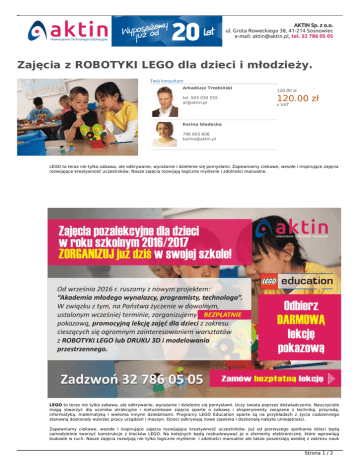 Zajęcia z ROBOTYKI LEGO dla dzieci i młodzieży. Twój konsultant Arkadiusz Trzebiński tel. 503 030 555 [email protected] NOWOŚĆ W OFERCIE 120.00 zł 120.00 zł z VAT Karina Gładecka 796 603 606 [email protected] LEGO to teraz nie tylko zabawa, ale odkrywanie, wyrażanie i dzielenie się pomysłami. Zapewniamy ciekawe, wesołe i inspirujące zajęcia rozwijające kreatywność uczestników. Nasze zajęcia rozwijają logiczne myślenie i zdolności manualne. LEGO to teraz nie tylko zabawa, ale odkrywanie, wyrażanie i dzielenie się pomysłami. Uczy świata poprzez doświadczenie. Nauczyciele mogą stworzyć dla uczniów atrakcyjne i nietuzinkowe zajęcia oparte o zabawę i eksperymenty związane z techniką, przyrodą, informatyką, matematyką i wieloma innymi dziedzinami. Programy LEGO Education oparte są na przykładach z życia codziennego stanowią doskonały wzorzec pracy urządzeń i maszyn. Dzieci odkrywają nowe zjawiska i doskonalą nabyte umiejętności. Zapewniamy ciekawe, wesołe i inspirujące zajęcia rozwijające kreatywność uczestników. Już od pierwszego spotkania dzieci będą samodzielnie tworzyć konstrukcje z klocków LEGO. Na kolejnych będą rozbudowywać je o elementy elektroniczne, które wprawiają budowle w ruch. Nasze zajęcia rozwijają nie tylko logiczne myślenie i zdolności manualne ale także poszerzają wiedzę z zakresu nauk Strona 1 / 2 ścisłych. Nasze zajęcia niezmiennie budzą ogromne zainteresowanie wśród wszystkich dzieci. Inicjowane przez nas aktywności uczą myślenia analitycznego , pobudzają wyobraźnię przestrzenną i rozszerzają wiedzę z zakresu nauk ścisłych. Z nami dzieci uczą się współpracy w grupie. Dziewczynki bawią się podczas naszych zajęć tak samo dobrze jak chłopcy! Zajęcia, oparte na naszym autorskim programie edukacyjnym, przeznaczone są dla szerokiej grupy dzieci w wieku od 6 do 15 lat. Zapraszamy wszystkie dzieci młodsze i starsze! Zapewniamy ciekawe, wesołe i inspirujące zajęcia rozwijające kreatywność uczestników. Już od pierwszego spotkania dzieci będą samodzielnie tworzyć konstrukcje z klocków LEGO. Na kolejnych będą rozbudowywać je o elementy elektroniczne, które wprawiają budowle w ruch. Nasze zajęcia rozwijają nie tylko logiczne myślenie i zdolności manualne ale także poszerzają wiedzę z zakresu nauk ścisłych. Nasze zajęcia niezmiennie budzą ogromne zainteresowanie wśród wszystkich dzieci! Zajęcia z Robotyki LEGO WeDu dla dzieci 6+ Zajęcia z Robotyki LEGO Mindstorm dla dzieci 9+ Zajęcia z Druku i Modelowania przestrzennego 3D dla dzieci 9+ CENA: 149 zł – 4 zajęcia (raz w tygodniu) CZAS TRWANIA: 1,5 godziny LICZBA DZIECI W GRUPIE: max 14 osób PROWADZACY: mgr Piotr Cichy mgr Sławomir Binek Strona 2 / 2 Powered by TCPDF (www.tcpdf.org)