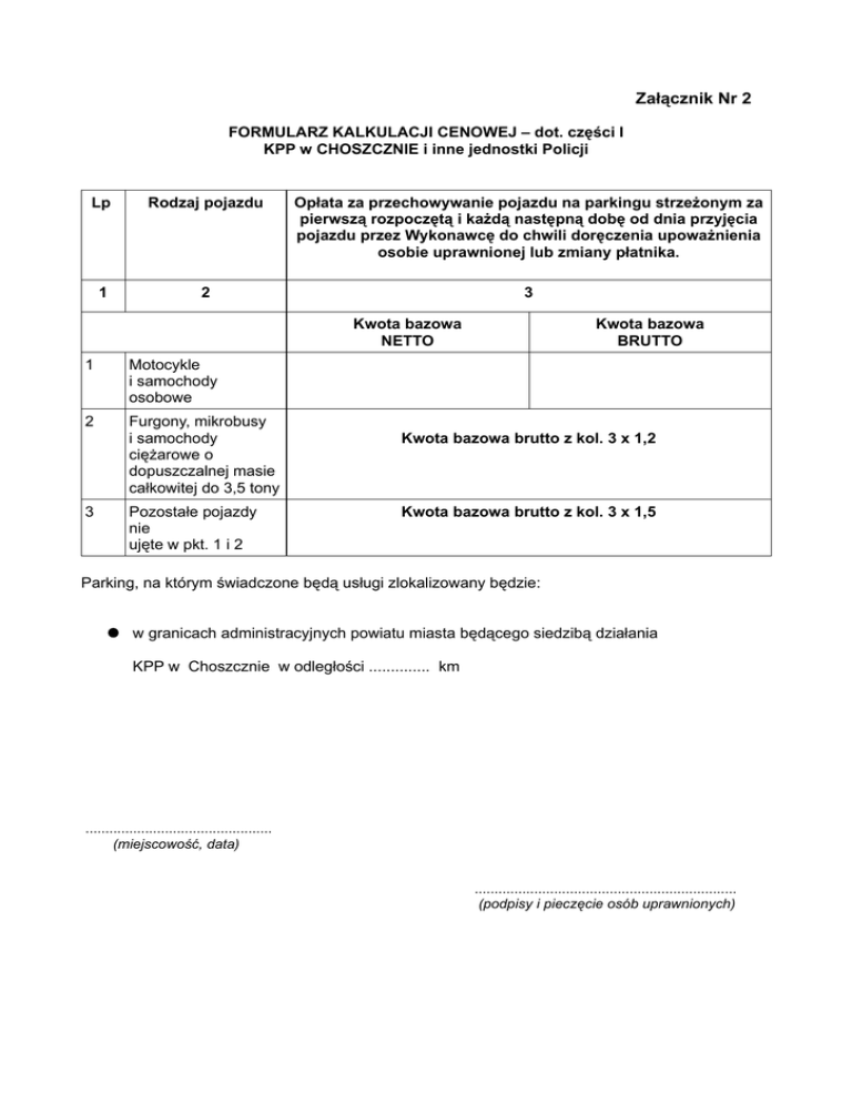 Załącznik Nr 2 FORMULARZ KALKULACJI CENOWEJ – dot. części I KPP w CHOSZCZNIE i inne jednostki Policji Lp Rodzaj pojazdu Opłata za przechowywanie pojazdu na parkingu strzeżonym za pierwszą rozpoczętą i każdą następną dobę od dnia przyjęcia pojazdu przez Wykonawcę do chwili doręczenia upoważnienia osobie uprawnionej lub zmiany płatnika. 1 2 3 Kwota bazowa NETTO 1 Motocykle i samochody osobowe 2 Furgony, mikrobusy i samochody ciężarowe o dopuszczalnej masie całkowitej do 3,5 tony 3 Pozostałe pojazdy nie ujęte w pkt. 1 i 2 Kwota bazowa BRUTTO Kwota bazowa brutto z kol. 3 x 1,2 Kwota bazowa brutto z kol. 3 x 1,5 Parking, na którym świadczone będą usługi zlokalizowany będzie: w granicach administracyjnych powiatu miasta będącego siedzibą działania KPP w Choszcznie w odległości .............. km ............................................... (miejscowość, data) .................................................................. (podpisy i pieczęcie osób uprawnionych) Załącznik Nr 2 (a) FORMULARZ KALKULACJI CENOWEJ – dot. części II KPP w GRYFICACH i inne jednostki Policji Lp Rodzaj pojazdu Opłata za przechowywanie pojazdu na parkingu strzeżonym za pierwszą rozpoczętą i każdą następną dobę od dnia przyjęcia pojazdu przez Wykonawcę do chwili doręczenia upoważnienia osobie uprawnionej lub zmiany płatnika. 1 2 3 Kwota bazowa NETTO 1 Motocykle i samochody osobowe 2 Furgony, mikrobusy i samochody ciężarowe o dopuszczalnej masie całkowitej do 3,5 tony 3 Pozostałe pojazdy nie ujęte w pkt. 1 i 2 Kwota bazowa BRUTTO Kwota bazowa brutto z kol. 3 x 1,2 Kwota bazowa brutto z kol. 3 x 1,5 Parking, na którym świadczone będą usługi zlokalizowany będzie: w granicach administracyjnych powiatu miasta będącego siedzibą działania KPP w Gryficach w odległości ............. km ............................................... (miejscowość, data) .................................................................. (podpisy i pieczęcie osób uprawnionych) Załącznik Nr 2 (b) FORMULARZ KALKULACJI CENOWEJ – dot. części III KPP w ŚWIDWINIE i inne jednostki Policji Lp Rodzaj pojazdu Opłata za przechowywanie pojazdu na parkingu strzeżonym za pierwszą rozpoczętą i każdą następną dobę od dnia przyjęcia pojazdu przez Wykonawcę do chwili doręczenia upoważnienia osobie uprawnionej lub zmiany płatnika. 1 2 3 Kwota bazowa NETTO 1 Motocykle i samochody osobowe 2 Furgony, mikrobusy i samochody ciężarowe o dopuszczalnej masie całkowitej do 3,5 tony 3 Pozostałe pojazdy nie ujęte w pkt. 1 i 2 Kwota bazowa BRUTTO Kwota bazowa brutto z kol. 3 x 1,2 Kwota bazowa brutto z kol. 3 x 1,5 Parking, na którym świadczone będą usługi zlokalizowany będzie: w granicach administracyjnych powiatu miasta będącego siedzibą działania KPP w Świdwinie w odległości .............. km ............................................... (miejscowość, data) .................................................................. (podpisy i pieczęcie osób uprawnionych) Załącznik Nr 2 (c) FORMULARZ KALKULACJI CENOWEJ – dot. części IV KPP w KAMIENIU POMORSKIM i inne jednostki Policji Lp Rodzaj pojazdu Opłata za przechowywanie pojazdu na parkingu strzeżonym za pierwszą rozpoczętą i każdą następną dobę od dnia przyjęcia pojazdu przez Wykonawcę do chwili doręczenia upoważnienia osobie uprawnionej lub zmiany płatnika. 1 2 3 Kwota bazowa NETTO 1 Motocykle i samochody osobowe 2 Furgony, mikrobusy i samochody ciężarowe o dopuszczalnej masie całkowitej do 3,5 tony 3 Pozostałe pojazdy nie ujęte w pkt. 1 i 2 Kwota bazowa BRUTTO Kwota bazowa brutto z kol. 3 x 1,2 Kwota bazowa brutto z kol. 3 x 1,5 Parking, na którym świadczone będą usługi zlokalizowany będzie: w granicach administracyjnych powiatu miasta będącego siedzibą działania KPP w Kamieniu Pomorskim w odległości .............. km ............................................... (miejscowość, data) .................................................................. (podpisy i pieczęcie osób uprawnionych) Załącznik Nr 2 (d) FORMULARZ KALKULACJI CENOWEJ – dot. części V KMP w KOSZALINIE i inne jednostki Policji Lp Rodzaj pojazdu Opłata za przechowywanie pojazdu na parkingu strzeżonym za pierwszą rozpoczętą i każdą następną dobę od dnia przyjęcia pojazdu przez Wykonawcę do chwili doręczenia upoważnienia osobie uprawnionej lub zmiany płatnika. 1 2 3 Kwota bazowa NETTO 1 Motocykle i samochody osobowe 2 Furgony, mikrobusy i samochody ciężarowe o dopuszczalnej masie całkowitej do 3,5 tony 3 Pozostałe pojazdy nie ujęte w pkt. 1 i 2 Kwota bazowa BRUTTO Kwota bazowa brutto z kol. 3 x 1,2 Kwota bazowa brutto z kol. 3 x 1,5 Parking, na którym świadczone będą usługi zlokalizowany będzie: na terenie miasta będącego siedzibą działania Komendy Miejskiej Policji w Koszalinie, przy ul. ........................................................................ w odległości ....................... km; ............................................... (miejscowość, data) .................................................................. (podpisy i pieczęcie osób uprawnionych) Załącznik Nr 2 (e) FORMULARZ KALKULACJI CENOWEJ – dot. części VI KPP w PYRZYCACH i inne jednostki Policji Lp Rodzaj pojazdu Opłata za przechowywanie pojazdu na parkingu strzeżonym za pierwszą rozpoczętą i każdą następną dobę od dnia przyjęcia pojazdu przez Wykonawcę do chwili doręczenia upoważnienia osobie uprawnionej lub zmiany płatnika. 1 2 3 Kwota bazowa NETTO 1 Motocykle i samochody osobowe 2 Furgony, mikrobusy i samochody ciężarowe o dopuszczalnej masie całkowitej do 3,5 tony 3 Pozostałe pojazdy nie ujęte w pkt. 1 i 2 Kwota bazowa BRUTTO Kwota bazowa brutto z kol. 3 x 1,2 Kwota bazowa brutto z kol. 3 x 1,5 Parking, na którym świadczone będą usługi zlokalizowany będzie: w granicach administracyjnych powiatu miasta będącego siedzibą działania KP