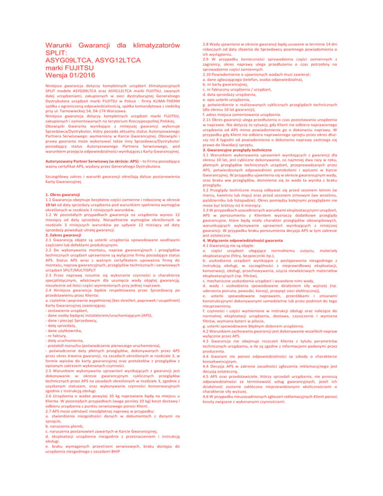 Warunki Gwarancji dla klimatyzatorów SPLIT: ASYG09LTCA, ASYG12LTCA marki FUJITSU Wersja 01/2016 Niniejsza gwarancja dotyczy kompletnych urządzeń klimatyzacyjnych SPLIT modele ASYG09LTCA oraz ASYG12LTCA marki FUJITSU, zwanych dalej urządzeniami, zakupionych w sieci dystrybucyjnej Generalnego Dystrybutora urządzeń marki FUJITSU w Polsce - firmy KLIMA-THERM spółka z ograniczoną odpowiedzialnością, spółka komandytowa z siedzibą przy ul. Tarnowieckiej 54, 04-174 Warszawa. Niniejsza gwarancja dotyczy kompletnych urządzeń marki FUJITSU, zakupionych i zamontowanych na terytorium Rzeczypospolitej Polskiej, Obowiązki Gwaranta wynikające z niniejszej gwarancji wykonuje Sprzedawca/Dystrybutor, który posiada aktualny status Autoryzowanego Partnera Serwisowego: wymieniony w Karcie Gwarancyjnej. Obowiązki i prawa gwaranta może wykonywać także inny Sprzedawca/Dystrybutor posiadający status Autoryzowanego Partnera Serwisowego, pod warunkiem przejęcia odpowiedzialności wynikającej z Karty Gwarancyjnej. Autoryzowany Partner Serwisowy (w skrócie: APS) – to Firma posiadająca ważny certyfikat APS, wydany przez Generalnego Dystrybutora. Szczegółowy zakres i warunki gwarancji określają dalsze postanowienia Karty Gwarancyjnej. 1. Okres gwarancji 1.1 Gwarancja obejmuje bezpłatne części zamienne i robociznę w okresie 10 lat od daty sprzedaży urządzenia pod warunkiem spełnienia wymogów określonych w rozdziale 3 niniejszych warunków. 1.2 W pozostałych przypadkach gwarancja na urządzenia wynosi 12 miesięcy od daty sprzedaży. Niespełnienie wymogów określonych w rozdziale 3 niniejszych warunków po upływie 12 miesięcy od daty sprzedaży powoduje utratę gwarancji. 2. Zakres gwarancji 2.1 Gwarancją objęte są usterki urządzenia spowodowane wadliwymi częściami lub defektami produkcyjnymi. 2.2 Do wykonywania montażu, napraw gwarancyjnych i przeglądów technicznych urządzeń uprawnione są wyłącznie firmy posiadające status APS. Status APS wraz z ważnym certyfikatem upoważnia firmę do montażu, napraw gwarancyjnych, przeglądów technicznych i serwisowych urządzeń SPLIT/MULTISPLIT 2.3 Przez naprawę rozumie się wykonanie czynności o charakterze specjalistycznym, właściwym dla usunięcia wady objętej gwarancją, niezależnie od ilości części wymienionych przy jednej naprawie. 2.4 Niniejsza gwarancja będzie respektowana przez Sprzedawcę po przedstawieniu przez Klienta: a. czytelnie i poprawnie wypełnionej (bez skreśleń, poprawek i uzupełnień) Karty Gwarancyjnej zawierającej: - zestawienie urządzeń, - dane osoby będącej instalatorem/uruchamiającym (APS), - dane i pieczęć Sprzedawcy, - datę sprzedaży, - dane użytkownika, - nr faktury, - datę uruchomienia, - protokół rozruchu (poświadczenie pierwszego uruchomienia), - poświadczenie daty płatnych przeglądów, dokonywanych przez APS przez okres trwania gwarancji, na zasadach określonych w rozdziale 3, w formie wpisów do karty gwarancyjnej oraz protokołów z przeglądów z opisanym zakresem wykonanych czynności. 2.5 Warunkiem wykonywania uprawnień wynikających z gwarancji jest dokonywanie w okresie gwarancyjnym cyklicznych przeglądów technicznych przez APS na zasadach określonych w rozdziale 3, zgodnie z uzyskanym statusem, oraz wykonywanie czynności konserwacyjnych zgodnie z instrukcją obsługi. 2.6 Urządzenia o wadze powyżej 10 kg naprawiane będą na miejscu u Klienta. W pozostałych przypadkach (waga poniżej 10 kg) koszt dostawy i odbioru urządzenia z punktu serwisowego ponosi Klient. 2.7 APS może odmówić nieodpłatnej naprawy w przypadku: a. stwierdzenia niezgodności danych w dokumentach z danymi na sprzęcie, b. naruszenia plomb, c. naruszenia postanowień zawartych w Karcie Gwarancyjnej, d. eksploatacji urządzenia niezgodnie z przeznaczeniem i instrukcją obsługi. e. braku wymaganych przestrzeni serwisowych, braku dostępu do urządzenia niezgodnego z zasadami BHiP 2.8 Wady ujawnione w okresie gwarancji będą usuwane w terminie 14 dni roboczych od daty złożenia do Sprzedawcy pisemnego powiadomienia o ich wystąpieniu. 2.9 W przypadku konieczności sprowadzenia części zamiennych z zagranicy, okres naprawy ulega przedłużeniu o czas potrzebny na sprowadzenie części zamiennych. 2.10 Powiadomienie o ujawnionych wadach musi zawierać: a. dane zgłaszającego (telefon, osoba odpowiedzialna), b. nr karty gwarancyjnej, c. nr fabryczny urządzenia / urządzeń, d. data sprzedaży urządzenia, e. opis usterki urządzenia, g. potwierdzenie o realizowanych cyklicznych przeglądach technicznych (dla okresu 10 lat gwarancji), f. adres miejsca zamontowania urządzenia. 2.11 Okres gwarancji ulega przedłużeniu o czas pozostawania urządzenia w naprawie. Nie dotyczy to sytuacji, gdy Klient nie odbiera naprawionego urządzenia od APS mimo powiadomienia go o dokonaniu naprawy. W przypadku gdy Klient nie odbiera naprawionego sprzętu przez okres dłuższy niż 8 tygodni od powiadomienia o dokonaniu naprawy zastrzega się prawo do likwidacji sprzętu. 3. Gwarancyjne przeglądy techniczne 3.1 Warunkiem wykonywania uprawnień wynikających z gwarancji dla okresu 10 lat, jest cykliczne dokonywanie, co najmniej dwa razy w roku, płatnych przeglądów technicznych urządzeń, przeprowadzanych przez APS, potwierdzonych odpowiednimi protokołami i wpisami w Karcie Gwarancyjnej. W przypadku ujawnienia się w okresie gwarancyjnym wady, oraz braku ww przeglądów, domniema się że wada ta wynika z braku przeglądu. 3.2 Przeglądy techniczne muszą odbywać się przed sezonem letnim (w marcu, kwietniu lub maju) oraz przed sezonem zimowym (we wrześniu, październiku lub listopadzie). Okres pomiędzy kolejnymi przeglądami nie może być krótszy niż 6 miesięcy. 3.3 W przypadkach uzasadnionych warunkami eksploatacyjnymi urządzeń, APS w porozumieniu z Klientem wyznaczy dodatkowe przeglądy gwarancyjne, które będą miały charakter przeglądów obowiązkowych, warunkuj
