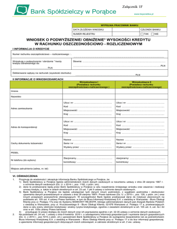Bank Spółdzielczy w Porąbce Załącznik 1F www.bsporabka.pl WYPEŁNIA PRACOWNIK BANKU DATA ZŁOŻENIA WNIOSKU CZŁONEK BANKU NUMER REJESTRU TAK NIE WNIOSEK O PODWYŻSZENIE/ OBNIŻENIE* WYSOKOŚCI KREDYTU W RACHUNKU OSZCZEDNOŚCIOWO - ROZLICZENIOWYM I INFORMACJA O KREDYCIE Numer rachunku oszczędnościowo – rozliczeniowego : . ......................................................................................................................................... Wnioskuję o podwyższenie / obniżenie * kwoty kredytu odnawialnego do: Słownie: ……………………………..…………………….……………………………………… ………………….………………………………..……………………………………………PLN …………….………………………. PLN Deklarowane wpływy na rachunek (wysokość dochodu): ………………………………………………………………… PLN II INFORMACJE O WNIOSKODAWCACH Wnioskodawca I (Posiadacz rachunku oszczędnościowo-rozliczeniowego ) Wnioskodawca II (Posiadacz rachunku oszczędnościowo-rozliczeniowego) Imiona Nazwisko Adres zamieszkania Adres do korespondencji Cechy dokumentu tożsamości Ulica i nr: …………….……….…………………. Ulica i nr: …………….……….…………………. Kod: ……………………………………………... Kod: ……………………………………………... Miejscowość: …………………….……………… Miejscowość: …………………….……………… Kraj: ……………………………………………... Kraj: ……………………………………………... Ulica i nr: …………….……….…………………. Ulica i nr: …………….……….…………………. Kod: ……………………………………………... Kod: ……………………………………………... Miejscowość: …………………….……………… Miejscowość: …………………….……………… Kraj: ……………………………………………... Kraj: ……………………………………………... Nazwa: …………………………………………. Nazwa: …………………………………………. Seria i nr ……………………………………….. Seria i nr ……………………………………….. Wydany przez: ................................................ Wydany przez: ................................................ Stacjonarny…………………………….………… stacjonarny: ……………………………………… komórkowy: ………………………….………….. komórkowy: ……………………….……………… PESEL Nr telefonu (do wyboru) Miejsce zatrudnienia (adres, nr. tel) VI. OŚWIADCZENIA 1. 2. Przyjmuję do wiadomości i akceptuje informację Banku Spółdzielczego w Porąbce, że: 1) Bank Spółdzielczy w Porąbce będzie administratorem moich danych osobowych w rozumieniu ustawy z dnia 29 sierpnia 1997 r. o ochronie danych osobowych (Dz. U. z 2014 r., poz. 1182, z późn. zm); 2) dane te przetwarzane będą przez Bank Spółdzielczy w Porąbce w celu rozpatrzenia niniejszego wniosku oraz zawarcia i realizacji umowy kredytu, a także w celach określonych w art. 23 ust. 1 pkt 5 ustawy o ochronie danych osobowych; 3) Bank Spółdzielczy w Porąbce nie będzie udostępniać tych danych innym podmiotom, z wyjątkiem podmiotów i okoliczności ujawnienia danych przewidzianych w ustawie z dnia 29 sierpnia 1997r. Prawo bankowe (Dz. U. z 2015 r., poz. 128, z późn. zm.) oraz innych przepisach powszechnie obowiązujących. W szczególności Bank będzie przekazywał dane do instytucji utworzonych na podstawie art. 105 ust. 4 ustawy Prawo bankowe, w tym do Biura Informacji Kredytowej S.A. z siedzibą w Warszawie - Biuro Obsługi Klienta przy ul. Postępu 17a oraz do Systemu BANKOWY REJESTR, którego administratorem danych jest Związek Banków Polskich z siedzibą w Warszawie, przy ul. Kruczkowskiego 8 - Biuro Obsługi Klienta, 02-676 Warszawa ul. Postępu 17 a, przetwarzających dane w celu oceny zdolności kredytowej i analizy ryzyka kredytowego, zgodnie z zasadami określonymi w art. 105 ust. 4, ust. 4a i 4d oraz w art. 105a ustawy Prawo bankowe. 4) przysługuje mi prawo dostępu do moich danych oraz ich poprawiania zgodnie z art. 32-35 ustawy o ochronie danych osobowych. Na podstawie art. 24 ust. 1 ustawy z dnia 9 kwietnia 2010 r. o udostępnianiu informacji gospodarczych i wymianie danych gospodarczych (Dz. U. z 2014 r., poz.1015 z późn. zm.) upoważniam Bank Spółdzielczy w Porąbce do wystąpienia bezpośrednio lub za pośrednictwem Biura Informacji Kredytowej S.A. z siedzibą w Warszawie – Biuro Obsługi Klienta przy ul. Postępu 17 a do biur informacji gospodarczej o ujawnienie informacji gospodarczych dotyczących moich zobowiązań, w zakresie określonym w art. 2 ww. ustawy. 3. Na podstawie Ustawy o ochronie danych osobowych z dnia 29.08.1997 r. (Dz. U. 2014r., poz. 1182 z późn. zm.), wyrażam zgodę na przetwarzanie moich danych osobowych przez Bank Spółdzielczy w Porąbce w celu reklamy produktów i usług Banku: Wnioskodawca I TAK 4. NIE Wnioskodawca II TAK Zgoda ta może być odwołana w każdym czasie. Na podstawie ustawy z dnia 16 lipca 2004r. Prawo telekomunikacyjne (Dz.U. z 2014r., poz. 243 z późn. zm.) wyrażam zgodę na wykorzystanie podanych danych teleadresowych w celu marketingu bezpośredniego Banku przy użyciu telekomunikacyjnych urządzeń końcowych (telefon, internet) oraz automatycznych systemów wywołujących, polegającego na otrzymywaniu informacji handlowych o produktach i usługach oferowanych przez Bank, w tym także po wygaśnięciu/ rozwiązaniu Umowy; Wnioskodawca I TAK 5. NIE Wnioskodawca II TAK TAK 2) NIE Wnioskodawca II TAK TAK NIE Wnioskodawca II TAK TAK 9. 10. 11. 12. 13. NIE Wyrażam zgodę na przetwarzanie i przek