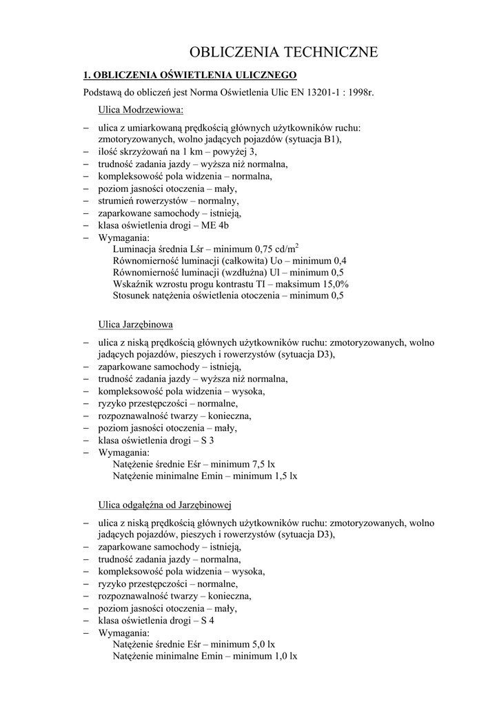 OBLICZENIA TECHNICZNE 1. OBLICZENIA OŚWIETLENIA ULICZNEGO Podstawą do obliczeń jest Norma Oświetlenia Ulic EN 13201-1 : 1998r. Ulica Modrzewiowa: − ulica z umiarkowaną prędkością głównych uŜytkowników ruchu: zmotoryzowanych, wolno jadących pojazdów (sytuacja B1), − ilość skrzyŜowań na 1 km – powyŜej 3, − trudność zadania jazdy – wyŜsza niŜ normalna, − kompleksowość pola widzenia – normalna, − poziom jasności otoczenia – mały, − strumień rowerzystów – normalny, − zaparkowane samochody – istnieją, − klasa oświetlenia drogi – ME 4b − Wymagania: Luminacja średnia Lśr – minimum 0,75 cd/m2 Równomierność luminacji (całkowita) Uo – minimum 0,4 Równomierność luminacji (wzdłuŜna) Ul – minimum 0,5 Wskaźnik wzrostu progu kontrastu TI – maksimum 15,0% Stosunek natęŜenia oświetlenia otoczenia – minimum 0,5 Ulica Jarzębinowa − ulica z niską prędkością głównych uŜytkowników ruchu: zmotoryzowanych, wolno jadących pojazdów, pieszych i rowerzystów (sytuacja D3), − zaparkowane samochody – istnieją, − trudność zadania jazdy – wyŜsza niŜ normalna, − kompleksowość pola widzenia – wysoka, − ryzyko przestępczości – normalne, − rozpoznawalność twarzy – konieczna, − poziom jasności otoczenia – mały, − klasa oświetlenia drogi – S 3 − Wymagania: NatęŜenie średnie Eśr – minimum 7,5 lx NatęŜenie minimalne Emin – minimum 1,5 lx Ulica odgałęźna od Jarzębinowej − ulica z niską prędkością głównych uŜytkowników ruchu: zmotoryzowanych, wolno jadących pojazdów, pieszych i rowerzystów (sytuacja D3), − zaparkowane samochody – istnieją, − trudność zadania jazdy – normalna, − kompleksowość pola widzenia – wysoka, − ryzyko przestępczości – normalne, − rozpoznawalność twarzy – konieczna, − poziom jasności otoczenia – mały, − klasa oświetlenia drogi – S 4 − Wymagania: NatęŜenie średnie Eśr – minimum 5,0 lx NatęŜenie minimalne Emin – minimum 1,0 lx