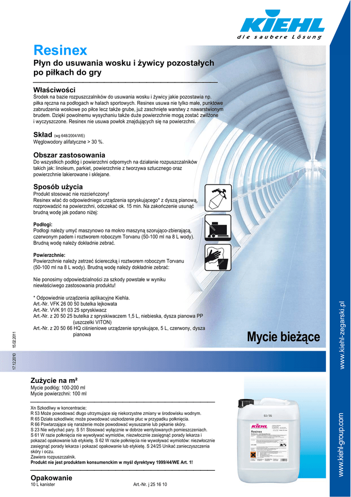 Resinex Płyn do usuwania wosku i żywicy pozostałych po piłkach do gry ⎯⎯⎯⎯⎯⎯⎯⎯⎯⎯⎯⎯⎯⎯⎯⎯⎯⎯⎯⎯⎯⎯⎯⎯⎯⎯ Właściwości Środek na bazie rozpuszczalników do usuwania wosku i żywicy jakie pozostawia np. piłka ręczna na podłogach w halach sportowych. Resinex usuwa nie tylko małe, punktowe zabrudzenia woskowe po piłce lecz także grube, już zaschnięte warstwy z nawarstwionym brudem. Dzięki powolnemu wysychaniu także duże powierzchnie mogą zostać zwilżone i wyczyszczone. Resinex nie usuwa powłok znajdujących się na powierzchni. Skład (wg 648/2004/WE) Węglowodory alifatyczne > 30 %. Obszar zastosowania Do wszystkich podłóg i powierzchni odpornych na działanie rozpuszczalników takich jak: linoleum, parkiet, powierzchnie z tworzywa sztucznego oraz powierzchnie lakierowane i sklejane. Sposób użycia Produkt stosować nie rozcieńczony! Resinex wlać do odpowiedniego urządzenia spryskującego* z dyszą pianową, rozprowadzić na powierzchni, odczekać ok. 15 min. Na zakończenie usunąć brudną wodę jak podano niżej: Podłogi: Podłogi należy umyć maszynowo na mokro maszyną szorująco-zbierającą, czerwonym padem i roztworem roboczym Torvanu (50-100 ml na 8 L wody). Brudną wodę należy dokładnie zebrać. Powierzchnie: Powierzchnie należy zetrzeć ściereczką i roztworem roboczym Torvanu (50-100 ml na 8 L wody). Brudną wodę należy dokładnie zebrać: Mycie bieżące www.kiehl-zegarski.pl * Odpowiednie urządzenia aplikacyjne Kiehla. Art.-Nr. VFK 26 00 50 butelka lejkowata Art.-Nr. VVK 91 03 25 spryskiwacz Art.-Nr. z 20 50 25 butelka z spryskiwaczem 1,5 L, niebieska, dysza pianowa PP (uszczelki VITON) Art.-Nr. z 20 50 66 HQ ciśnieniowe urządzenie spryskujące, 5 L, czerwony, dysza pianowa 17.12.2010 Zużycie na m² Mycie podłóg: 100-200 ml Mycie powierzchni: 100 ml ⎯⎯⎯⎯⎯⎯⎯⎯⎯⎯⎯⎯⎯⎯⎯⎯⎯⎯⎯⎯⎯⎯⎯⎯⎯⎯ Xn Szkodliwy w koncentracie; R 53 Może powodować długo utrzymujące się niekorzystne zmiany w środowisku wodnym. R 65 Działa szkodliwie; może powodować uszkodzenie płuc w przypadku połknięcia. R 66 Powtarzające się narażenie może powodować wysuszanie lub pękanie skóry. S 23 Nie wdychać pary. S 51 Stosować wyłącznie w dobrze wentylowanych pomieszczeniach. S 61 W razie połknięcia nie wywoływać wymiotów, niezwłocznie zasięgnąć porady lekarza i pokazać opakowanie lub etykietę. S 62 W razie połknięcia nie wywoływać wymiotów: niezwłocznie zasięgnąć porady lekarza i pokazać opakowanie lub etykietę. S 24/25 Unikać zanieczyszczenia skóry i oczu. Zawiera rozpuszczalnik. Produkt nie jest produktem konsumenckim w myśl dyrektywy 1999/44/WE Art. 1! ⎯⎯⎯⎯⎯⎯⎯⎯⎯⎯⎯⎯⎯⎯⎯⎯⎯⎯⎯⎯⎯⎯⎯⎯⎯⎯ Opakowanie 10 L kanister Art.-Nr. j 25 16 10 www.kiehl-group.com 15.02.2011 Nie ponosimy odpowiedzialności za szkody powstałe w wyniku niewłaściwego zastosowania produktu!