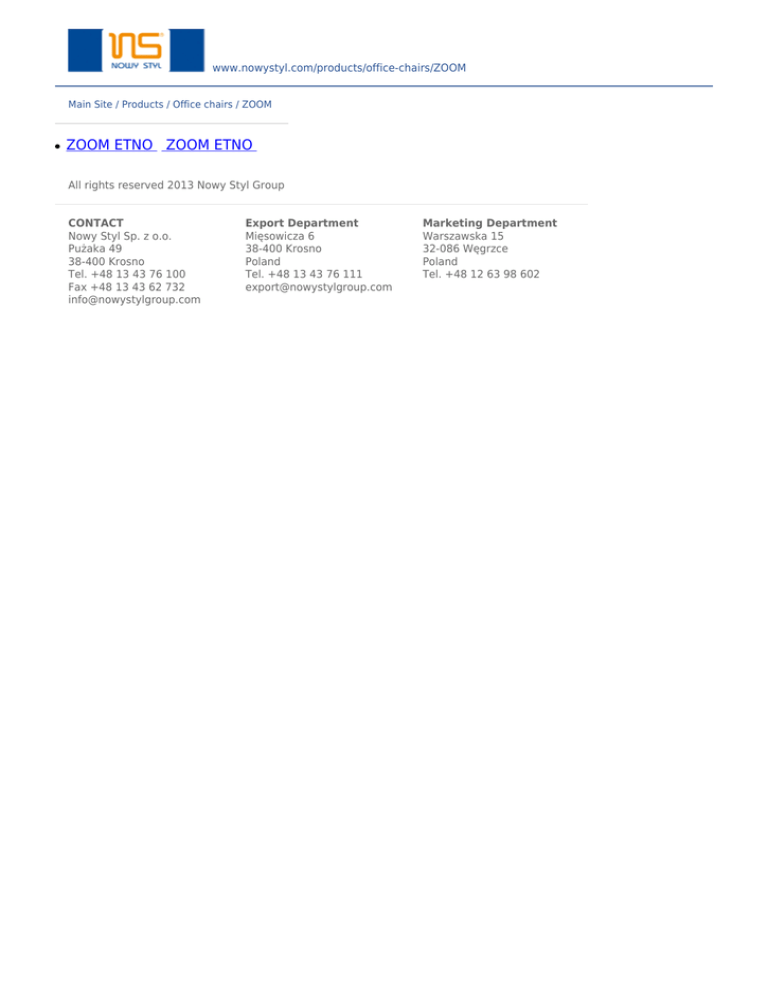www.nowystyl.com/products/office-chairs/ZOOM Main Site / Products / Office chairs / ZOOM ● ZOOM ETNO ZOOM ETNO All rights reserved 2013 Nowy Styl Group CONTACT Nowy Styl Sp. z o.o. Pużaka 49 38-400 Krosno Tel. +48 13 43 76 100 Fax +48 13 43 62 732 [email protected] Export Department Mięsowicza 6 38-400 Krosno Poland Tel. +48 13 43 76 111 [email protected] Marketing Department Warszawska 15 32-086 Węgrzce Poland Tel. +48 12 63 98 602