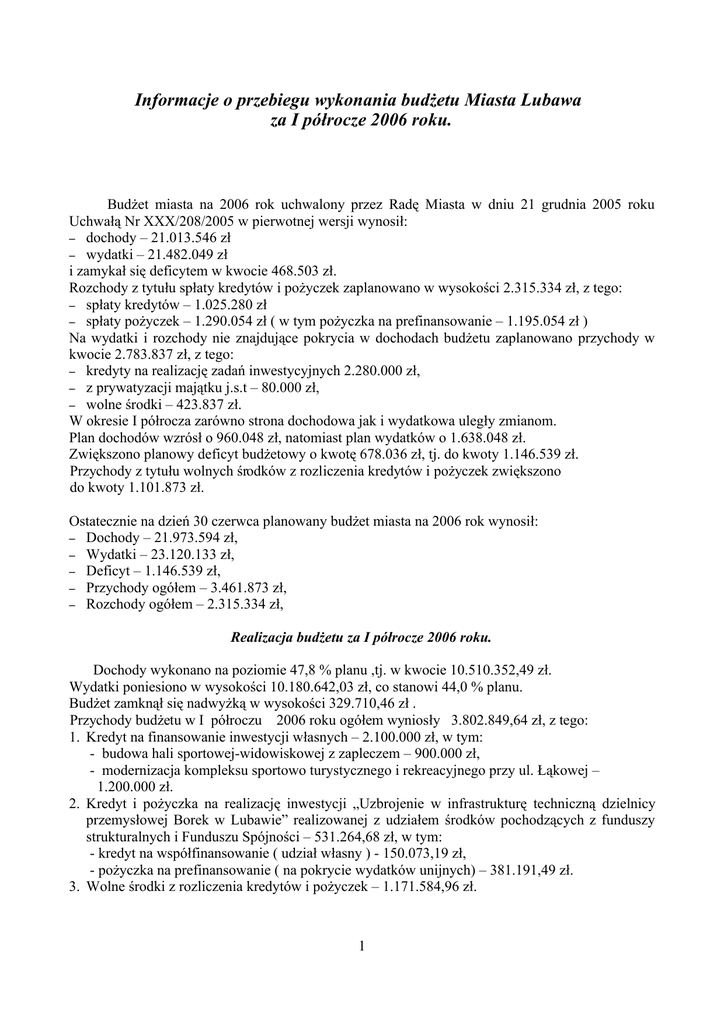 Informacje o przebiegu wykonania budżetu Miasta Lubawa za I półrocze 2006 roku. Budżet miasta na 2006 rok uchwalony przez Radę Miasta w dniu 21 grudnia 2005 roku Uchwałą Nr XXX/208/2005 w pierwotnej wersji wynosił: – dochody – 21.013.546 zł – wydatki – 21.482.049 zł i zamykał się deficytem w kwocie 468.503 zł. Rozchody z tytułu spłaty kredytów i pożyczek zaplanowano w wysokości 2.315.334 zł, z tego: – spłaty kredytów – 1.025.280 zł – spłaty pożyczek – 1.290.054 zł ( w tym pożyczka na prefinansowanie – 1.195.054 zł ) Na wydatki i rozchody nie znajdujące pokrycia w dochodach budżetu zaplanowano przychody w kwocie 2.783.837 zł, z tego: – kredyty na realizację zadań inwestycyjnych 2.280.000 zł, – z prywatyzacji majątku j.s.t – 80.000 zł, – wolne środki – 423.837 zł. W okresie I półrocza zarówno strona dochodowa jak i wydatkowa uległy zmianom. Plan dochodów wzrósł o 960.048 zł, natomiast plan wydatków o 1.638.048 zł. Zwiększono planowy deficyt budżetowy o kwotę 678.036 zł, tj. do kwoty 1.146.539 zł. Przychody z tytułu wolnych środków z rozliczenia kredytów i pożyczek zwiększono do kwoty 1.101.873 zł. Ostatecznie na dzień 30 czerwca planowany budżet miasta na 2006 rok wynosił: – Dochody – 21.973.594 zł, – Wydatki – 23.120.133 zł, – Deficyt – 1.146.539 zł, – Przychody ogółem – 3.461.873 zł, – Rozchody ogółem – 2.315.334 zł, Realizacja budżetu za I półrocze 2006 roku. Dochody wykonano na poziomie 47,8 % planu ,tj. w kwocie 10.510.352,49 zł. Wydatki poniesiono w wysokości 10.180.642,03 zł, co stanowi 44,0 % planu. Budżet zamknął się nadwyżką w wysokości 329.710,46 zł . Przychody budżetu w I półroczu 2006 roku ogółem wyniosły 3.802.849,64 zł, z tego: 1. Kredyt na finansowanie inwestycji własnych – 2.100.000 zł, w tym: - budowa hali sportowej-widowiskowej z zapleczem – 900.000 zł, - modernizacja kompleksu sportowo turystycznego i rekreacyjnego przy ul. Łąkowej – 1.200.000 zł. 2. Kredyt i pożyczka na realizację inwestycji „Uzbrojenie w infrastrukturę techniczną dzielnicy przemysłowej Borek w Lubawie” realizowanej z udziałem środków pochodzących z funduszy strukturalnych i Funduszu Spójności – 531.264,68 zł, w tym: - kredyt na współfinansowanie ( udział własny ) - 150.073,19 zł, - pożyczka na prefinansowanie ( na pokrycie wydatków unijnych) – 381.191,49 zł. 3. Wolne środki z rozliczenia kredytów i pożyczek – 1.171.584,96 zł. 1 Rozchody ogółem z tytułu spłaty kredytów i pożyczek w I półroczu wyniosły 1.482.288,35 zł, z tego: – spłata pożyczki na prefinansowanie programów i projektów finansowanych z udziałem środków pochodzących z funduszy strukturalnych i Funduszu Spójności, otrzymanych z budżetu państwa - 922.148,35 zł. Spłaty kredytów i pożyczek wraz z odsetkami w I półroczu wyniosły 1.636216,07 zł. i stanowiły 7,4 % dochodów planowanych. Zobowiązania miasta na dzień 30 czerwca 2006 roku wynoszą – 8.241.714,68 zł, z tego : kredyty długoterminowe zaciągnięte na realizację inwestycji – 7.860.524,19 zł, – pożyczka krótkoterminowa na prefinansowanie – 381.191,49 zł. Zobowiązania ogółem stanowią 37,5% planowanych ogółem dochodów budżetu, natomiast kredyty i pożyczki długoterminowe 35,8%. – Zobowiązania niewymagalne wynikające z zawartych umów na okres dłuższy niż 6 m-cy wynoszą 60.000 zł. Dotyczą umowy zakupu nieruchomości przy ul. 19-go Stycznia. Należności niewymagalne ogółem – 300.383,26 zł, z tego: 1. z podatków i opłat – 228.477,07 zł, 2. z tytułu dostaw towarów i usług – 71.906.19 zł, w tym: - z mienia komunalnego (dzierżawa, sprzedaż) – 57.227,30 zł, - z usług świadczonych przez OSiR – 14.678,89 zł. Dochody Pierwotny plan dochodów – 21.013.546 zł. W okresie I półrocza wzrósł o 900.048 zł. Na zmianę planu dochodów wpłynęło: 1. Zwiększenie planu dochodów o kwotę 1.243.396 zł - dodatkowe środki uzyskane z tytułu: a) dotacji na umowy porozumienia z j.s.t. - 10.000 zł, z przeznaczeniem na sfinansowanie kosztów modernizacji ciągu pieszego wraz z urządzeniem zieleni wzdłuż ul. Warszawskiej b) części oświatowej subwencji ogólnej z budżetu państwa – 97.513 zł, c) dotacji na zadania zlecone – 6.638 zł, z przeznaczeniem na wypłatę zasiłków z pomocy społecznej d) dotacji na bieżące zadania własne – 216.310 zł, z tego na: - wyprawkę szkolną dla uczniów klas pierwszych Szkoły Podstawowej – 1.647 zł, - świadczenia społeczne ( zasiłki i pomoc w naturze ) - 63.418 zł, - utrzymanie MOPS – 12.000 zł, - dożywianie – 28.143 zł, - pomoc materialną dla uczniów – 111.102 zł. e) środków na dofinansowanie własnych zadań inwestycyjnych – 847.526 zł, z tego: - dotacja z budżetu państwa na budowę infrastruktury w dzielnicy przemysłowej „Borek” 132.157 zł, - dotacja z GFOŚiGW na budowę wysypiska w Ciechanówku – 40.223 zł, - środki na modernizację kompleksu sportowo – turystycznego i rekreacyjnego przy ul. Łąkowej – 675.146 zł. 2 f) udziałów we wpływach z podatku dochodowego od osób fizycznych – 34.425 zł, g) pozostałych dochodów – 30.984 zł, z tego: - środki z PFRON na urządzenie stanowiska pracy dla osoby niepełnosprawnej w Urzędzie – 7.500 zł, - dochody Szkoły Podstawowej z najmu pomieszczeń – 2.300 zł, - ponadplanowe dochody z Gimnazjum – 18.724 zł, - ponadplanowe dochody z MOPS – 2.460 zł. 2. Zmniejszenie planu dochodów o kwotę 283.348 zł, z tego: a)dochodów własnych z tytułu sprzedaży mienia komunalnego – 200.00 zł, b) dotacji na zadania zlecone – 83.348 zł, w tym: - na świadczenia rodzinne – 83.000 zł, - obronę cywilną – 300 zł, - prowadzenie rejestru wyborców – 48 zł. `Plan dochodów po zmianach –21. 973.594 zł, wykonanie za I półrocze wyniosło 10.510.352 ,49 zł, tj. 47,8%