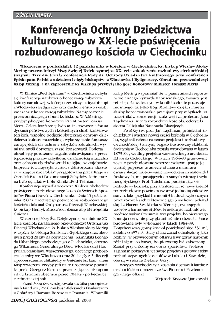 Z ˚YCIA MIASTA Konferencja Ochrony Dziedzictwa Kulturowego w XX-lecie poÊwi´cenia rozbudowanego koÊcio∏a w Ciechocinku Wieczorem w poniedzia∏ek 12 paêdziernika w koÊciele w Ciechocinku, ks. biskup Wies∏aw Alojzy Mering przewodniczy∏ Mszy Âwi´tej Dzi´kczynnej za XX-lecie zakoƒczenia rozbudowy ciechociƒskiej Êwiàtyni. Trzy dni trwa∏a konferencja Rady ds. Ochrony Dziedzictwa Kulturowego przy Konferencji Episkopatu Polski z udzia∏em ksi´˝y biskupów z W∏oc∏awka i Bydgoszczy. Obradom przewodniczy∏ ks.bp Mering, a na zaproszenie ks.biskupa przyby∏ jako goÊç honorowy minister Tomasz Merta. W Klinice „Pod T´˝niami” w Ciechocinku odby∏a si´ konferencja naukowa o konserwacji zabytków kultury narodowej, w której uczestniczyli ksi´˝a biskupi z W∏oc∏awka i Bydgoszczy oraz duchowieƒstwo i osoby zwiàzane z konserwacjà zabytków. Na zaproszenie przewodniczàcego obrad ks.biskupa W.A.Meringa przyby∏ jako goÊç honorowy Pan Minister Tomasz Merta. Celem konferencji by∏o m. in. stworzenie forum dyskusji paƒstwowych i koÊcielnych s∏u˝b konserwatorskich, wspólne podj´cie skutecznej ochrony dziedzictwa kultury materialnej, wykorzystanie funduszy europejskich dla ochrony zabytków sakralnych, wymiana myÊli dotyczàca zasad konserwacji. Podczas obrad by∏y poruszane zagadnienia zwiàzane z przest´pczoÊcià przeciw zabytkom, dzia∏alnoÊcià muzealnà oraz ochrona obiektów sztuki religijnej w krajobrazie. Imprezie towarzyszy∏a wystawa „Historyczne klasztory w krajobrazie Polski” przygotowana przez Krajowy OÊrodek Badaƒ i Dokumentacji Zabytków, którà mo˝na by∏o oglàdaç w holu Kliniki „Pod T´˝niami”. Konferencja wypad∏a w okresie XX-lecia obchodów poÊwi´cenia rozbudowanego koÊcio∏a Âwi´tych Aposto∏ów Piotra i Paw∏a w Ciechocinku. Dnia 15 paêdziernika 1989 r. uroczystego poÊwiecenia rozbudowanego koÊcio∏a dokona∏ Ordynariusz Diecezji W∏oc∏awskiej ks.biskup Henryk Muszyƒski, dzisiaj abp Metropolita Gniezna. Wieczornej Mszy Âw. Dzi´kczynnej za minione XXlecie koÊcio∏a parafialnego przewodniczy∏ Ordynariusz Diecezji W∏oc∏awskiej ks. biskup Wies∏aw Alojzy Mering w asyÊcie ks.biskupa Stanis∏awa G´bickiego oraz obecnych przed 20 laty na poÊwi´ceniu: ks.infu∏ata Leonarda Urbaƒkiego, pochodzàcego z Ciechocinka, obecnego Wikariusza Generalnego Diec. W∏oc∏awskiej i ks. pra∏ata Stanis∏awa Waszczyƒskiego, obecnego proboszcza katedry we W∏oc∏awku oraz 20 ksi´˝y z 3 diecezji z proboszczem archikatedry w Gnieênie ks. kan. Janem Kasprowiczem. Przyby∏ych na t´ uroczystoÊç powita∏ ks.pra∏at Grzegorz Karolak, przekazujàc ks. biskupom i dwu ksi´˝om obecnym przed 20-laty - po beczu∏ce ciechociƒskiej soli. Przed Mszà Êw. wyst´powa∏a dwójka podopiecznych Fundacji „Pro Omnibus” Aleksandra Daukszewicz z Go∏aƒczy i Barbara Borowicz z Poznania. W homilii ZDRÓJ CIECHOCI¡SKI paêdziernik 2009 ks.bp Mering wspomnia∏, ˝e w pami´tnikach reportera wojennego Ryszarda KapuÊciƒskiego, zawarta jest refleksja, ˝e walczàcym w konfliktach nie pozostaje nic innego jak tylko Bóg. Modlitwy dzi´kczynne za s∏u˝by konserwatorskie pracujàce przy zabytkach, za uczestników konferencji naukowej i za profesora Jana Tajchmana, autora rozbudowy koÊcio∏a, odczyta∏a siostra Felicjanka Natanaela B∏a˝ejczyk. Po Mszy Êw. prof. Jan Tajchman, projektant architektury i wn´trza nowej cz´Êci koÊcio∏a w Ciechocinku, wyg∏osi∏ referat na temat projektu i rozbudowy ciechociƒskiej Êwiàtyni, bogato ilustrowany slajdami. Âwiàtynia w Ciechocinku zosta∏a wybudowana w latach 1873-84 , wed∏ug projektu warszawskiego architekta Edwarda Cichockiego. W latach 1964-68 gruntownie zosta∏o przebudowane wn´trze Êwiàtyni, psujàc jej wystrój poprzez: usuniecie o∏tarza z marmuru carraryjskiego, zastosowanie nowoczesnych malowide∏ freskowych, nie pasujàcych do starych witra˝y i stylu neogotyckiego. Prof. Tajchman, podejmujàc si´ rozbudowy koÊcio∏a, przyjà∏ za∏o˝enie, ˝e nowy koÊció∏ po rozbudowie powinien tworzyç jednolità ca∏oÊç ze starym. Jako przyk∏ad harmonii 3 budowli wykonanych przez ró˝nych architektów w ciàgu 3 wieków - pokaza∏ slajd z Placem Âw. Marka w Wenecji, tworzàcych wzorowà harmoni´ stylów. Projektujàc rozbudow´, profesor wykona∏ w sumie trzy projekty, bo pierwszego komisja oceny nie przyj´∏a ani te˝ nie odrzuci∏a. Prace budowlane by∏y wykonane w latach 1984-89. Dotychczasowy górny koÊció∏ powi´kszy∏ si´o 531 m², a dolny o 497 m². Stary o∏tarz zosta∏ odnaleziony jako rozbity i w przywróconym o∏tarzu lewy górny naro˝nik ró˝ni si´ nieco barwà, bo pierwotny by∏ zniszczony. Zosta∏ przywrócony te˝ obraz aposto∏ów. Profesor Tajchman pokazywa∏ te˝ swoje projekty i gotowe efekty rozbudowywanych koÊcio∏ów w Lubsku i Zawadzie, oba sà w rejonie Zielonej Góry. Wszyscy wychodzàcy z koÊcio∏a dostawali kartk´ z ciechociƒskim obrazem ze Êw. Piotrem i Paw∏em z g∏ównego o∏tarza. Wojciech Krzysztof Jankowski 6
