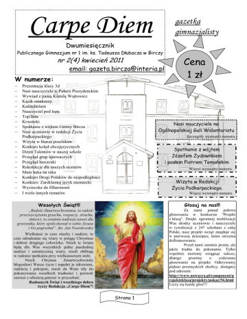 Carpe Diem gazetka gimnazjalisty Dwumiesięcznik Publicznego Gimnazjum nr 1 im. ks. Tadeusza Dłubacza w Birczy nr 2(4) kwiecień 2011 email: [email protected] W numerze: Prezentacja klasy 3d Nasi nauczyciele w Pałacu Prezydenckim Wywiad z panią Kamilą Wojtowicz Kącik smakoszy Kalendarium Nauczyciel pod lupą Top lista Krwotoki Spotkanie z wójtem Gminy Bircza Nasi uczniowie w redakcji Życia Podkarpackiego Wizyta w biurze poselskim Konkurs kolęd obcojęzycznych Dzień Talentów w naszej szkole Przegląd grup śpiewaczych Przegląd harcerski Rekolekcje dla naszych uczniów Mam haka na raka Konkurs Drogi Polaków do niepodległości Konkurs: Zareklamuj język niemiecki Wycieczka do filharmonii I wiele innych tematów. Cena 1 zł Nasi nauczyciele na Ogólnopolskiej Gali Wolontariatu Szczegóły wewnątrz numeru. Spotkanie z wójtem Józefem Żydownkiem i posłem Piotrem Tomańskim Więcej wewnątrz numeru. Wizyta w Redakcji Życia Podkarpackiego. Więcej wewnątrz numeru. Wesołych Świąt!!! Głosuj na nas!!! Za nami ponad połowa głosowania w konkursie "Projekt z klasą". Dzięki ogromnej mobilizacji Was drodzy uczniowie i nauczyciele w rywalizacji z 247 szkołami z całej Polski, nasz projekt wciąż znajduje się w pierwszej dziesiątce, która otrzyma dofinansowanie. Przed nami ostatnia prosta, ale jakże trudna do pokonania. Tylko wspólnie możemy osiągnąć sukces, dlatego prosimy o codzienne glosowanie na projekt: Odkrywamy piękno przemyskich okolicy, dostępny pod adresem: http://www.nowaera.pl/component/p rojektzklasa/projekty/pokaz/54.html Liczy się każdy głos!!! „Radość Zmartwychwstania, to radość przezwyciężenia grzechu, rozpaczy, strachu, śmierci, to ostatnia nadzieja nawet dla grzesznika, który spoliczkował w sobie Jezusa i Go pogrzebał”. (ks. Jan Twardowski) Wielkanoc to czas otuchy i nadziei, to czas odradzania się wiary w potęgę Chrystusa i dobroć drugiego człowieka. Niech te święta będą dla Was wszystkich pełne paschalnej nadziei i autentycznej wiary, niech obfitują w radosne spotkania przy wielkanocnym stole. Niech Chrystus Zmartwychwstały błogosławi Wasze życie i napełni je zdrowiem, radością i pokojem, niech da Wam siły do pokonywania wszelkich trudności i pozwoli zawsze z ufnością patrzeć w przyszłość. Radosnych Świąt i wszelkiego dobra życzy Redakcja „Carpe Diem”! Strona 1 Kalendarium - kwiecień 17 kwietnia - Niedziela Palmowa Ostatnia niedziela przed Wielkanocą, pierwszy dzień Wielkiego Tygodnia - okresu upamiętniającego ukrzyżowanie i śmierć Jezusa Chrystusa. Jest to święto chrześcijańskie, ruchome w 2011 roku wypada 17 kwietnia. Niedziela Palmowa to dzień upamiętniający przybycie Jezusa do Jerozolimy. Jak podają wszyscy czterej Ewangeliści było to przybycie uroczyste i triumfalne. Wjeżdżającego Chrystusa witały tłumy z okrzykiem "Hosanna Synowi Dawida". Pierwszy dzień Wielkiego Tygodnia to z jednej strony dzień radosnych procesji z palmami, które upamiętniają wjazd Jezusa do Jerozolimy, a z drugiej dzień ten rozpoczyna czas żałoby i zadumy nad śmiercią Chrystusa. Liturgia tego dnia jest bardzo bogata. Podczas Mszy św. odczytywany jest fragment Ewangelii opowiadający o ostatnich dniach życia Jezusa Chrystusa. Zazwyczaj przed Eucharystią następuje uroczysta procesja wzorowana na IV wiecznych procesji jerozolimskich. Niedzielny wieczór to już okres zadumy i wyciszenia. O ile zwyczaj procesji palmowych pochodzi z początków IV wieku naszej ery, o tyle święcenie palm to tradycja młodsza. Pierwsze wzmianki wskazują, że pochodzi z XI w. Poświęcone palmy powinny być przechowywane przez prawie cały rok, aż do spalenia w Środę Popielcową. 21-23 kwietnia - Triduum Paschalne Triduum Paschalne - święte trzy dni (łac: triduum) przed Wielkanocą, na które składają się Wielki Czwartek, Wielki Piątek i Wielka Sobota. Triduum rozpoczyna się w Wielki Czwartek wieczorną Mszą Wieczerzy Pańskiej, a kończy się w wielkanocne południe nieszporami. Wielki Czwartek to dzień upamiętniający Ostatnią Wieczerzę, podczas której Jezus zapowiedział swoją rychłą śmierć oraz ustanowił sakrament Eucharystii i kapłaństwa. W ten dzień odbywają się Msze: poranna - Krzyżma Świętego odprawiana w katedrze i wieczorna Msza Wieczerzy Pańskiej. Wielki Piątek to dzień, żałoby i skupienia, upamiętniający śmierć Jezusa na krzyżu. W ten dzień nie sprawuje się Najświętszej Eucharystii, a wiernych obowiązuje post ścisły. Wielka Sobota jest dniem żałoby i adoracji Najświętszego Sakramentu. W ten dzień święci się pokarmy na wielkanocny stół. 24 kwietnia – Wielkanoc Wielkanoc (Pascha) - to najważniejsze święto chrześcijańskie upamiętniające śmierć i zmartwychwstanie Jezusa Chrystusa. Obchodzone jest w pierwszą niedzielę po pierwszej wiosennej pełni. Rano w Wielką Niedzielę kapłan, po odmówieniu modlitwy przy Grobie Pańskim, oznajmia radosną nowinę zmartwychwstania, po czym rozpoczyna się procesja z Najświętszym Sakramentem i figurą Chrystusa Zmartwychwstałego. Po trzykrotnym obejściu kościoła i odśpiewaniu hymnu "Ciebie Boże wysławiamy", udzielane jest błogosławieństwo Najświętszym Sakramentem i rozpoczyna się uroczysta i radosna Msza Święta. Na początku Eucharystii rozlega się radosne Alleluja (Chwalcie Pana). Szaty Liturgiczne w okresie Wielkanocnym są koloru białego, złotego lub srebrnego. Po uroczystej Mszy wierni udają się do swoich domów, gdzie wspólnie z rodziną spożywają śniadanie wielkanocne, które składa się z produktów poświęconych dzień wcześniej w kościele. Koszyk ze święconką powinien zawierać: jajka (pisanki, kraszanki) symbol życia i odrodzenia, baranek (cukrowy, z masła bądź z ciasta) - Symbol Jezusa Chrystusa, chleb - także symbolizuje Ciało Chrystusa, jest oznaką dostatku, chrzan - wraz z masłem jest symbolem goryczy i słodyczy po śmierci i zmartwychw