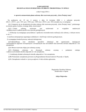 ZARZĄDZENIE REGIONALNEGO DYREKTORA OCHRONY ŚRODOWISKA W OPOLU z dnia 9 maja 2016 r. w sprawie ustanowienia planu ochrony dla rezerwatu przyrody „Góra Świętej Anny” Na podstawie art. 19 ust. 6 ustawy z dnia 16 kwietnia 2004 r. o ochronie (Dz.U. z 2015 r., poz. 1651, poz. 1936 i poz. 1045 oraz z 2016 r. poz. 422) zarządza się, co następuje: przyrody § 1. Ustanawia się na dwadzieścia lat plan ochrony dla rezerwatu przyrody „Góra Świętej Anny”, położonego na terenie gminy Leśnica, zwanego dalej „rezerwatem". § 2. 1. Celem ochrony rezerwatu jest zachowanie i dydaktycznych rzadkich profili oraz zjawisk geologicznych. ze względów naukowych 2. Wskazuje się następujące przyrodnicze i społeczne uwarunkowania realizacji celu ochrony, o którym mowa w ust. 1.: 1) nasilona antropopresja zagrażająca unikalnym w skali kraju walorom geologicznym, 2) wymagające kontroli procesy sukcesji ekologicznej. § 3. Identyfikację oraz określenie sposobów eliminacji lub ograniczania istniejących i potencjalnych zagrożeń wewnętrznych i zewnętrznych oraz ich skutków dla rezerwatu zawiera załącznik nr 1 do zarządzenia. § 4. Obszar rezerwatu objęty jest ochroną czynną. § 5. 1. Działania ochronne na obszarach ochrony i zakresu tych działań określa załącznik nr 2 do zarządzenia. czynnej, z podaniem rodzaju 2. Lokalizację działań ochronnych określa załącznik nr 3 do zarządzenia. § 10. Wykonanie zarządzenia powierza się Regionalnemu Konserwatorowi Przyrody w Opolu. § 11. Zarządzenie wchodzi w życie po upływie 14 dni od dnia ogłoszenia. Regionalny Dyrektor Ochrony Środowiska w Opolu Alicja Majewska Id: 9D247DF6-0A80-4EAF-B268-ECA5A2D1B963. Podpisany Strona 1 Załącznik nr 1 do zarządzenia Regionalnego Dyrektora Ochrony Środowiska w Opolu z dnia 9 maja 2016 r. Identyfikacja oraz określenie sposobów eliminacji lub ograniczania i potencjalnych zagrożeń wewnętrznych i zewnętrznych oraz ich skutków Lp. istniejących Sposób eliminacji lub ograniczenia zagrożenia oraz jego skutków Zagrożenia istniejące wewnętrzne 1. Przeciwdziałanie zarastaniu, zacienianiu oraz degradacji profili geologicznych i wychodni skalnych Sukcesja drzew i krzewów istniejące zewnętrzne 2. Niekontrolowana antropopresja Ukierunkowanie ruchu turystycznego potencjalne zewnętrzne 3. Ekspansja inwazyjnych gatunków obcych Id: 9D247DF6-0A80-4EAF-B268-ECA5A2D1B963. Podpisany Ograniczenie, w razie potrzeb, ekspansji gatunków inwazyjnych Strona 1 Załącznik nr 2 do zarządzenia Regionalnego Dyrektora Ochrony Środowiska w Opolu z dnia 9 maja 2016 r. Określenie działań ochronnych na obszarze ochrony czynnej z podaniem rodzaju i zakresu tych działań Lp. Rodzaj działań ochronnych Zakres działań ochronnych 1. Zabezpieczanie cennych profili i odsłonięć geologicznych W miarę potrzeby usuwanie, w terminie od października do lutego, drzew i krzewów z całej powierzchni odsłonięć oraz ich bezpośredniego sąsiedztwa, z usunięciem pozyskanej biomasy poza granice rezerwatu. 2. Ukierunkowanie ruchu turystycznego Zaprojektowanie przebiegu ścieżki dydaktycznej wraz z niezbędną infrastrukturą edukacyjno-turystyczną. 3. Monitorowanie ekspansji gatunków inwazyjnych Obserwacja terenu rezerwatu pod kątem występowania gatunków inwazyjnych, ze szczególnym uwzględnieniem rdestowca Reynourtia sp.; w razie potrzeby zwalczanie tych gatunków metodami mechanicznymi z wywiezieniem pozyskanej biomasy poza teren rezerwatu; dopuszcza się zastosowanie środków chemicznych. Id: 9D247DF6-0A80-4EAF-B268-ECA5A2D1B963. Podpisany Strona 1 Id: 9D247DF6-0A80-4EAF-B268-ECA5A2D1B963. Podpisany Strona 1