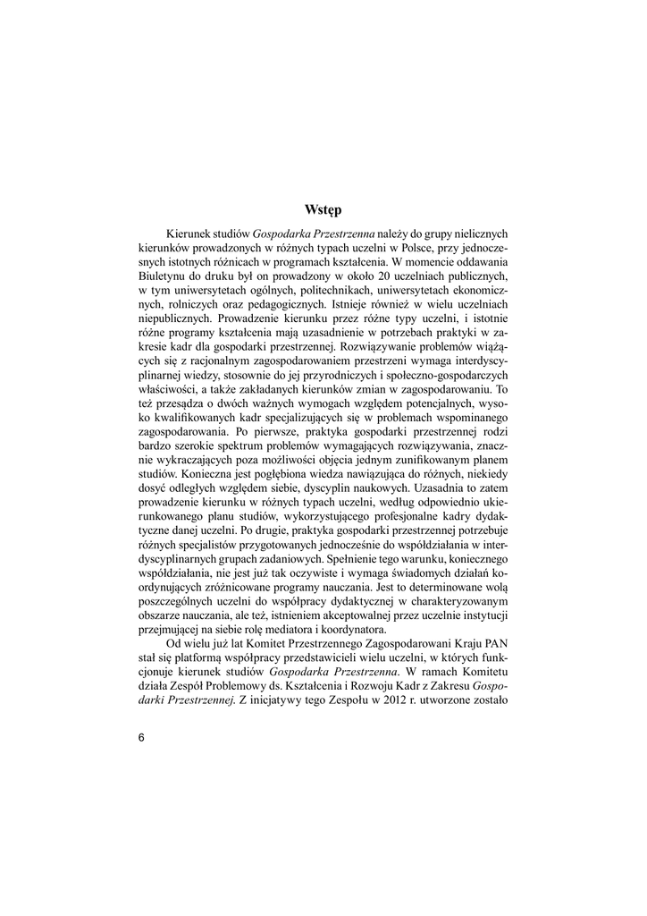 Wstęp Kierunek studiów Gospodarka Przestrzenna należy do grupy nielicznych kierunków prowadzonych w różnych typach uczelni w Polsce, przy jednoczesnych istotnych różnicach w programach kształcenia. W momencie oddawania Biuletynu do druku był on prowadzony w około 20 uczelniach publicznych, w tym uniwersytetach ogólnych, politechnikach, uniwersytetach ekonomicznych, rolniczych oraz pedagogicznych. Istnieje również w wielu uczelniach niepublicznych. Prowadzenie kierunku przez różne typy uczelni, i istotnie różne programy kształcenia mają uzasadnienie w potrzebach praktyki w zakresie kadr dla gospodarki przestrzennej. Rozwiązywanie problemów wiążących się z racjonalnym zagospodarowaniem przestrzeni wymaga interdyscyplinarnej wiedzy, stosownie do jej przyrodniczych i społeczno-gospodarczych właściwości, a także zakładanych kierunków zmian w zagospodarowaniu. To też przesądza o dwóch ważnych wymogach względem potencjalnych, wysoko kwalifikowanych kadr specjalizujących się w problemach wspominanego zagospodarowania. Po pierwsze, praktyka gospodarki przestrzennej rodzi bardzo szerokie spektrum problemów wymagających rozwiązywania, znacznie wykraczających poza możliwości objęcia jednym zunifikowanym planem studiów. Konieczna jest pogłębiona wiedza nawiązująca do różnych, niekiedy dosyć odległych względem siebie, dyscyplin naukowych. Uzasadnia to zatem prowadzenie kierunku w różnych typach uczelni, według odpowiednio ukierunkowanego planu studiów, wykorzystującego profesjonalne kadry dydaktyczne danej uczelni. Po drugie, praktyka gospodarki przestrzennej potrzebuje różnych specjalistów przygotowanych jednocześnie do współdziałania w interdyscyplinarnych grupach zadaniowych. Spełnienie tego warunku, koniecznego współdziałania, nie jest już tak oczywiste i wymaga świadomych działań koordynujących zróżnicowane programy nauczania. Jest to determinowane wolą poszczególnych uczelni do współpracy dydaktycznej w charakteryzowanym obszarze nauczania, ale też, istnieniem akceptowalnej przez uczelnie instytucji przejmującej na siebie rolę mediatora i koordynatora. Od wielu już lat Komitet Przestrzennego Zagospodarowani Kraju PAN stał się platformą współpracy przedstawicieli wielu uczelni, w których funkcjonuje kierunek studiów Gospodarka Przestrzenna. W ramach Komitetu działa Zespół Problemowy ds. Kształcenia i Rozwoju Kadr z Zakresu Gospodarki Przestrzennej. Z inicjatywy tego Zespołu w 2012 r. utworzone zostało 6 porozumienie podpisane przez rektorów 18 uczelni publicznych pod nazwą Unii Uczelni na Recz Rozwoju Kierunku Studiów Gospodarka Przestrzenna. Powstanie Unii zbiegło się z wytężonymi pracami polskich uczelni związanymi z wdrażaniem nowego modelu procesu dydaktycznego, wynikającego z ministerialnych ustaleń zawartych w Krajowych Ramach Kwalifikacji. Pojawiła się zatem dobra okazja do wypracowania, w gronie przedstawicieli różnych uczelni, wspólnych wytycznych dla zróżnicowanych, z konieczności, programów kształcenia na omawianym kierunku studiów. Unia postawiła sobie wiele ważnych celów do realizacji. Kluczowym z nich, w dłuższej perspektywie, jest integrowanie środowiska naukowo-dydaktycznego oraz zawodowego wokół żywotnych spraw rozwoju wysoko kwalifikowanych kadr dla gospodarki przestrzennej. W wymiarze natomiast bieżącym, niezwykle ważnym zadaniem jest wypracowanie spójnego systemu efektów kształcenia dla kierunku Gospodarka Przestrzenna; efektów różniących się między poszczególnymi uczelniami specjalistycznym ukierunkowaniem, stosownie do dominującego profilu naukowego danej uczelni, ale wzajemnie komplementarnych. Tak pomyślany system kształcenia, w tym komplementarność jego efektów, ma zabezpieczać nie tylko interdyscyplinarne potrzeby praktyki gospodarki przestrzennej, ale również przygotowywanie absolwentów zdolnych do współpracy w interdyscyplinarnych zespołach. Wiele uzgodnień w tej kwestii zostało już poczynionych i wdrożonych do programów nauczania poszczególnych uczelni. Szerszy opis przesłanek powstania Unii, jej skład oraz stawiane przez nią cele ujmuje opracowanie zamieszczone w końcowej części prezentowanego Biuletynu. Przedstawiany zbiór opracowań jest efektem kolejnej konferencji dydaktycznej poświęconej Gospodarce Przestrzennej1. Konferencja ta, pod ogólnym tytułem Gospodarka przestrzenna, doświadczenia i wyzwania procesu kształcenia, zorganizowana została przez Uniwersytet im. Adama Mickiewicza w Poznaniu i odbyła się 17-18 marca 2013 r. W szerszym ujęciu współorganizatorami Konferencji była Unia Uczelni na Recz Rozwoju Kierunku Studiów Gospodarka Przestrzenna oraz Komitet Przestrzennego Zagospodarowania Kraju PAN. 1 Dwie wcześniejsze konferencje miały miejsce: a) w Krakowie, we wrześniu 2005 r. (patrz Biuletyn KPZK PAN, z. 224, pt. Teoria i praktyka w zakresie kadr dla gospodarki przestrzennej), b) w Dębe, w marcu 2010 r. (patrz Biuletyn KPZK PAN, z. 244, pt. Poprawa jakości i efektywności planowania i zarządzania rozwojem w administracji publicznej. (Wyzwania wobec kształcenia na kierunku Gospodarka Przestrzenna). 7 Głównym celem konferencji była prezentacja doświadczeń związanych z przygotowywanymi nowymi programami kształcenia dla kierunku Gospodarka Przestrzenna w uczelniach wchodzących w skład przedstawianej wyżej Unii Uczelni, zgodnych z wymogami Krajowych Ram Kwalifikacji oraz wypracowanie obszarów współpracy dydaktycznej między jednostkami prowadzącymi ten kierunek studiów. Konferencja stała się okazją do przedstawienia przez przedstawicieli różnych typów uczelni doświadczeń związanych z realizacją kierunku kształcenia Gospodarka Przestrzenna. Prezentacja doświadczeń w tym zakresie, w wystąpieniach referatowych, a także w dyskusji, ujawniła m.in. obszary przyszłej współpracy, a zwłaszcza obszary synergicznej kooperacji skutkującej podniesieni