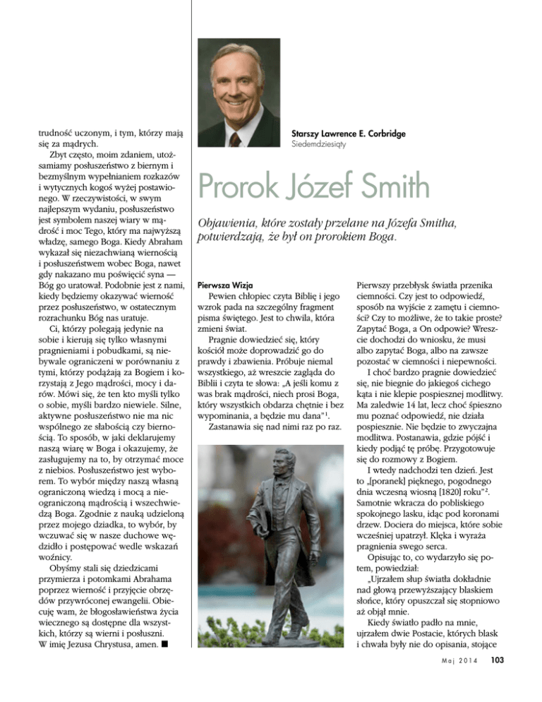 trudność uczonym, i tym, którzy mają się za mądrych. Zbyt często, moim zdaniem, utożsamiamy posłuszeństwo z biernym i bezmyślnym wypełnianiem rozkazów i wytycznych kogoś wyżej postawionego. W rzeczywistości, w swym najlepszym wydaniu, posłuszeństwo jest symbolem naszej wiary w mądrość i moc Tego, który ma najwyższą władzę, samego Boga. Kiedy Abraham wykazał się niezachwianą wiernością i posłuszeństwem wobec Boga, nawet gdy nakazano mu poświęcić syna — Bóg go uratował. Podobnie jest z nami, kiedy będziemy okazywać wierność przez posłuszeństwo, w ostatecznym rozrachunku Bóg nas uratuje. Ci, którzy polegają jedynie na sobie i kierują się tylko własnymi pragnieniami i pobudkami, są niebywale ograniczeni w porównaniu z tymi, którzy podążają za Bogiem i korzystają z Jego mądrości, mocy i darów. Mówi się, że ten kto myśli tylko o sobie, myśli bardzo niewiele. Silne, aktywne posłuszeństwo nie ma nic wspólnego ze słabością czy biernością. To sposób, w jaki deklarujemy naszą wiarę w Boga i okazujemy, że zasługujemy na to, by otrzymać moce z niebios. Posłuszeństwo jest wyborem. To wybór między naszą własną ograniczoną wiedzą i mocą a nieograniczoną mądrością i wszechwiedzą Boga. Zgodnie z nauką udzieloną przez mojego dziadka, to wybór, by wczuwać się w nasze duchowe wędzidło i postępować wedle wskazań woźnicy. Obyśmy stali się dziedzicami przymierza i potomkami Abrahama poprzez wierność i przyjęcie obrzędów przywróconej ewangelii. Obiecuję wam, że błogosławieństwa życia wiecznego są dostępne dla wszystkich, którzy są wierni i posłuszni. W imię Jezusa Chrystusa, amen. ◼ Starszy Lawrence E. Corbridge Siedemdziesiąty Prorok Józef Smith Objawienia, które zostały przelane na Józefa Smitha, potwierdzają, że był on prorokiem Boga. Pierwsza Wizja Pewien chłopiec czyta Biblię i jego wzrok pada na szczególny fragment pisma świętego. Jest to chwila, która zmieni świat. Pragnie dowiedzieć się, który kościół może doprowadzić go do prawdy i zbawienia. Próbuje niemal wszystkiego, aż wreszcie zagląda do Biblii i czyta te słowa: „A jeśli komu z was brak mądrości, niech prosi Boga, który wszystkich obdarza chętnie i bez wypominania, a będzie mu dana” 1. Zastanawia się nad nimi raz po raz. Pierwszy przebłysk światła przenika ciemności. Czy jest to odpowiedź, sposób na wyjście z zamętu i ciemności? Czy to możliwe, że to takie proste? Zapytać Boga, a On odpowie? Wreszcie dochodzi do wniosku, że musi albo zapytać Boga, albo na zawsze pozostać w ciemności i niepewności. I choć bardzo pragnie dowiedzieć się, nie biegnie do jakiegoś cichego kąta i nie klepie pospiesznej modlitwy. Ma zaledwie 14 lat, lecz choć śpieszno mu poznać odpowiedź, nie działa pospiesznie. Nie będzie to zwyczajna modlitwa. Postanawia, gdzie pójść i kiedy podjąć tę próbę. Przygotowuje się do rozmowy z Bogiem. I wtedy nadchodzi ten dzień. Jest to „[poranek] pięknego, pogodnego dnia wczesną wiosną [1820] roku” 2. Samotnie wkracza do pobliskiego spokojnego lasku, idąc pod koronami drzew. Dociera do miejsca, które sobie wcześniej upatrzył. Klęka i wyraża pragnienia swego serca. Opisując to, co wydarzyło się potem, powiedział: „Ujrzałem słup światła dokładnie nad głową przewyższający blaskiem słońce, który opuszczał się stopniowo aż objął mnie. Kiedy światło padło na mnie, ujrzałem dwie Postacie, których blask i chwała były nie do opisania, stojące Maj 2014 103 nade mną w powietrzu. Jedna z nich przemówiła do mnie nazywając mnie po imieniu i rzekła wskazując na drugą postać: [ Józefie,] Oto Mój Umiłowany Syn. Słuchaj Go! ” 3. Zaledwie 24 lata później Józef Smith i jego brat, Hyrum, zginą z powodu tego, co się tu rozpoczęło. Sprzeciw Józef powiedział, że kiedy miał 17 lat, anioł powiedział mu, że jego „imię […] pozostanie na dobre i złe u wszystkich narodów […] i języków” 4. To niezwykłe proroctwo wypełnia się i dzisiaj, ponieważ Kościół Jezusa Chrystusa Świętych w Dniach Ostatnich rozprzestrzenia się po świecie. Sprzeciw, krytyka i antagonizm są towarzyszami prawdy. Kiedykolwiek objawiana jest prawda dotycząca celu i przeznaczenia człowieka, zawsze pojawia się siła sprzeciwiająca się jej. Począwszy od Adama i Ewy w Ogrodzie Eden poprzez posługę Chrystusa i po dzisiejsze czasy, zawsze pojawiały się i będą się pojawiać działania zmierzające do oszukiwania na temat planu 104 Liahona życia, niweczenia i udaremniania go oraz sprzeciwiania się mu. Należy się spodziewać największego tumanu kurzu ponad brudem, którym obrzucany jest Ten, któremu się sprzeciwiano, którego wypróbowywano i odrzucono, bito, porzucono i ukrzyżowano, Ten, który zstąpił poniżej wszystkiego — i tam właśnie znajdziecie prawdę, Syna Bożego, Zbawiciela całej ludzkości. Dlaczego nie zostawili Go w spokoju? Dlaczego? Ponieważ jest On prawdą, a prawda zawsze napotyka sprzeciw. A teraz spójrzcie na tego, który sprowadził jeszcze jedno świadectwo o Jezusie Chrystusie i jeszcze jedno pismo święte; spójrzcie na tego, który był narzędziem, dzięki któremu pełnia ewangelii i Kościół Jezusa Chrystusa zostały przywrócone na ziemię — spójrzcie i zobaczycie, jak jest obrzucany błotem. Dlaczego nie zostawią go w spokoju? Dlaczego? Ponieważ nauczał on prawdy, a prawda zawsze napotyka sprzeciw. Potop objawienia Objawienia, które zostały przelane na Józefa Smitha, potwierdzają, że był on prorokiem Boga. Przyjrzyjmy się kilku objawionym za jego pośrednictwem pewnym aspektom światła i prawdy, które wyraźnie jaśnieją na tle powszechnych przekonań jego i naszych czasów. • Bóg jest osobową, wyniesioną Istotą, Wiecznym Ojcem. On jest naszym Ojcem. • Bóg Ojciec, Jezus Chrystus i Duch Święty to trzy odrębne Osoby 5. • Jeste