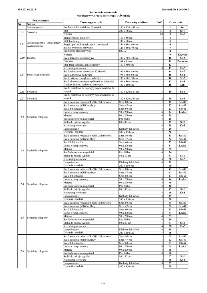 Załącznik Nr 8 do SIWZ IPS.272.02.2015 Zestawienie zamówienia Młodzieżowy Ośrodek Socjoterapii w Żychlinie Nr 1.1 2.11 Pomieszczenie Nazwa Szatnia (parter) Stołówka Aneks kuchenno – gospodarczy wychowanków 2.10 Izolatka 2.17 Pokój wychowawców 2.15 Świetlica 2.27 Świetlica 2.2 2.3 2.4 2.5 2.6 Sypialnia chłopców Sypialnia chłopców Sypialnia chłopców Sypialnia chłopców Sypialnia chłopców Nazwa wyposażenia Szafka szkolna metalowa (8 skrytek) Stół Krzesło Stolik roboczy metalowy Stół kuchenny Regał z pólkami zamykanymi i otwartymi Szafka kuchenna zamykana Szafka pod zlewozmywak Kozetka Szafa lekarsko-laboratoryjna Parawan Stół długi składany konferencyjny Krzesła tapicerowane Szafa schowkowa drewniana 12 skrytek Szafa odzieżowa podwójna Szafa aktowa zamykana podwójna Szafa aktowa zamykana z półkami na dzienniki Gablota inform. korkowa, zamykana Szafki metalowe na depozyty wychowanków 12 skrytek Szafki metalowe na depozyty wychowanków 12 skrytek Szafa sosnowa wieszak/4 półki 2 drzwiowa Szafa sosnowa /półki/szuflady Szafa biblioteczka Łóżka z ramą sosnową Materac Szuflada sosnowa na pościel Stolik do pokoju sypialni Krzesła tapicerowane Lampki nocne Dywanik -chodnik Szafa sosnowa wieszak/4 półki 2 drzwiowa Szafa sosnowa /półki/szuflady Szafa biblioteczka Łóżka z ramą sosnową Materac Szuflada sosnowa na pościel Stolik do pokoju sypialni Krzesła tapicerowane Lampki nocne Dywanik -chodnik Szafa sosnowa wieszak/4 półki 2 drzwiowa Szafa sosnowa /półki/szuflady Szafa biblioteczka Łóżka z ramą sosnową Materac Szuflada sosnowa na pościel Stolik do pokoju sypialni Krzesła tapicerowane Lampki nocne Dywanik -chodnik Szafa sosnowa wieszak/4 półki 2 drzwiowa Szafa sosnowa /półki/szuflady Szafa biblioteczka Łóżka z ramą sosnową Materac Szuflada sosnowa na pościel Stolik do pokoju sypialni Krzesła tapicerowane Lampki nocne Dywanik -chodnik Szafa sosnowa wieszak/4 półki 2 drzwiowa Szafa sosnowa /półki/szuflady Szafa biblioteczka Łóżka z ramą sosnową Materac Szuflada sosnowa na pościel Stolik do pokoju sypialni Krzesła tapicerowane Lampki nocne Dywanik -chodnik 1z4 Parametry użytkowe 180 x 120 x 49 cm 200 x 80 cm Ilość Oznaczenie 196 x 80 x 49 cm 196 x 80 x 50 cm 196 x 80 x 50 cm 196 x 80 x 50 cm 120 x 100 cm 2 15 60 1 1 1 1 1 1 1 1 1 8 1 1 1 1 1 1 2 3 4 5 6 7 8 9 10 11 12 13 14 15 16 17 18 180 x 120 x 49 cm 3 19 Sz-8 180 x 120 x 49 cm Szer. 80 cm Szer. 47 cm Szer. 60 cm 90 x 200 cm 90 x 200 cm Pod łóżko 80 x 80 cm 2 1 1 1 4 4 4 1 4 4 1 1 1 1 4 4 4 1 4 4 1 1 1 1 4 4 4 1 4 4 1 1 1 1 4 4 4 1 4 4 1 1 1 1 4 4 4 1 4 4 1 20 21 22 23 24 25 26 27 28 29 30 31 32 33 34 35 36 37 38 39 40 41 42 43 44 45 46 47 48 49 50 51 52 53 54 55 56 57 58 59 60 61 62 63 64 65 66 67 68 69 70 Sz-8 Szs-80 Szs-47 Bib-60 Lozko 180 x 80 cm 180 x 80 cm 196 x 80 x 40 cm 124 x 80 x 40 cm 80 cm 180 x 80 x 40 cm 164 x 95 cm 180 x 800 cm Kinkiety lub żabki 200 x 150 cm Szer. 80 cm Szer. 47 cm Szer. 60 cm 90 x 200 cm 90 x 200 cm Pod łóżko 80 x 80 cm Kinkiety lub żabki 200 x 150 cm Szer. 80 cm Szer. 47 cm Szer. 60 cm 90 x 200 cm 90 x 200 cm Pod łóżko 80 x 80 cm Kinkiety lub żabki 200 x 150 cm Szer. 80 cm Szer. 47 cm Szer. 60 cm 90 x 200 cm 90 x 200 cm Pod łóżko 80 x 80 cm Kinkiety lub żabki 200 x 150 cm Szer. 80 cm Szer. 47 cm Szer. 60 cm 90 x 200 cm 90 x 200 cm Pod łóżko 80 x 80 cm Kinkiety lub żabki 200 x 150 cm Ssz St-1 Kr-6 Kozetka Sz-9 Parawan Kr-5 Sz-7 Sz-2 Sz-2 Sz-5 Gabl St-2 Kr-5 Szs-80 Szs-47 Bib-60 Lozko St-2 Kr-5 Szs-80 Szs-47 Bib-60 Lozko St-2 Kr-5 Szs-80 Szs-47 Bib-60 Lozko St-2 Kr-5 Szs-80 Szs-47 Bib-60 Lozko St-2 Kr-5 Załącznik Nr 8 do SIWZ IPS.272.02.2015 Zestawienie zamówienia Młodzieżowy Ośrodek Socjoterapii w Żychlinie 2.7 2.8 2.9 Sypialnia chłopców Sypialnia chłopców Sypialnia chłopców 2.18 Sypialnia dziewcząt 2.19 Sypialnia dziewcząt 2.20 Sypialnia dziewcząt 2.21 Sypialnia dziewcząt Szafa sosnowa wieszak/4 półki 2 drzwiowa Szafa sosnowa /półki/szuflady Szafa biblioteczka Łóżka z ramą sosnową Materac Szuflada sosnowa na pościel Stolik do pokoju sypialni Krzesła tapicerowane Lampki nocne Dywanik -chodnik Szafa sosnowa wieszak/4 półki 2 drzwiowa Szafa sosnowa /półki/szuflady Szafa biblioteczka Łóżko z ramą sosnową piętrowe Łóżko z ramą sosnową Materac Szuflada sosnowa na pościel Stolik do pokoju sypialni Krzesła tapicerowane Lampki nocne Dywanik -chodnik Szafa sosnowa wieszak/4 półki 2 drzwiowa Szafa sosnowa /półki/szuflady Szafa biblioteczka Łóżko z ramą sosnową piętrowe Łóżko z ramą sosnową Materac Szuflada sosnowa na pościel Stolik do pokoju sypialni Krzesła tapicerowane Lampki nocne Dywanik -chodnik Szafa sosnowa wieszak/4 półki 2 drzwiowa Szafa sosnowa /półki/szuflady Szafa biblioteczka Łóżko z ramą sosnową piętrowe Łóżko z ramą sosnową Materac Szuflada sosnowa na pościel Stolik do pokoju sypialni Krzesła tapicerowane Lampki nocne Dywanik -chodnik Szafa sosnowa wieszak/4 półki 2 drzwiowa Szafa sosnowa /półki/szuflady Szafa biblioteczka Łóżko z ramą sosnową piętrowe Łóżko z ramą sosnową Materac Szuflada sosnowa na pościel Stolik do pokoju sypialni Krzesła tapicerowane Lampki nocne Dywanik -chodnik Szafa sosnowa wieszak/4 półki 2 drzwiowa Szafa sosnowa /półki/szuflady Szafa biblioteczka Łóżka z ramą sosnową Materac Szuflada sosnowa na pościel Stolik do pokoju sypialni Krzesła tapicerowane Lampki nocne Dywanik -chodnik Szafa sosnowa wieszak/4 półki 2 drzwiowa Szafa sosnowa /półki/szuflady Szafa biblioteczka Łóżka z ramą sosnową Materac Szuflada sosnowa na pościel Stolik do pokoju sypialni Krzesła tapicerowane Lampki nocne Dywanik -chodnik 2z4 Szer. 80 cm Szer. 47 cm Szer. 60 cm 90 x 200 cm 90 x 200 cm Pod łóżko 80 x 80 cm Kinkiety lub żabki 200 x 150 cm Szer. 80 cm Szer. 47 cm Szer. 60 cm 90 x 200 cm 90 x 200 cm 90 x 200 cm Pod łóżko 80 x 80 cm Kinkiety lub żabki 200 x 150 cm Szer. 80 