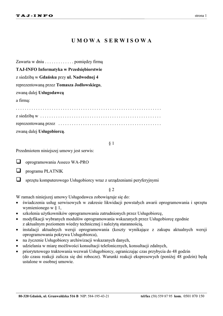 strona 1 TAJ-INFO UMOWA SERWISOWA Zawarta w dniu . . . . . . . . . . . . . pomiędzy firmą TAJ-INFO Informatyka w Przedsiębiorstwie z siedzibą w Gdańsku przy ul. Nadwodnej 4 reprezentowaną przez Tomasza Jodłowskiego, zwaną dalej Usługodawcą a firmą: ................................................................. z siedzibą w . . . . . . . . . . . . . . . . . . . . . . . . . . . . . . . . . . . . . . . . . . . . . . . . . . . . . . reprezentowaną przez . . . . . . . . . . . . . . . . . . . . . . . . . . . . . . . . . . . . . . . . . . . . . . zwaną dalej Usługobiorcą. §1 Przedmiotem niniejszej umowy jest serwis: oprogramowania Asseco WA-PRO programu PŁATNIK sprzętu komputerowego Usługobiorcy wraz z urządzeniami peryferyjnymi §2 W ramach niniejszej umowy Usługodawca zobowiązuje się do: • świadczenia usług serwisowych w zakresie likwidacji powstałych awarii oprogramowania i sprzętu wymienionego w § 1, • szkolenia użytkowników oprogramowania zatrudnionych przez Usługobiorcę, • modyfikacji wybranych modułów oprogramowania wskazanych przez Usługobiorcę zgodnie z aktualnym poziomem wiedzy technicznej i należytą starannością, • instalacji aktualnych wersji oprogramowania (koszty wynikające z zakupu aktualnych wersji oprogramowania pokrywa Usługobiorca), • na życzenie Usługobiorcy archiwizacji wskazanych danych, • udzielania w miarę możliwości konsultacji telefonicznych, konsultacji zdalnych, • priorytetowego traktowania wezwań Usługobiorcy, ograniczając czas przybycia do 48 godzin (do czasu reakcji zalicza się dni robocze). Warunki reakcji ekspresowych (poniżej 48 godzin) będą ustalone w osobnej umowie. 80-320 Gdańsk, ul. Grunwaldzka 516 B NIP: 584-195-43-21 tel/fax (58) 559 87 95 kom. 0501 070 150 strona 2 TAJ-INFO §3 Usługobiorca zobowiązuję się do: • Do zachowania tajemnicy handlowej, • Niezmieniania konfiguracji komputerów i sieci komputerowej bez wcześniejszej konsultacji z Usługodawcą. §4 Za czynności wymienione w § 2 strony ustalają miesięczną opłatę w wybranej przez Usługobiorcę wysokości: 3 godziny serwisu miesięcznie – 390 zł netto. Godziny do wykorzystania w bieżącym miesiącu. 36 godzin serwisu rocznie – 4680 zł netto. Godziny do wykorzystania przez rok od daty podpisania umowy. 5 godzin serwisu miesięcznie – 625 zł netto. Godziny niewykorzystane przechodzą na następny miesiąc – po wykorzystaniu godzin podstawowych z aktualnego miesiąca. 60 godzin serwisu rocznie – 7500 zł netto. Godziny do wykorzystania przez rok od daty podpisania umowy. 10 godzin serwisu miesięcznie – 1200 zł netto. Godziny niewykorzystane przechodzą na dwa następne miesiące – po wykorzystaniu godzin podstawowych z aktualnego miesiąca. 120 godzin serwisu rocznie – 14400 zł netto. Godziny do wykorzystania przez rok od daty podpisania umowy. 15 godzin serwisu miesięcznie – 1650 zł netto. Godziny niewykorzystane przechodzą na trzy następne miesiące – po wykorzystaniu godzin podstawowych z aktualnego miesiąca. 180 godzin serwisu rocznie – 19800 zł netto. Godziny możliwe do wykorzystania przez rok od daty podpisania umowy. §5 Opłata ryczałtowa wynikająca z § 4 (poprzedzona fakturą) płatna będzie przelewem na konto Usługodawcy w ciągu 7 dni od daty otrzymania faktury. §6 Usługobiorca wyznacza …………………………………………….. jako osoby upoważnione do wzywania Usługodawcy na wizyty serwisowe. §7 Usługodawca nie ponosi odpowiedzialności za niezawinioną przez niego utratę danych Usługobiorcy (np. uszkodzenie dysku twardego lub innych nośników). Usługodawca nie ponosi odpowiedzialności za legalność oprogramowania będącego w posiadaniu Usługobiorcy. §8 Wszelkie interwencje poza ustalonym w niniejszej umowie limitem płatne będą dodatkowo. Cena godzinowa serwisu ustalana będzie według aktualnego cennika Usługodawcy. §9 Umowa zostaje zawarta na czas nieokreślony i może być wypowiedziana przez każdą ze stron w terminie trzech miesięcy ze skutkiem na koniec miesiąca kalendarzowego. 80-320 Gdańsk, ul. Grunwaldzka 516 B NIP: 584-195-43-21 tel/fax (58) 559 87 95 kom. 0501 070 150 strona 3 TAJ-INFO § 10 Wszelkie zmiany niniejszej umowy dokonywane będą w formie pisemnego aneksu. § 11 W sprawach nie uregulowanych niniejszą umową mają zastosowanie przepisy Kodeksu Cywilnego. Spory wynikające z niniejszej umowy będą rozpatrywane przez właściwy sąd w Gdańsku. § 12 Umowa została sporządzona w dwóch jednobrzmiących egzemplarzach po jednym dla każdej ze stron. Usługodawca 80-320 Gdańsk, ul. Grunwaldzka 516 B NIP: 584-195-43-21 Usługobiorca tel/fax (58) 559 87 95 kom. 0501 070 150