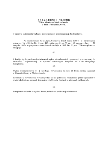 Z A R Z A D E N I E NR 58 /2016 Wójta żminy w Mędrzechowie z dnia 17 sierpnia 2016 r. w sprawie ogłoszenia wykazu nieruchomości przeznaczonej do dzier awy. Na podstawie art. 30 ust.2 pkt.3 ustawy z dnia 8 marca 1990 r. o samorządzie gminnym ( j.t. z 2016 r. Dz. U. poz. 446 z późn. zm. ) i art. 35 ust. 1 i 2 ustawy z dnia 21 sierpnia 1997 r. o gospodarce nieruchomościami (j.t. z 2015 Dz. U. poz.1774) zarządzam co następuje : §1 1. Podaje się do publicznej wiadomości wykaz nieruchomości gruntowej przeznaczonej do dzierżawy, wymienionej w wykazie stanowiącym Załącznik Nr 1 do niniejszego Zarządzenia. §2 Wykaz o którym mowa w § 1 podlega wywieszeniu na okres 21 dni na tablicy ogłoszeń w Urzędzie Gminy w Mędrzechowie . Informację o wywieszeniu wykazu podaje się do publicznej wiadomości przez ogłoszenie w prasie lokalnej , na stronach internetowych Urzędu Gminy i w miejscach publicznych. §3 Zarządzenie wchodzi w życie z dniem podania do publicznej wiadomości. Załącznik Nr 1do Zarządzenia Nr 58/2016 Wójta Gminy w Mędrzechowie z dnia 17 sierpnia 2016 r. w sprawie ogłoszenia wykazu nieruchomości przeznaczonej do dzierżawy. WYKAZ żRUNTÓW ROLNYCH PRZEZNACZONYCH DO DZIER AWY 1. KW TR1D/00043601/7 prowadzona przez Sąd Rejonowy w Dąbrowie Tarnowskiej Wydział IV Ksiąg Wieczystych 2. Część dz. nr 820/2 o pow. 48 m2 położona w Mędrzechowie , której właścicielem jest Gmina Mędrzechów. 3.Na działce będącej przedmiotem dzierżawy posadowiony jest kiosk handlowy na płycie betonowej, nie będący własnością Gminy. 4 .Wyżej wymieniona część działki ( gruntu) zostaje wydzierżawiona z przeznaczeniem na prowadzenie działalności handlowej. 5.Minimalna wysokość miesięcznego czynszu dzierżawnego wynosi 90,00 zł, płatny do 10 dnia każdego miesiąca, powiększony o należny podatek VAT. 6. Dzierżawca zobowiązany jest w okresie trwania dzierżawy do opłacania wszelkich obciążeń publiczno-prawnych z przedmiotu dzierżawy w terminie ich płatności i media. 7. Aktualizacja opłat czynszu może nastąpić w formie pisemnego aneksu, ustalonych na poziomie notowań rynkowych obowiązujących na terenie gminy. 8. Czas trwania umowy- czas nieoznaczony Oferty należy składać do Wójta Gminy Mędrzechów do dnia 20 września 2016 r . W przypadku złożenia dwóch lub więcej ofert zostanie ogłoszony przetarg ustny nieograniczony. Szczegółowe warunki zostaną określone w umowie dzierżawy. Informacji można uzyskać na stanowisku ds. gospodarki gruntami i rolnictwa w Urzędzie Gminy w Mędrzechowie Ip. pokój nr 9 tel. 14/6442429.