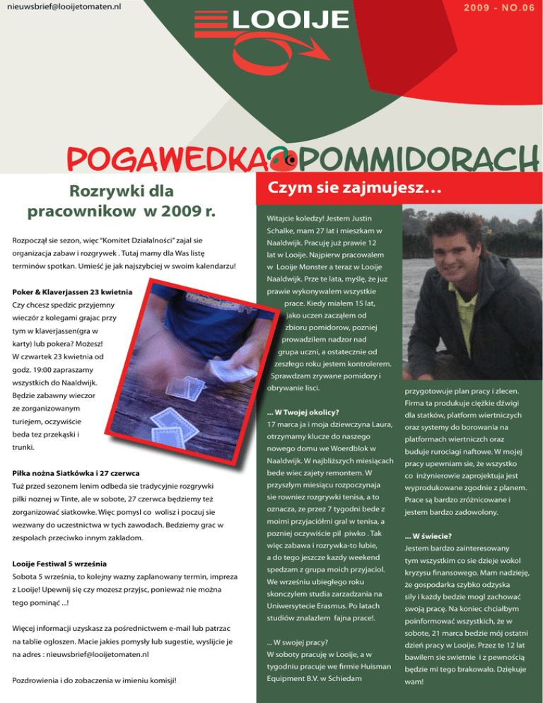 [email protected] 20 0 9 - n o . 0 6 pogawedka pommidorach Rozrywki dla pracownikow w 2009 r. Czym sie zajmujesz… Witajcie koledzy! Jestem Justin Schalke, mam 27 lat i mieszkam w Rozpoczął sie sezon, więc “Komitet Działalności” zajal sie Naaldwijk. Pracuję już prawie 12 organizacja zabaw i rozgrywek . Tutaj mamy dla Was listę lat w Looije. Najpierw pracowalem terminów spotkan. Umieść je jak najszybciej w swoim kalendarzu! w Looije Monster a teraz w Looije Naaldwijk. Prze te lata, myślę, że juz Poker & Klaverjassen 23 kwietnia Czy chcesz spedzic przyjemny prawie wykonywalem wszystkie prace. Kiedy miałem 15 lat, wieczór z kolegami grajac przy jako uczen zacząłem od tym w klaverjassen(gra w zbioru pomidorow, pozniej karty) lub pokera? Możesz! W czwartek 23 kwietnia od godz. 19:00 zapraszamy wszystkich do Naaldwijk. Będzie zabawny wieczor prowadzilem nadzor nad grupa uczni, a ostatecznie od zeszłego roku jestem kontrolerem. Sprawdzam zrywane pomidory i obrywanie lisci. przygotowuje plan pracy i zlecen. Firma ta produkuje ciężkie dźwigi ze zorganizowanym ... W Twojej okolicy? turiejem, oczywiście 17 marca ja i moja dziewczyna Laura, beda tez przekąski i oraz systemy do borowania na otrzymamy klucze do naszego trunki. platformach wiertniczch oraz nowego domu we Woerdblok w buduje rurociagi naftowe. W mojej Naaldwijk. W najbliższych miesiącach pracy upewniam sie, że wszystko Piłka nożna Siatkówka i 27 czerwca bede wiec zajety remontem. W co inżynierowie zaprojektuja jest Tuż przed sezonem lenim odbeda sie tradycyjnie rozgrywki przyszlym miesiącu rozpoczynaja wyprodukowane zgodnie z planem. pilki noznej w Tinte, ale w sobote, 27 czerwca będziemy też sie rowniez rozgrywki tenisa, a to Prace są bardzo zróżnicowane i zorganizować siatkowke. Więc pomysl co wolisz i poczuj sie oznacza, ze przez 7 tygodni bede z jestem bardzo zadowolony. wezwany do uczestnictwa w tych zawodach. Bedziemy grac w zespolach przeciwko innym zakladom. Looije Festiwal 5 września Sobota 5 września, to kolejny wazny zaplanowany termin, impreza z Looije! Upewnij się czy mozesz przyjsc, ponieważ nie można tego pominąć ...! dla statków, platform wiertniczych moimi przyjaciółmi gral w tenisa, a pozniej oczywiście pil piwko . Tak ... W świecie? więc zabawa i rozrywka-to lubie, Jestem bardzo zainteresowany a do tego jeszcze kazdy weekend tym wszystkim co sie dzieje wokol spedzam z grupa moich przyjaciol. kryzysu finansowego. Mam nadzieję, We wrześniu ubiegłego roku że gospodarka szybko odzyska skonczylem studia zarzadzania na sily i każdy bedzie mogl zachować Uniwersytecie Erasmus. Po latach swoją pracę. Na koniec chciałbym studiów znalazlem fajna prace!. poinformować wszystkich, że w Więcej informacji uzyskasz za pośrednictwem e-mail lub patrzac sobote, 21 marca bedzie mój ostatni na tablie ogloszen. Macie jakies pomysły lub sugestie, wyslijcie je ... W swojej pracy? dzień pracy w Looije. Przez te 12 lat na adres : [email protected] W soboty pracuję w Looije, a w bawilem sie swietnie i z pewnością tygodniu pracuje we firmie Huisman będzie mi tego brakowało. Dziękuje Equipment B.V. w Schiedam wam! Pozdrowienia i do zobaczenia w imieniu komisji!