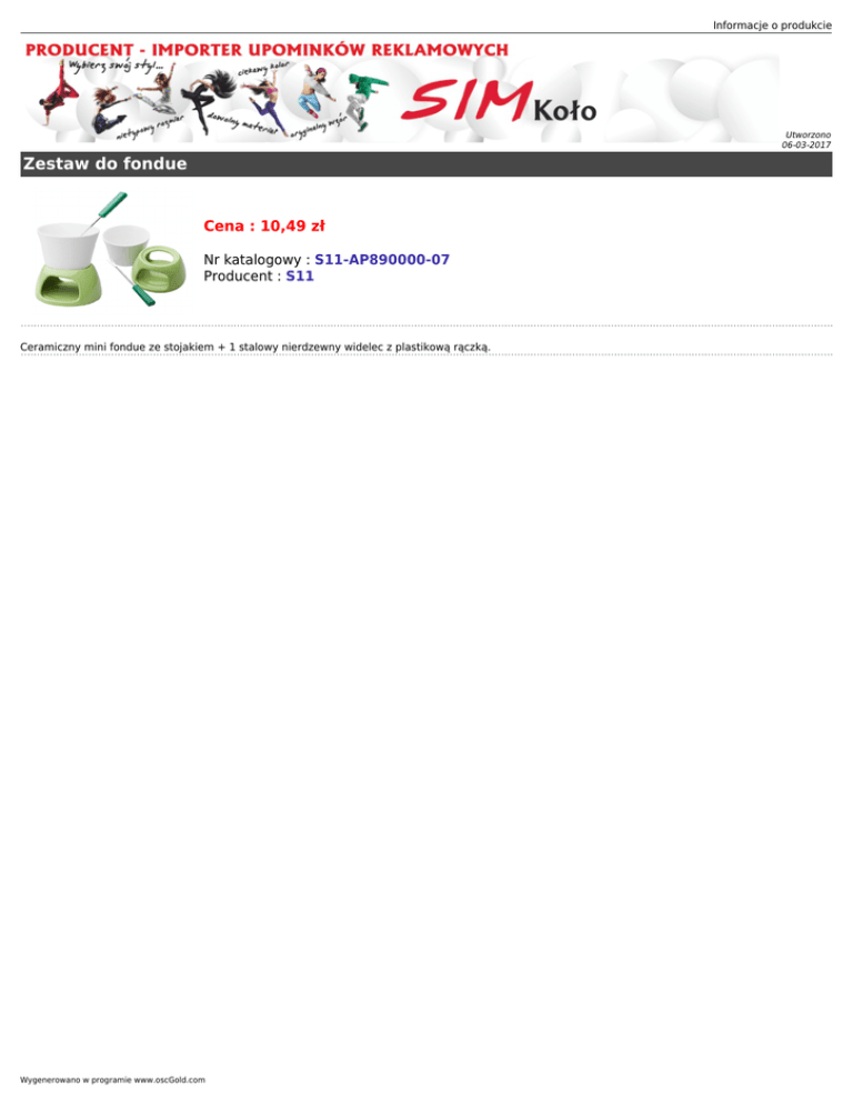 Informacje o produkcie Utworzono 06-03-2017 Zestaw do fondue Cena : 10,49 zł Nr katalogowy : S11-AP890000-07 Producent : S11 Ceramiczny mini fondue ze stojakiem + 1 stalowy nierdzewny widelec z plastikową rączką. Wygenerowano w programie www.oscGold.com
