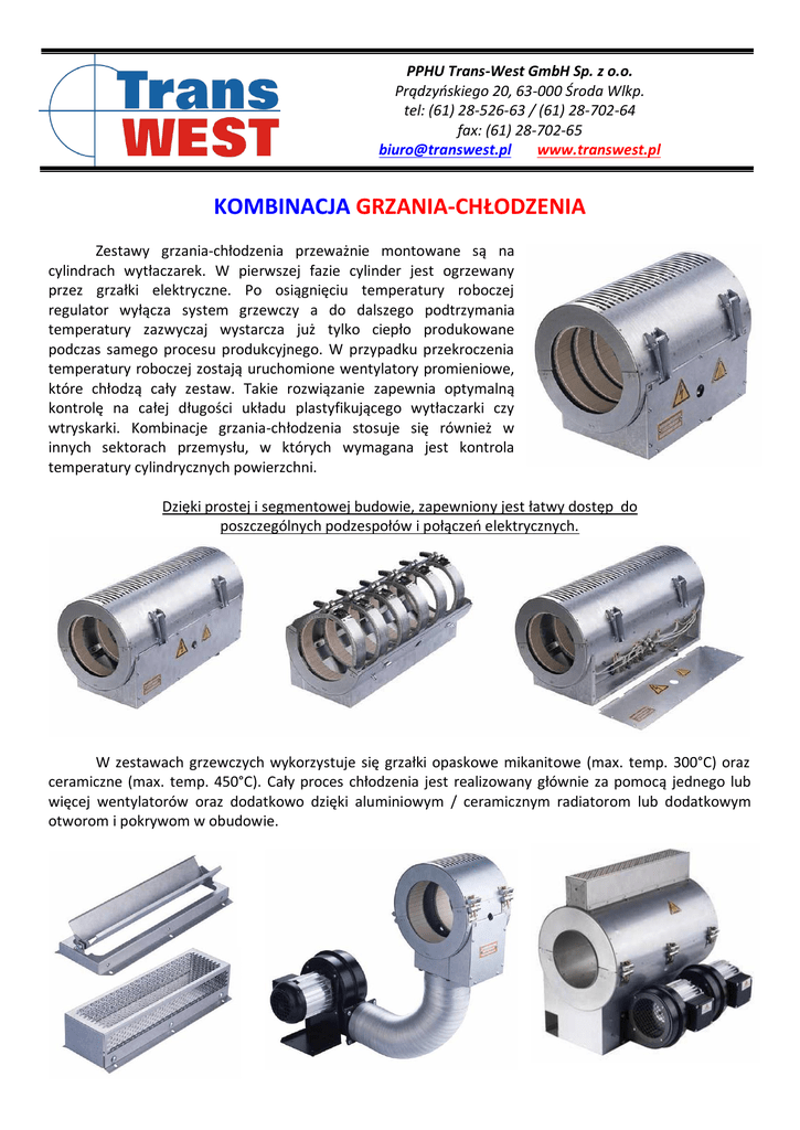 PPHU Trans-West GmbH Sp. z o.o. Prądzyńskiego 20, 63-000 Środa Wlkp. tel: (61) 28-526-63 / (61) 28-702-64 fax: (61) 28-702-65 [email protected] www.transwest.pl KOMBINACJA GRZANIA-CHŁODZENIA Zestawy grzania-chłodzenia przeważnie montowane są na cylindrach wytłaczarek. W pierwszej fazie cylinder jest ogrzewany przez grzałki elektryczne. Po osiągnięciu temperatury roboczej regulator wyłącza system grzewczy a do dalszego podtrzymania temperatury zazwyczaj wystarcza już tylko ciepło produkowane podczas samego procesu produkcyjnego. W przypadku przekroczenia temperatury roboczej zostają uruchomione wentylatory promieniowe, które chłodzą cały zestaw. Takie rozwiązanie zapewnia optymalną kontrolę na całej długości układu plastyfikującego wytłaczarki czy wtryskarki. Kombinacje grzania-chłodzenia stosuje się również w innych sektorach przemysłu, w których wymagana jest kontrola temperatury cylindrycznych powierzchni. Dzięki prostej i segmentowej budowie, zapewniony jest łatwy dostęp do poszczególnych podzespołów i połączeń elektrycznych. W zestawach grzewczych wykorzystuje się grzałki opaskowe mikanitowe (max. temp. 300°C) oraz ceramiczne (max. temp. 450°C). Cały proces chłodzenia jest realizowany głównie za pomocą jednego lub więcej wentylatorów oraz dodatkowo dzięki aluminiowym / ceramicznym radiatorom lub dodatkowym otworom i pokrywom w obudowie. W porównaniu z klasycznymi zespołami chłodzącymi przy pomocy cieczy takich jak woda czy olej, chłodzenie za pomocą powietrza jest bardziej efektywne. Konstrukcja układu jest dużo prostsza, nie wymaga wykonania odlewanych podzespołów oraz przede wszystkim nie występują wycieki ze względu na brak płynnego medium chłodzącego. W przypadku kiedy musimy zwiększyć intensywność chłodzenia możemy zastosować dodatkowe elastyczne radiatory wykonane z aluminium montowane między grzałkami bądź radiatory, które mocuje się bezpośrednio na grzałki ceramiczne. W naszej ofercie znajduje się również specjalna wersja zestawu, która posiada druty grzewcze poprowadzone wewnątrz ceramicznych żeber chłodzących. Dzięki takiemu rozwiązaniu znacznie zwiększona zostaje wydajność procesu chłodzenia. Standardowe modele dostępne są w szerokościach 20, 48 i 63 mm a min. średnica osadzenia to 60 mm. Poza szeroką gamą standardowych rozwiązań oferujemy wszelkie zestawy specjalnie dostosowane do potrzeb klienta. W CELU ZAPOZNANIA SIĘ Z PEŁNYM ASORTYMENTEM SERDECZNIE ZAPRASZAMY NA NASZĄ STRONĘ INTERNETOWĄ: www.transwest.pl ZAPYTANIA OFERTOWE PROSIMY KIEROWAĆ NA: [email protected]